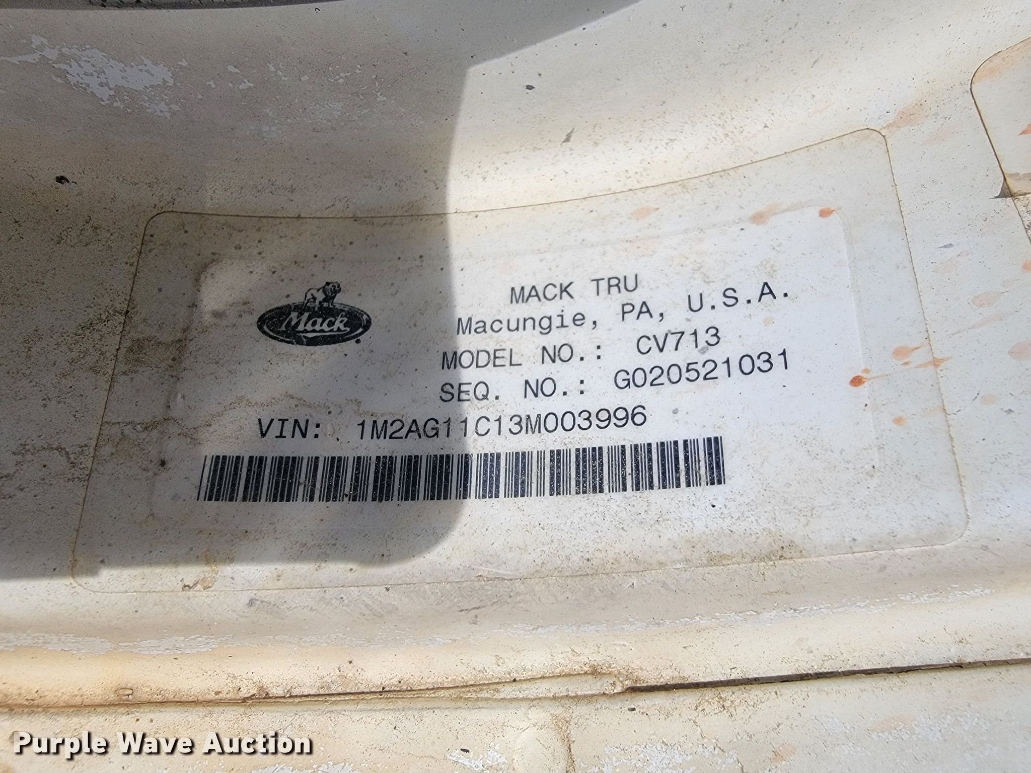 2003 Mack CV713 ready mix truck. 372,983 miles on odometer, Engine hours: 26,779. Engine Mack, Displacement: 12.0L, Cylinders: 6, Fuel type: Diesel. Transmission Eaton Fuller, Manual, Speed: 10. Chassis Axles: Triple, Tag axle, Differential lock: Inter-axle, Suspension: Camelback, Brakes: Air, PTO, Front mount PTO, Wheelbase: 216". Interior AC, Heat. Operational Mixer Mcneilus, Discharge: Rear, Bins: Aggregate, In-cab controls, Rear drum controls, Water tank capacity: 150 gallons, Chute Extensions: 4, Chute type: Aluminum.. Tires Front: 335/65R22.5, Rear: 11R22.5. Notes Dash warning indicator: ABS. Arkansas title. 1M2AG11C13M003996. Atlas Asphalt Inc.. 1653 Batesville Blvd. Batesville, AR 72501