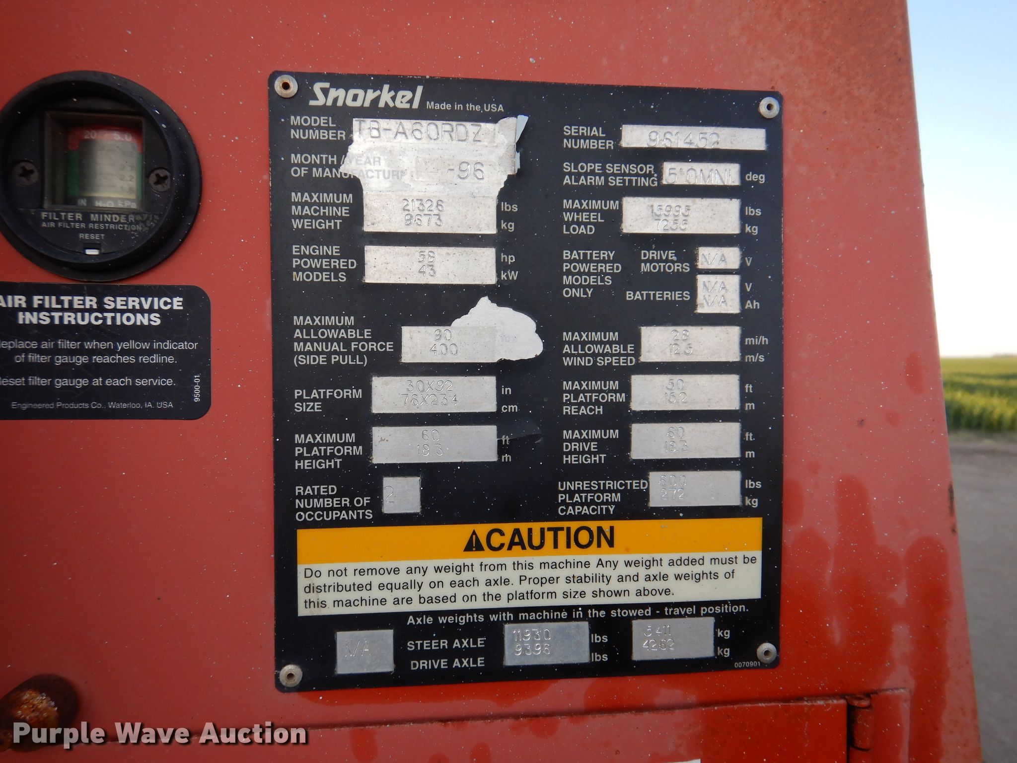 1996 Snorkel TB-A60RDZ boom lift has sold in Fullerton, North Dakota for $5500. Item IQ9671 sold on July 29th, 2021.