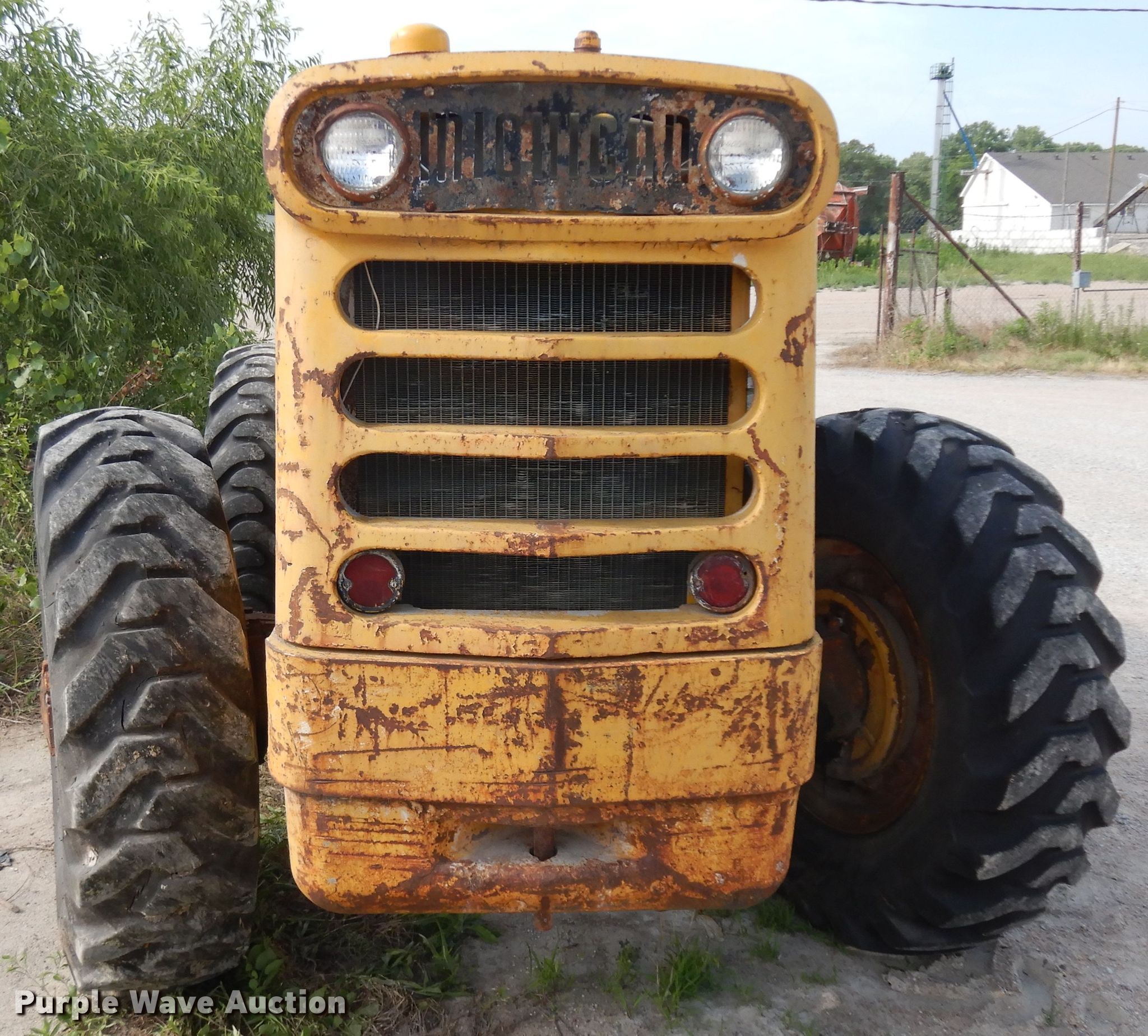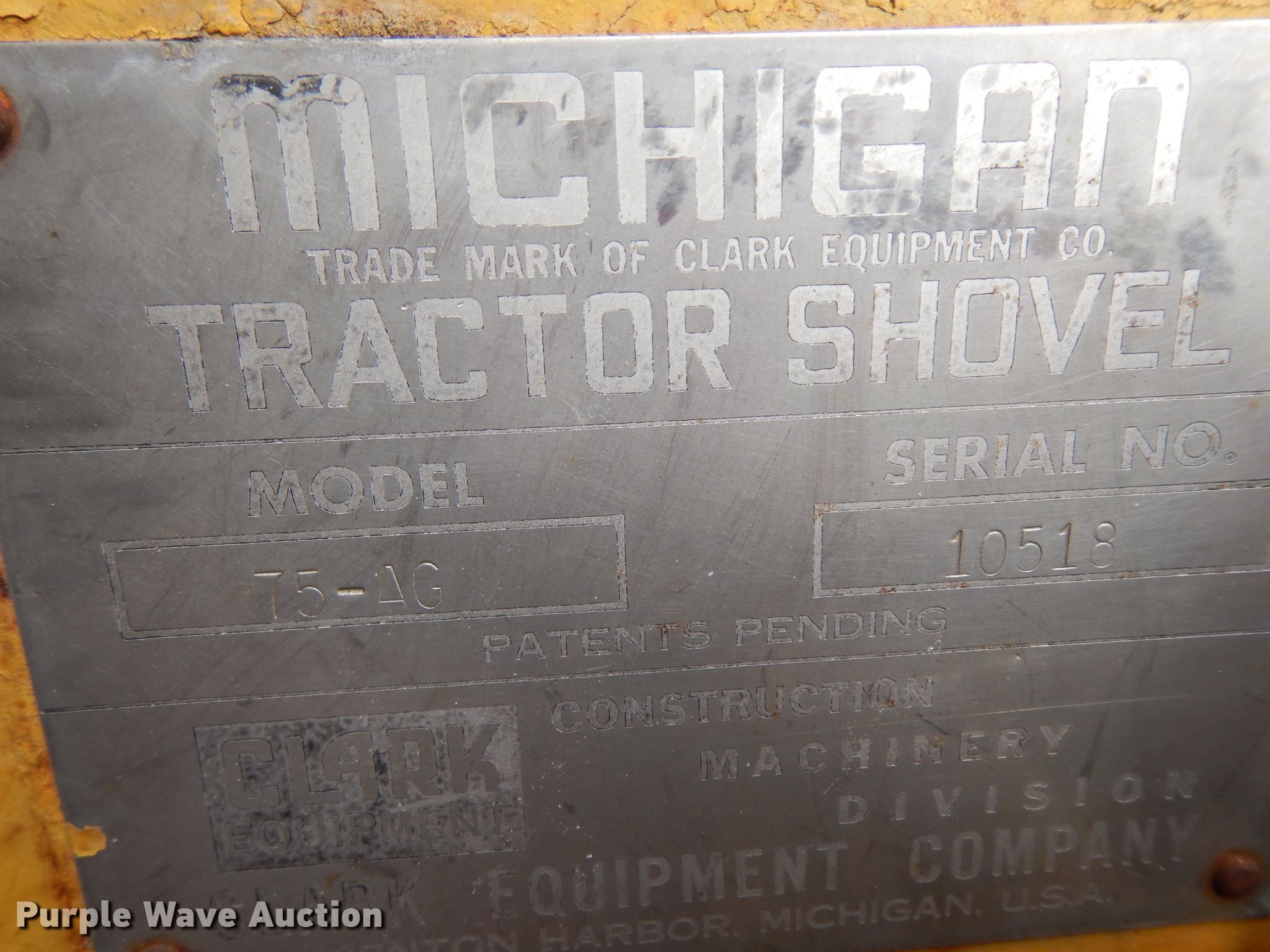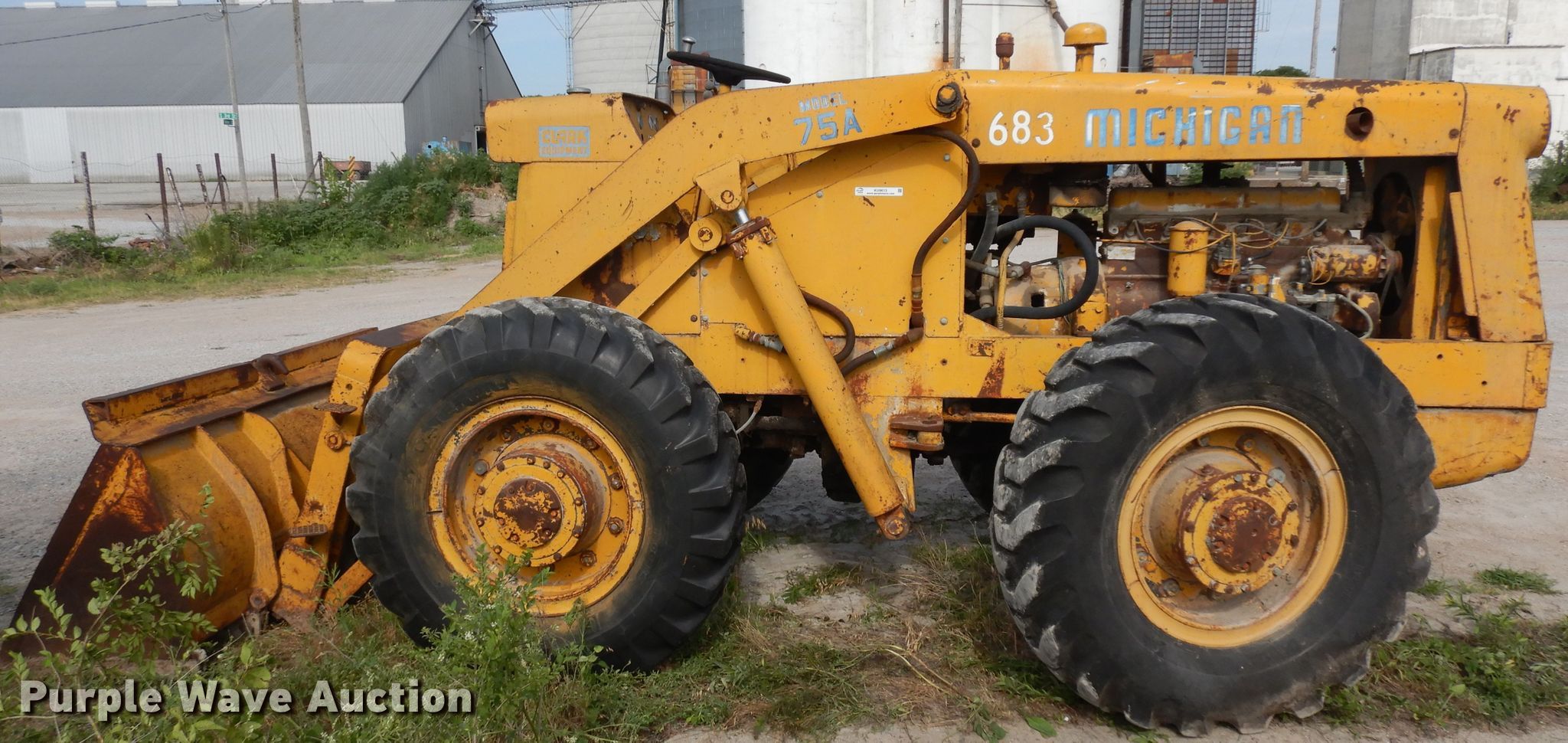 Michigan 75A wheel loader. Unknown miles on odometer, Serial: 10518. Engine Waukesha, Cylinders: 6, Fuel type: Gas. Transmission Two speed travel. Operators station Bucket controls: Two-lever. Operational Bucket Width: 78". Tires Size: 13.00-24. Notes Non-operational unit. Constructors, Inc.. Beatrice, NE 68381