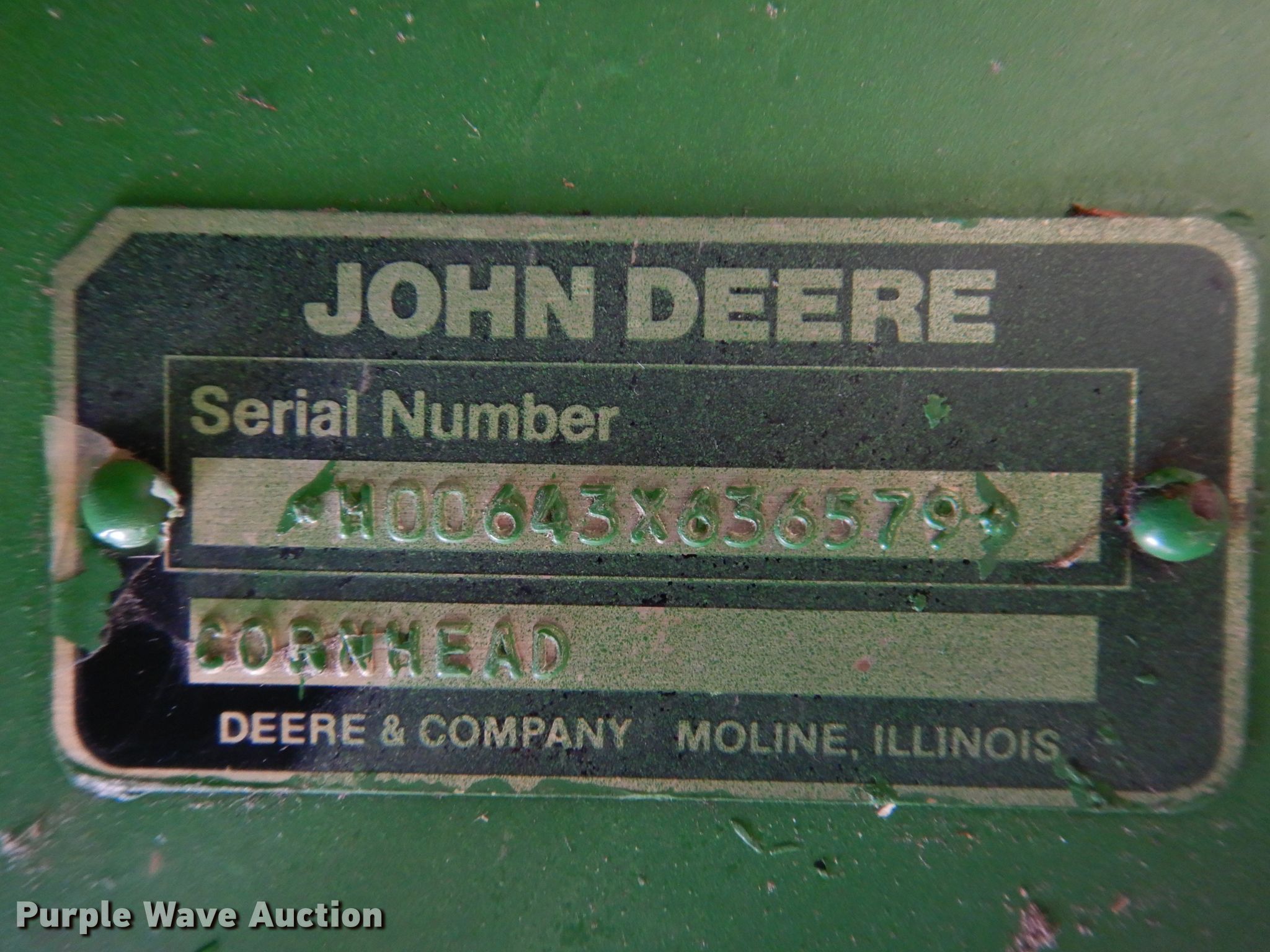 John Deere 643 corn head. Serial: 636579. Operational Rows: 6, Row spacing: 30", Hydraulic deck plates, Drivelines: Dual. Notes Trailer included, but is not road worthy. 4516 190th St. Estherville, IA 51334