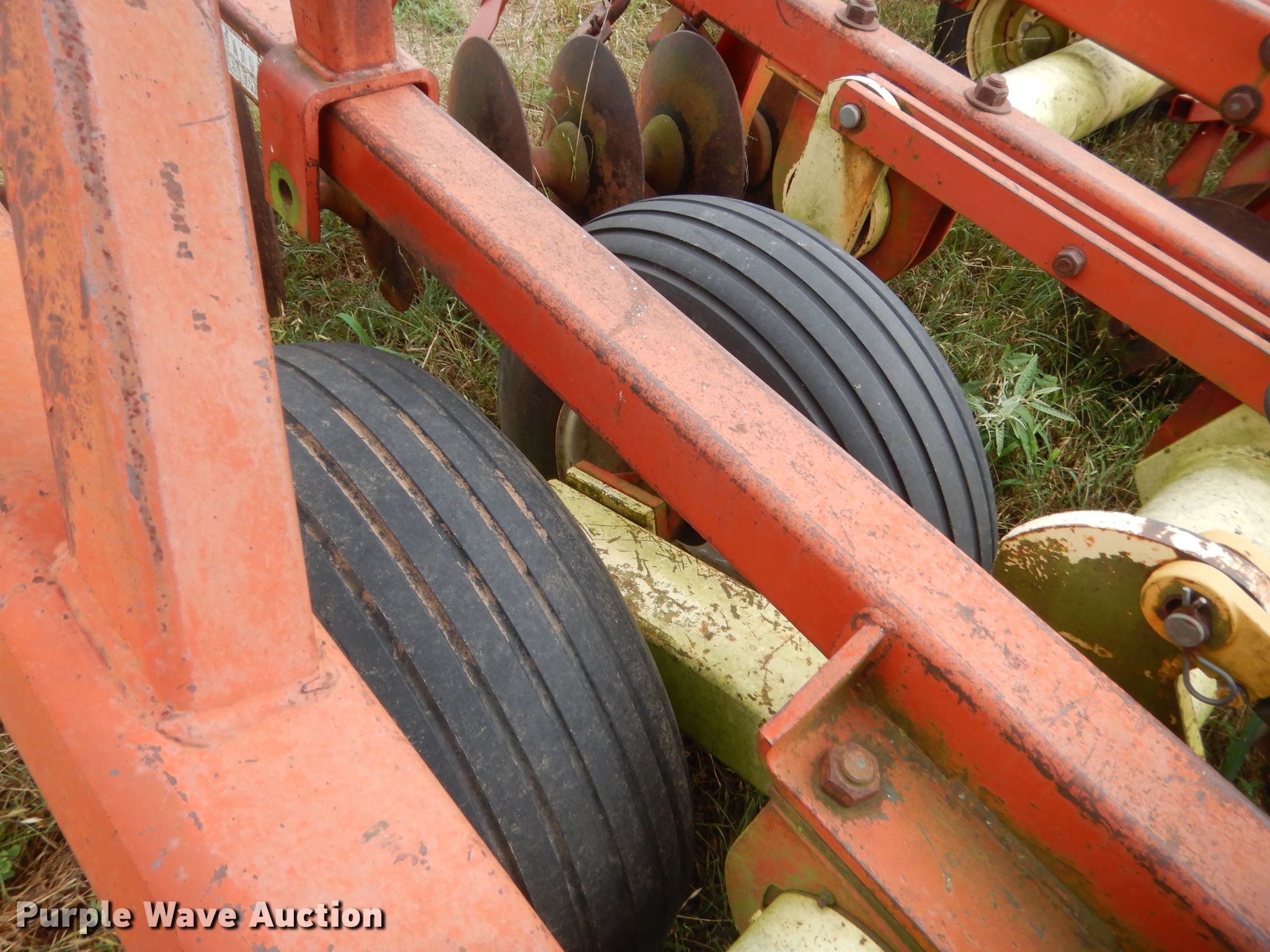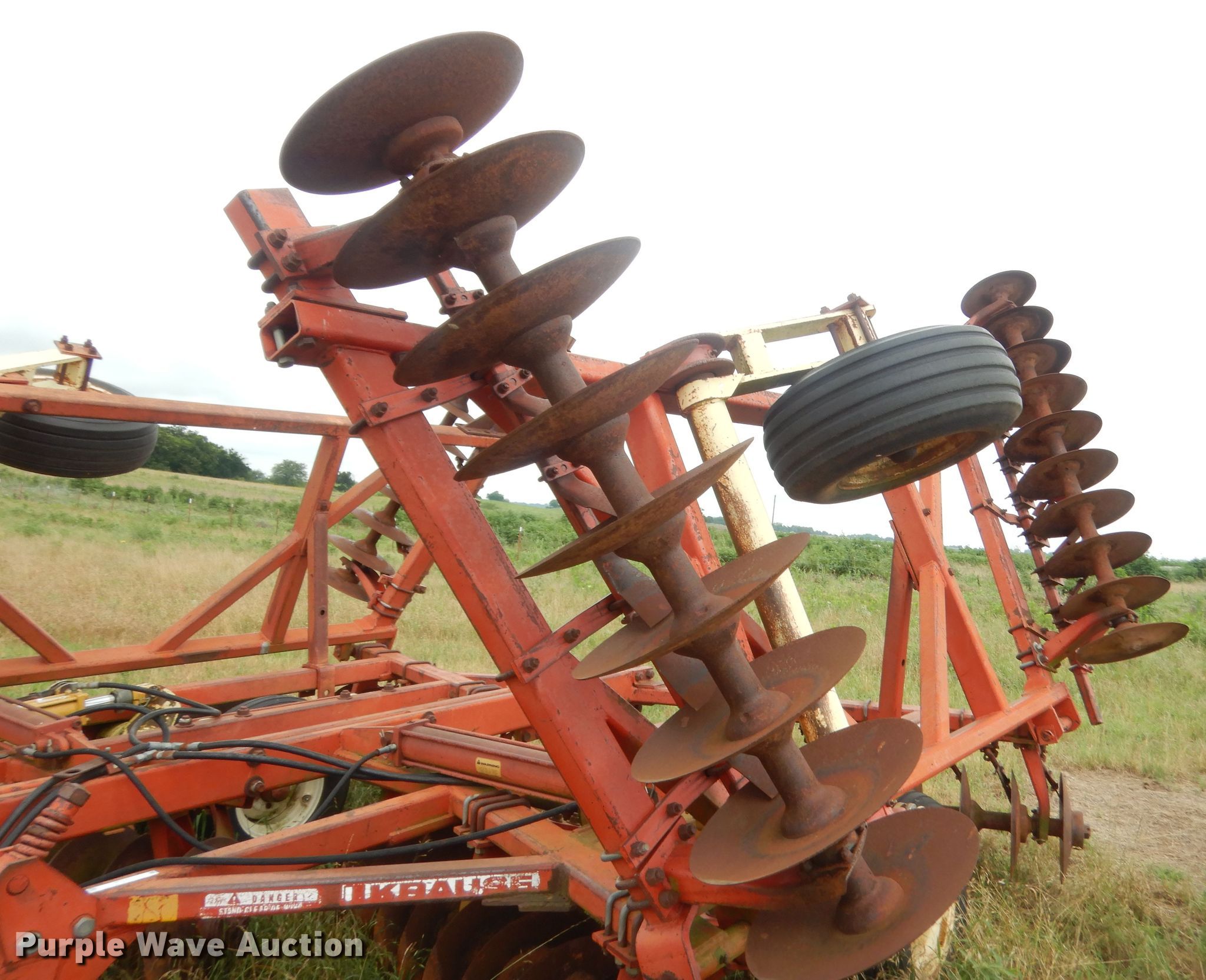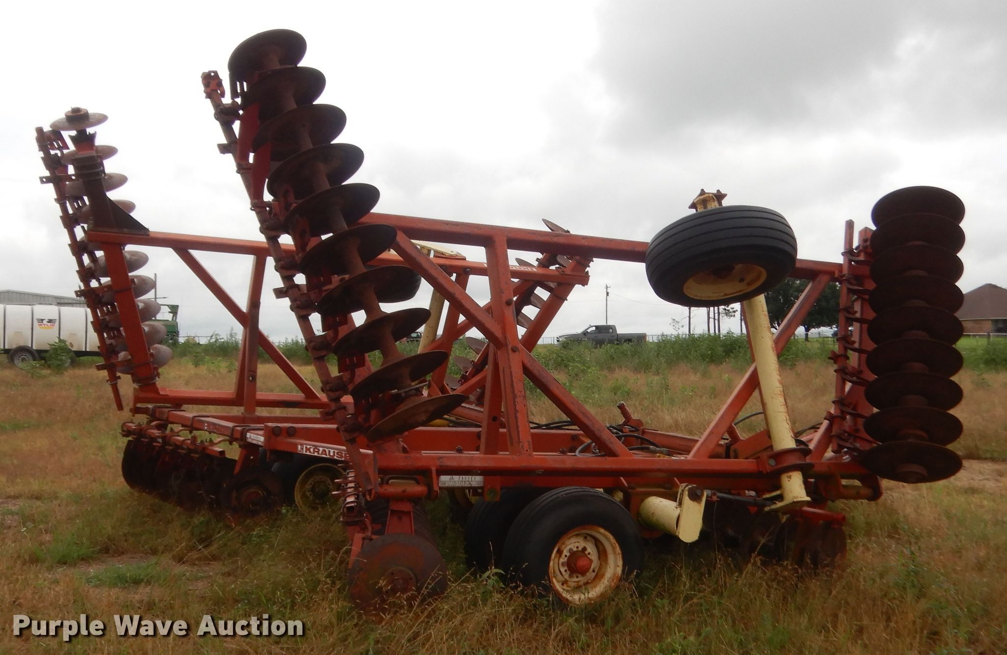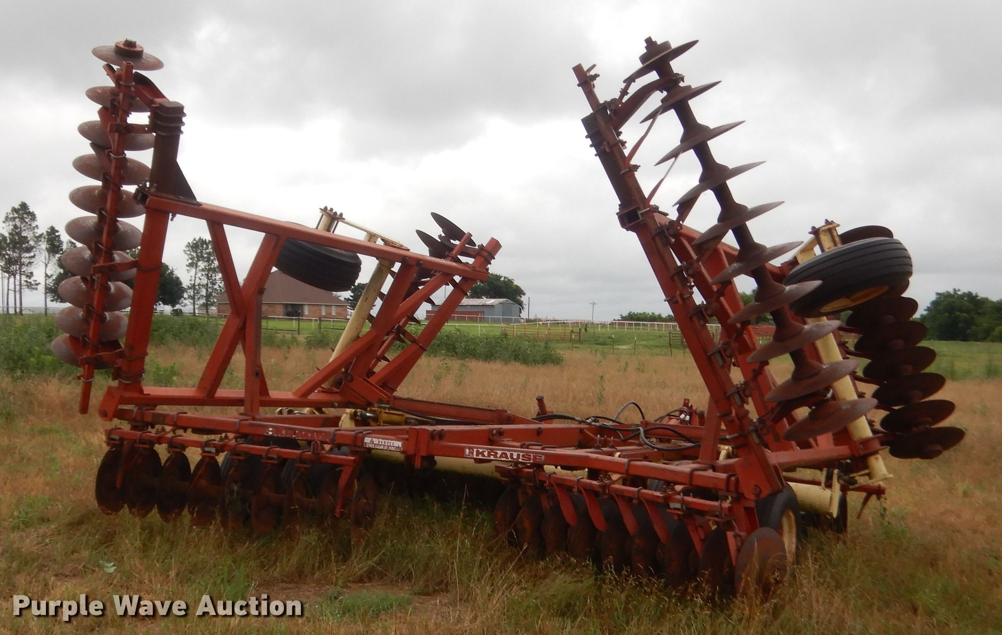 Krause 1955 off-set disk. Overall width: 28', Serial: 2511. Operational Front blades Diameter: 19", Rear blades Diameter: 19", Operation Hydraulic lift, Hydraulic fold. Tires Tire size: 11L-15SL. Slatten Land and Cattle Co, LLC. Lexington, OK 73051