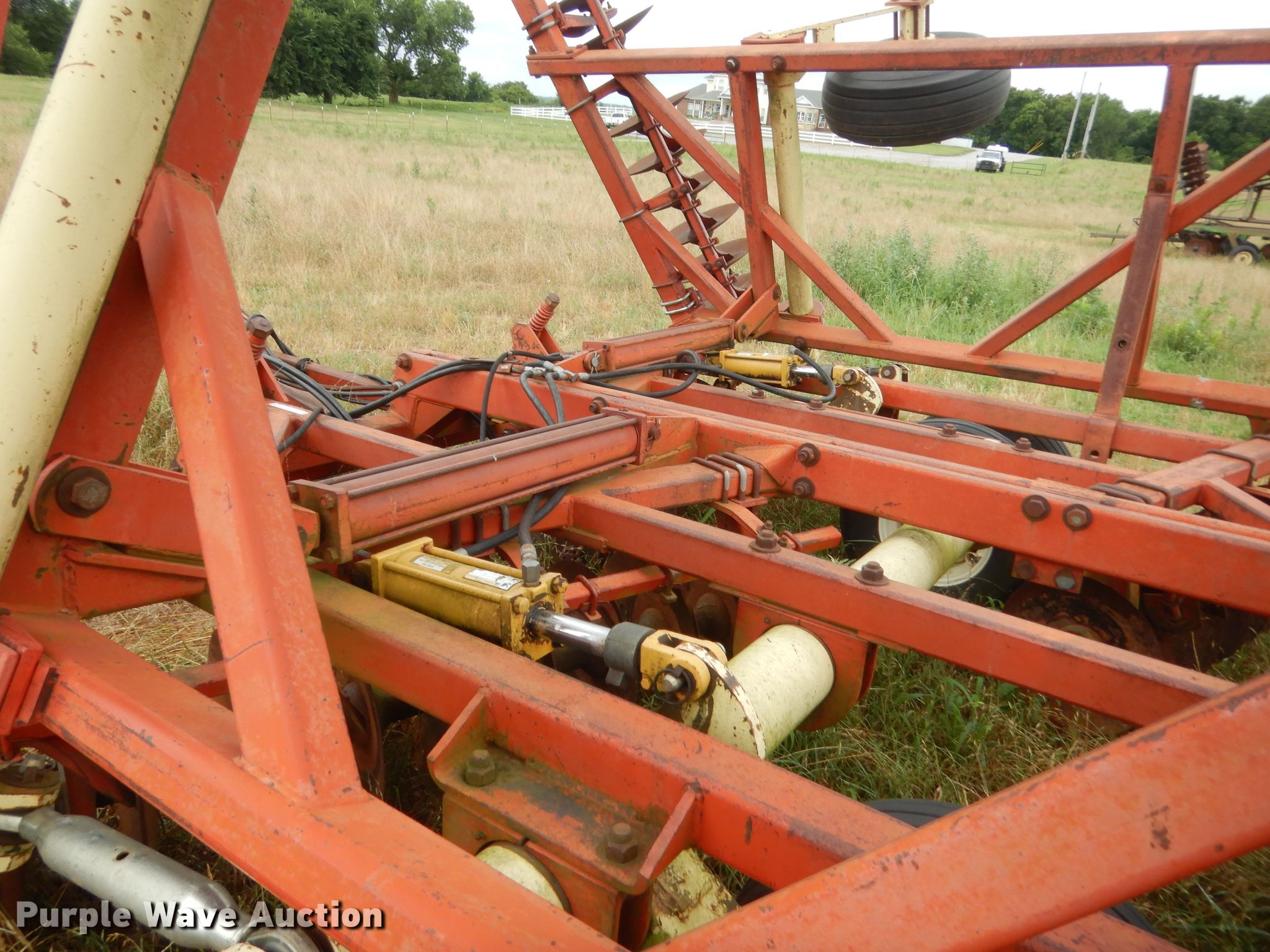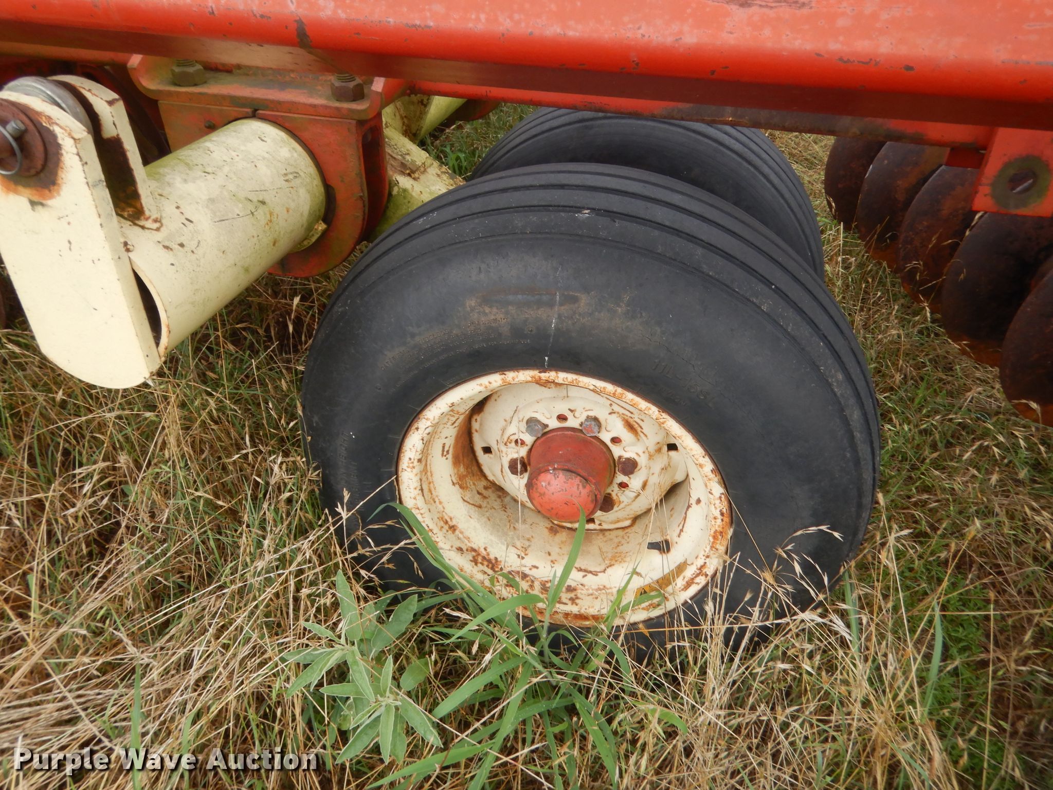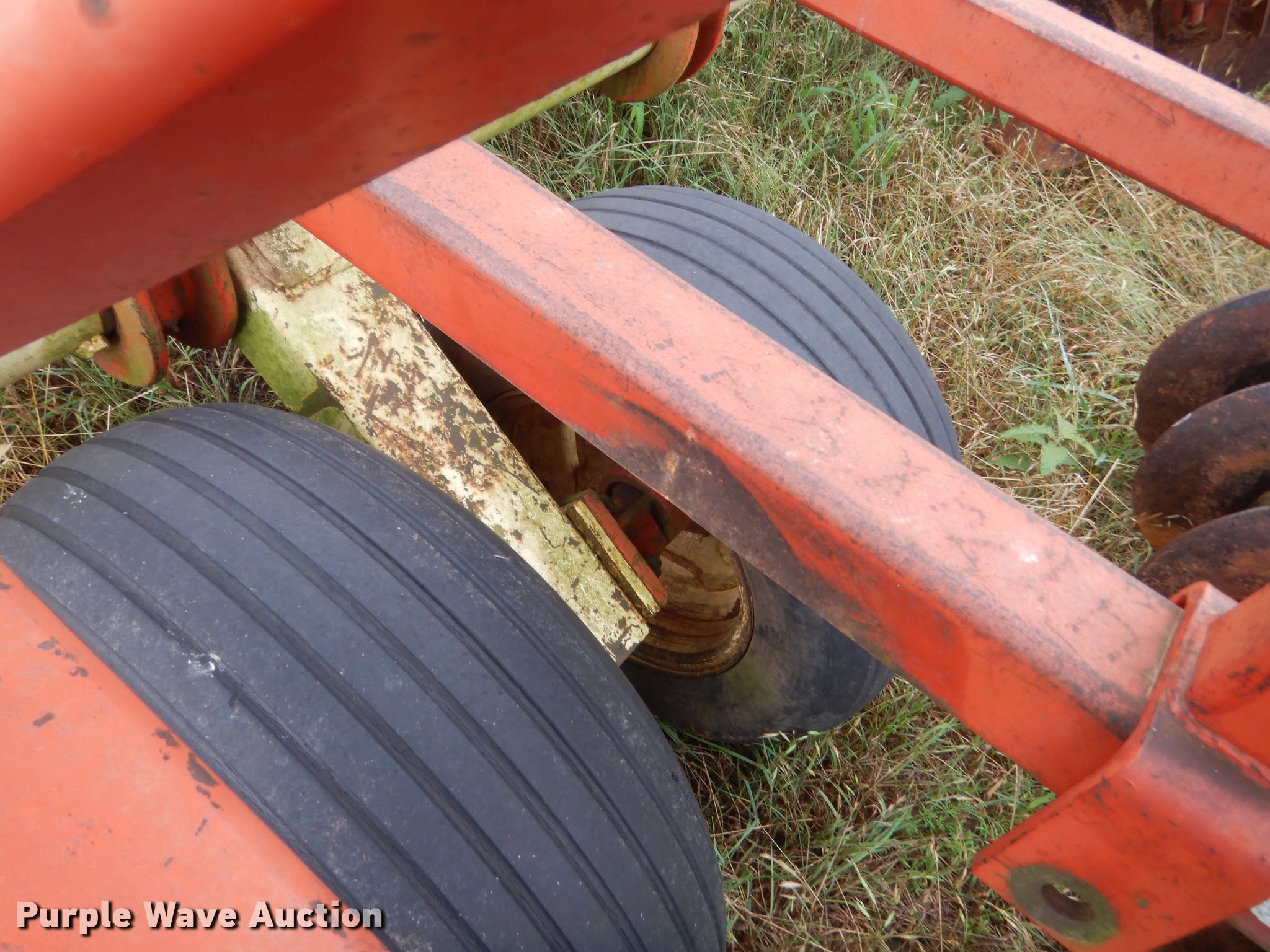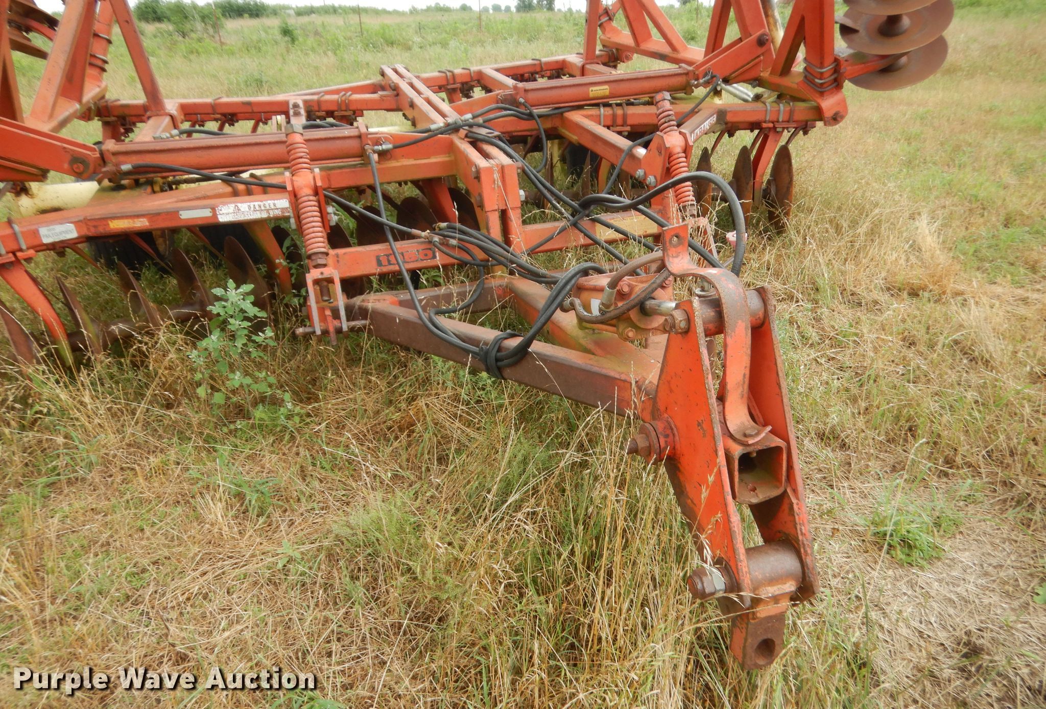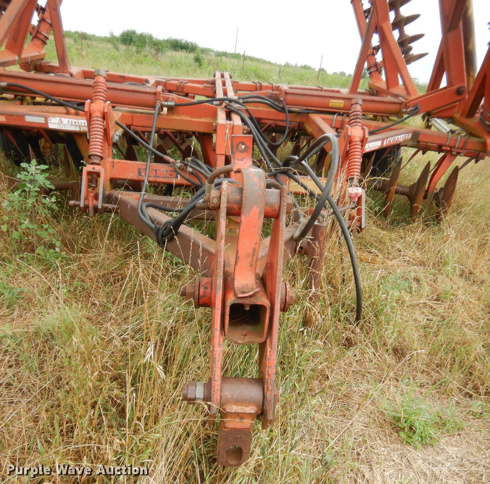 Krause 1955 off-set disk. Overall width: 28', Serial: 2511. Operational Front blades Diameter: 19", Rear blades Diameter: 19", Operation Hydraulic lift, Hydraulic fold. Tires Tire size: 11L-15SL. Slatten Land and Cattle Co, LLC. Lexington, OK 73051
