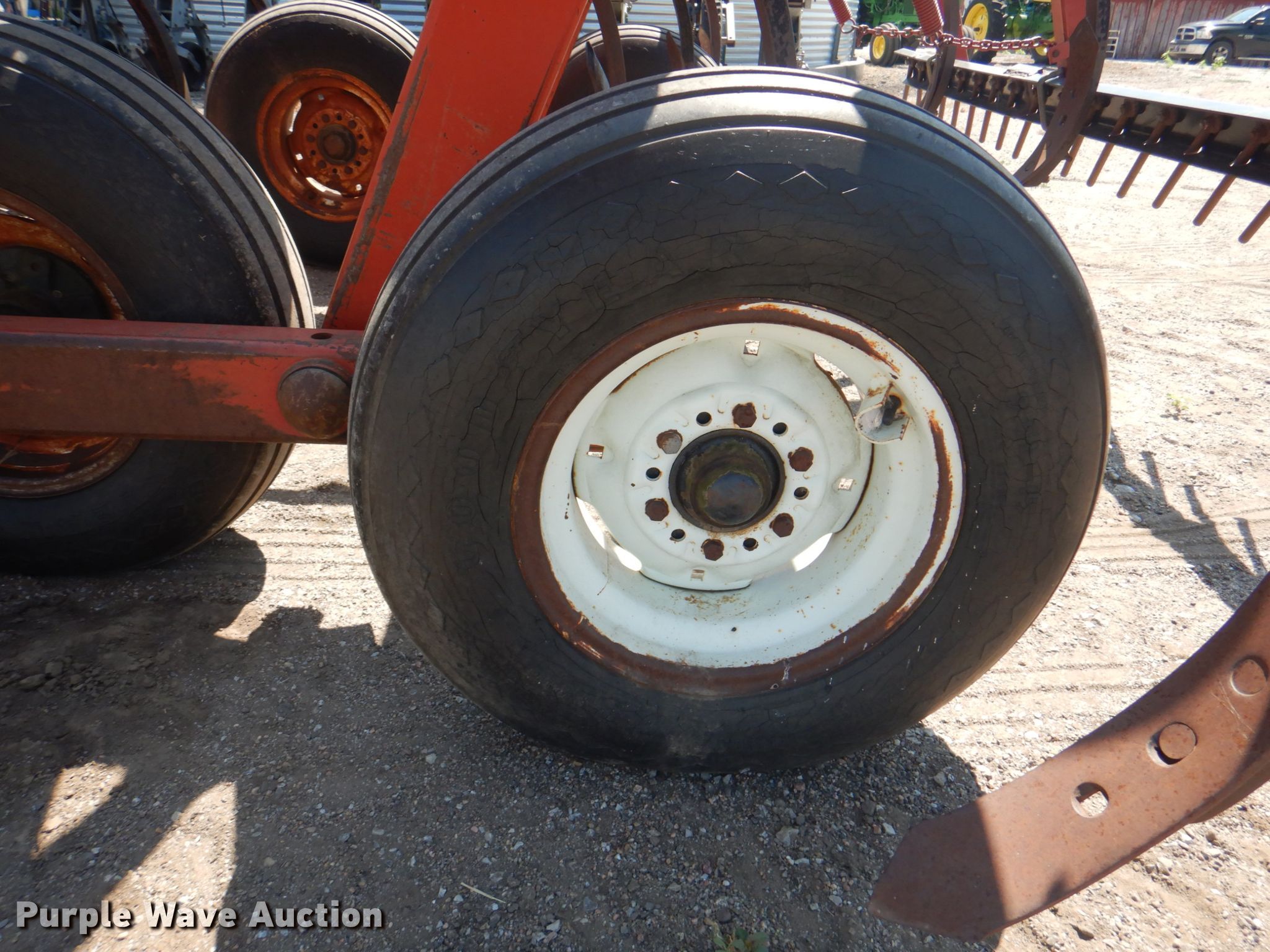White 435 disk chisel. Overall width: 12' 6", Serial: 5749. Operational Shanks: 9, Sweep width: 3", Blade diameter Front: 21", Spacing: 11", Attachments Spike tooth harrow Harrow bars: 1.. Tires Tire size: 9.5-15. 6136 Rd D. Chester, NE 68327