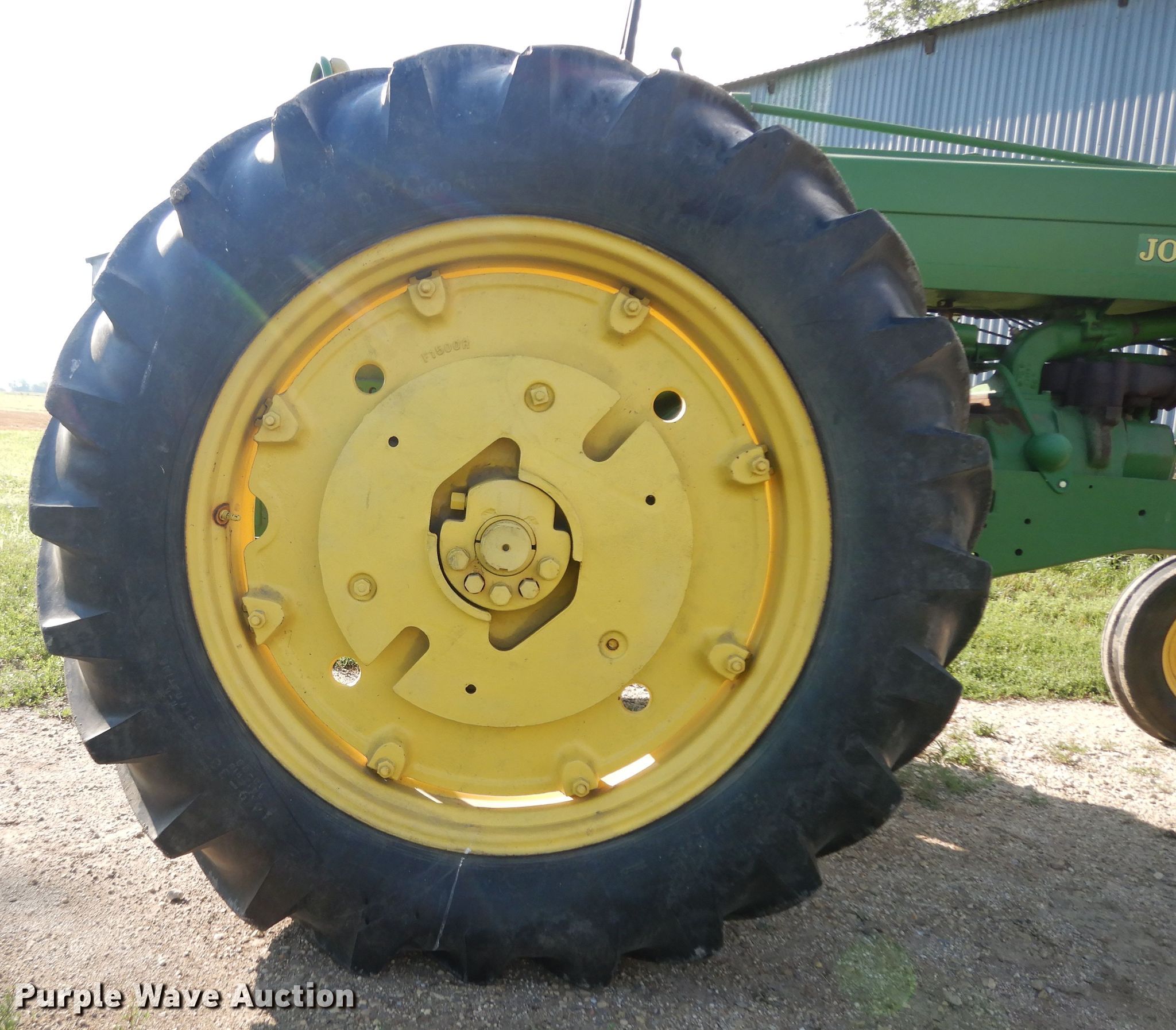 John Deere 70 tractor. Serial: 7005828. Engine Cylinders: 2, Fuel type: Gas. Transmission Manual, 6F - 1R. Operational PTO: 540, Three point Top link, Hydraulic remote sets Rear: 1. Tires Front: 6.00-16, Rear: 14.9-38. Hillsboro, KS 67063