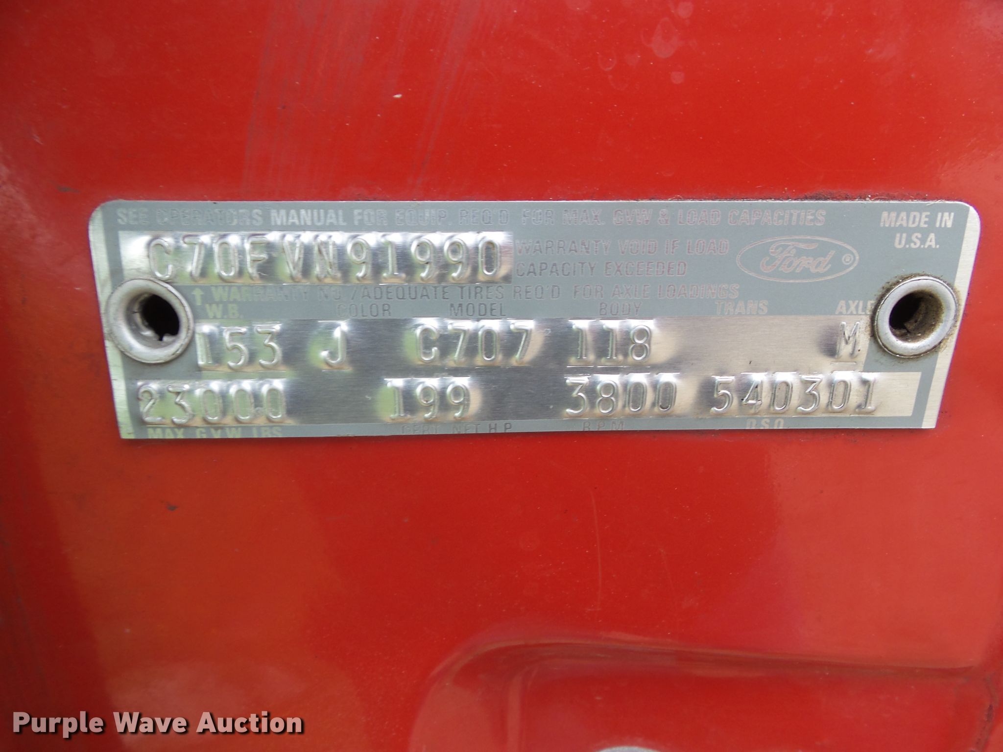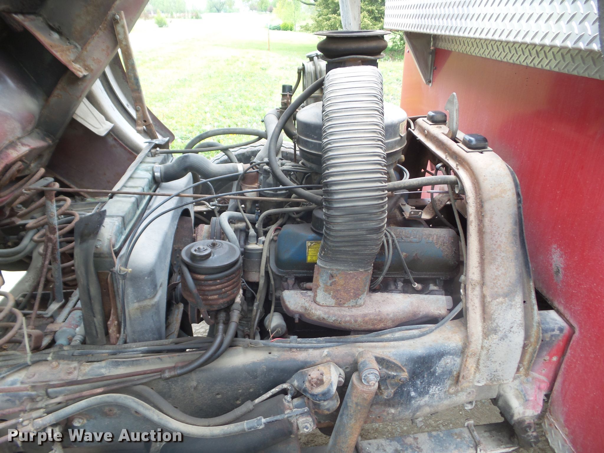 1972 Ford C707 pumper fire truck. 15,079 miles on odometer. Engine Displacement: 391 C.I.D., Cylinders: 8, Fuel type: Gas. Transmission Manual, Speed: 5. Chassis Axles: Single, Suspension: Spring, Brakes: Hydraulic, GVWR: 23,000 lbs, Wheelbase: 153". Interior Heat. Operational Fire truck body Pump 750 gpm.. Tires Size: 9.00-20. Notes Brake issues, vehicle must be towed or hauled, Unknown operating condition of the pump. Iowa title. C70FVN91990. Winterset Fireman's Association. 2081 226th Ct. Winterset, IA 50273