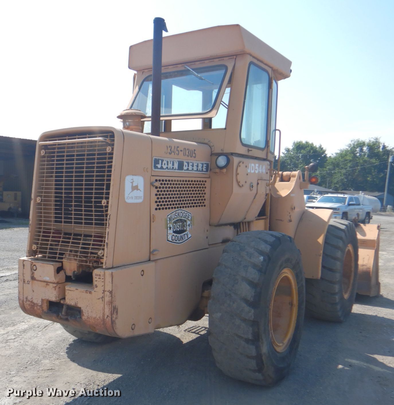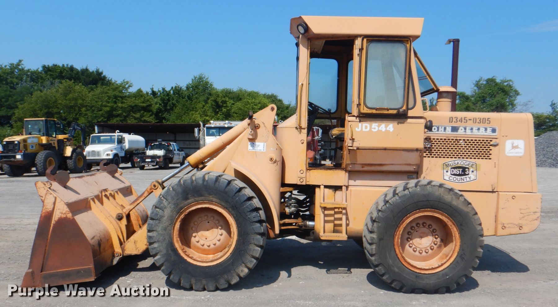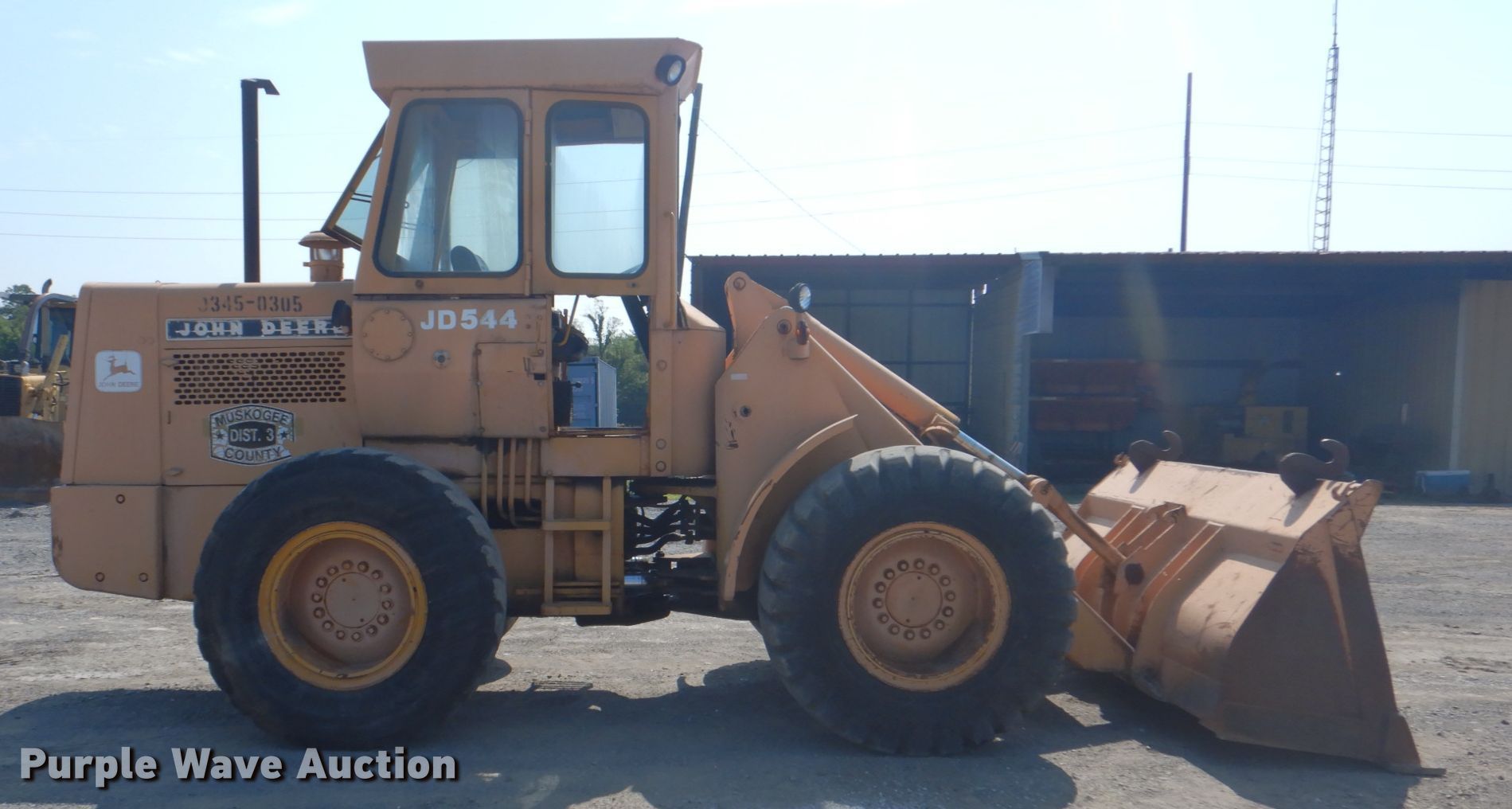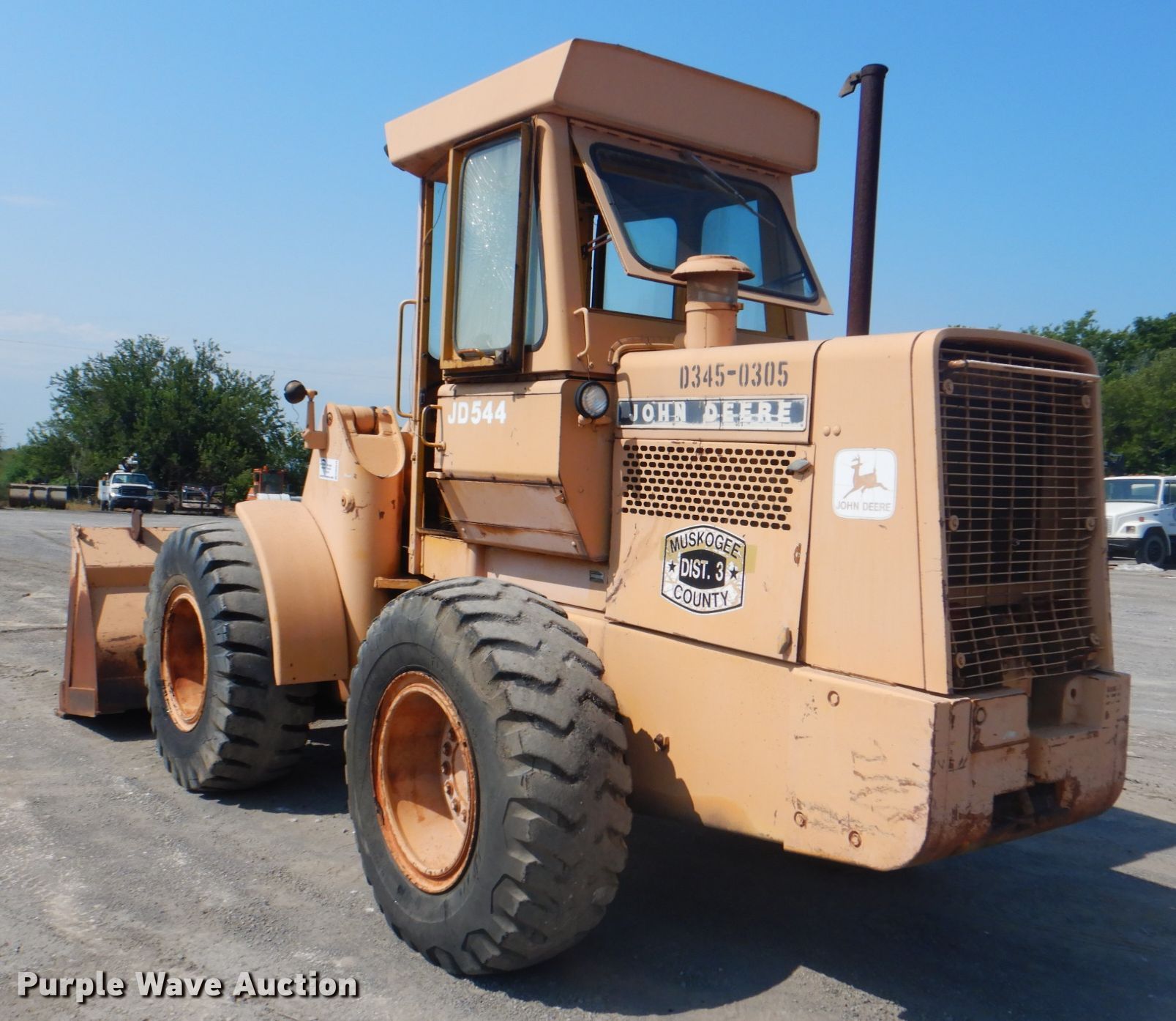 1976 John Deere 544B wheel loader. 6,795 hours on meter, Serial: 247981. Engine John Deere, Displacement: 6.8L, Cylinders: 6, Fuel type: Diesel. Transmission Powershift, 4F - 2R. Operators station Enclosed cab, Bucket controls: Joystick. Operational Bucket John Deere, Width: 95", Cutting edge: Weld-on. Tires Size: 17.5-25. Notes Windshield chipped or cracked. Muskogee County D3. 901 S 74th St W. Muskogee, OK 74401