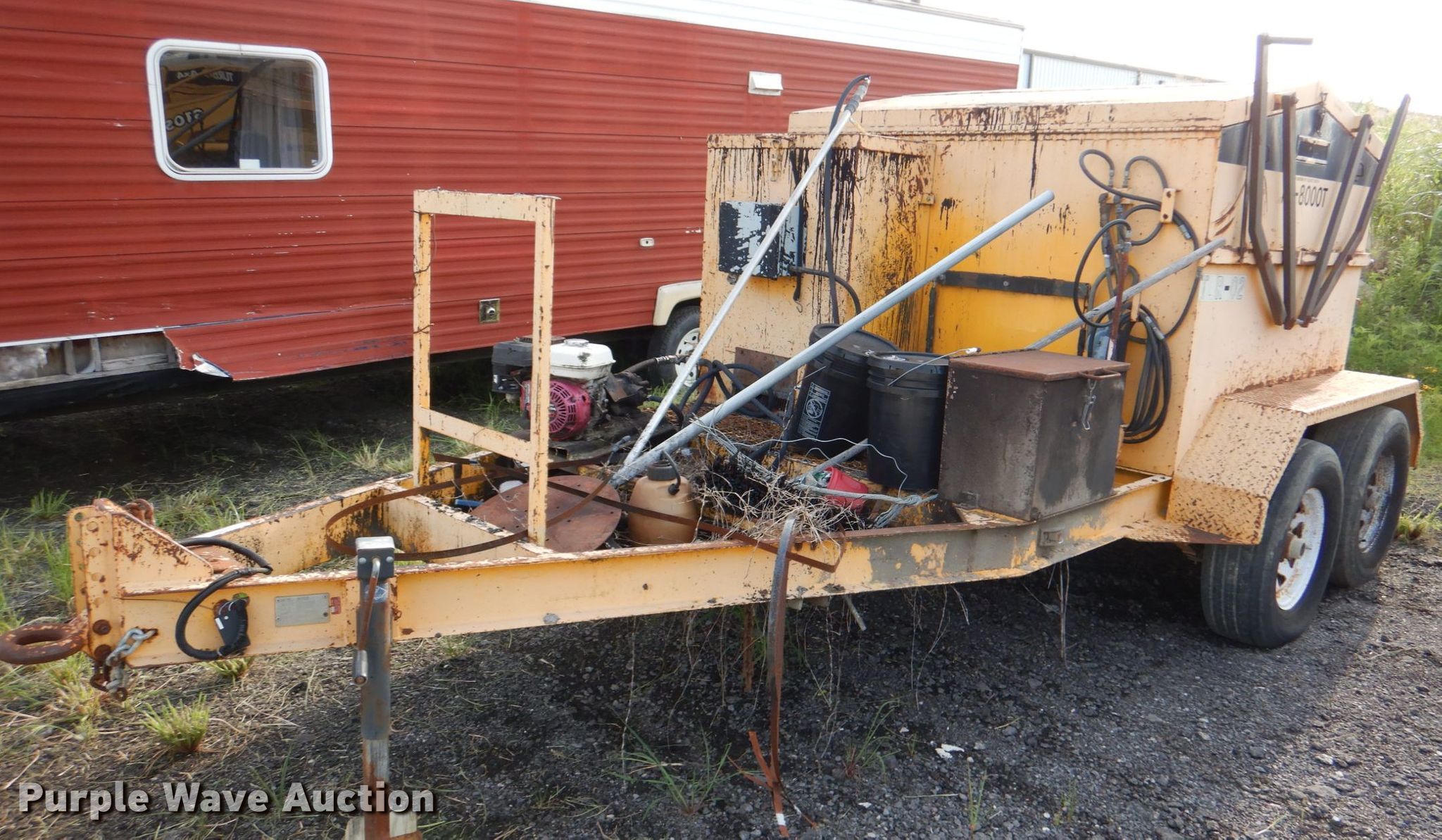 Purple Wave is selling a used Pot Hole Patcher in Oklahoma. This item is a KM International KM-800T asphalt recycler with the following: Serial: 0305100T, Honda GX120 single cylinder gas engine, 18'L x 96"W trailer, Tandem axle, Spring suspension, Electric brakes, Single leg manual landing gear, Pintle hitch, LT235/85R16 tires