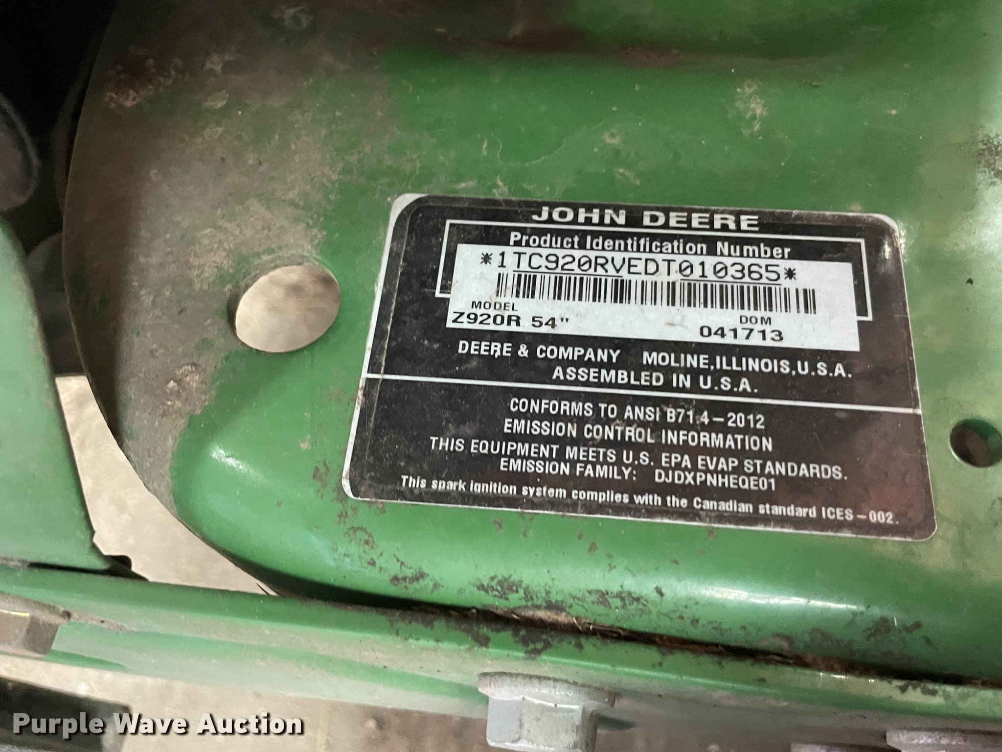 Purple Wave is selling a used Lawn Mower in Kansas. This item is a John Deere Z920R ZTR lawn mower with the following: 606 hours on meter, Cutting width: 58", Serial: 1TC920RVEDT010365