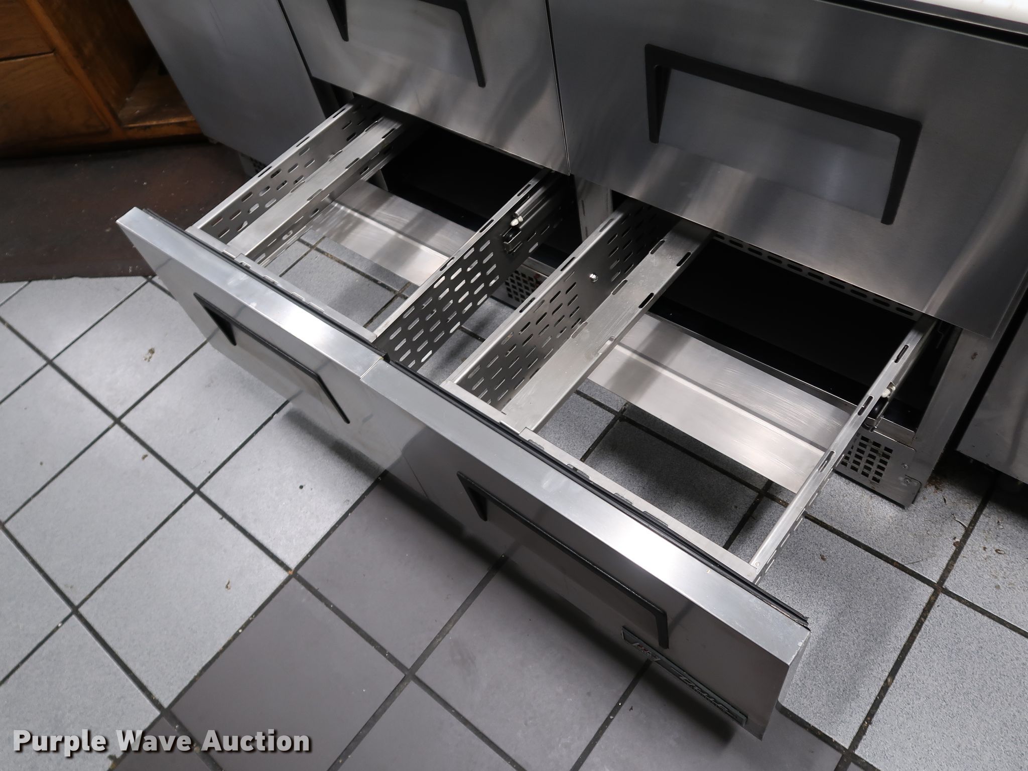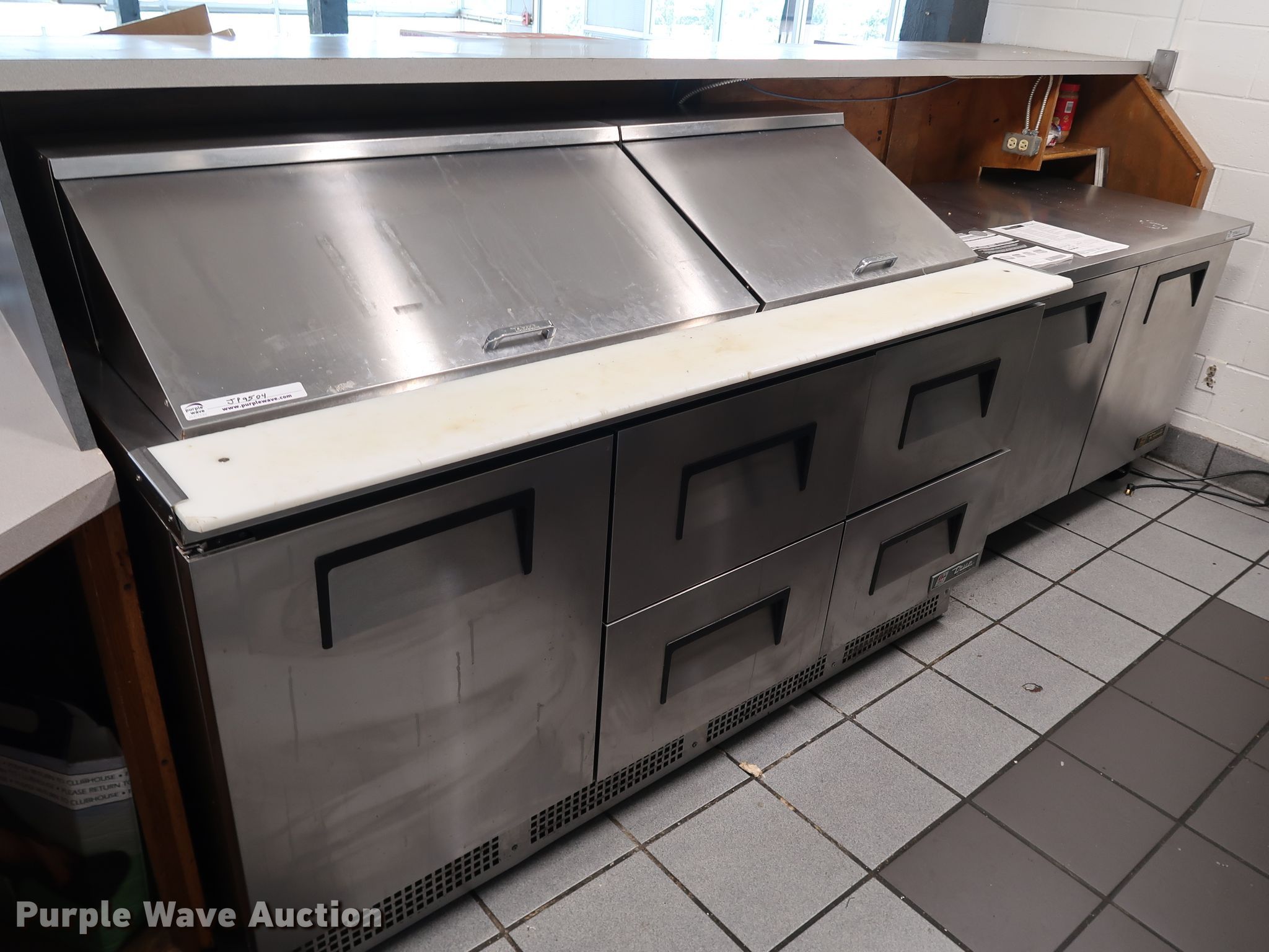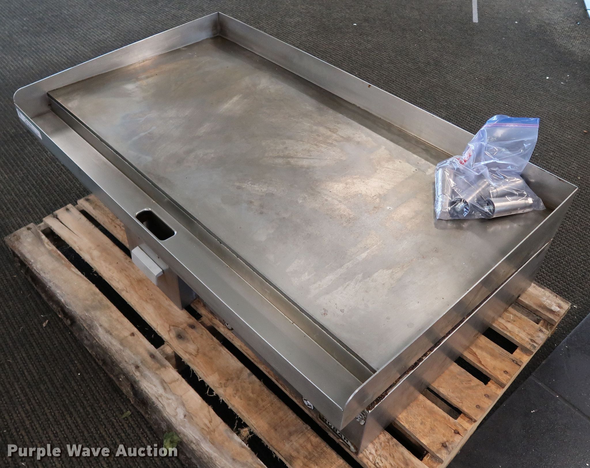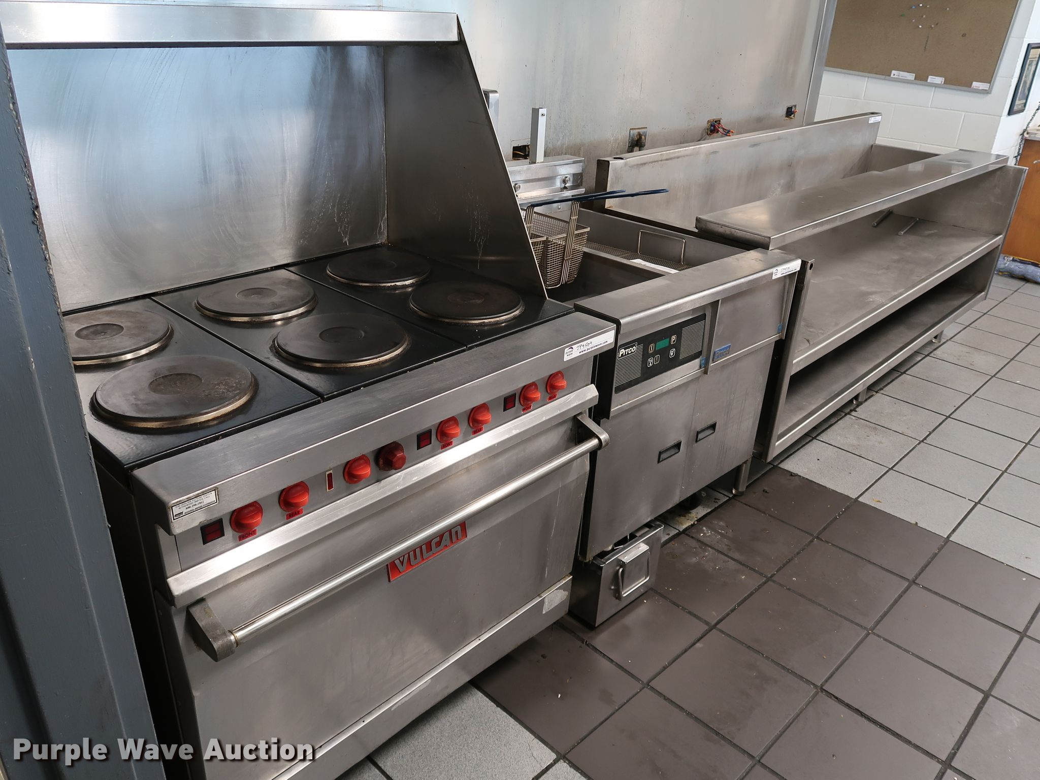 Purple Wave is selling a used Restaurant Equip. in Oklahoma. This item is a Restaurant equipment with the following: Hobart electric range, 48" x 28" x 12", True prep table and food cooler, 72" x 34" x 36", Stainless steel prep table, 32" x 90" x 36", Pitco dual basket fryer, Vulcan electric oven and range, True stainless steel counter top refrigerator, 31" x 48" x 36"