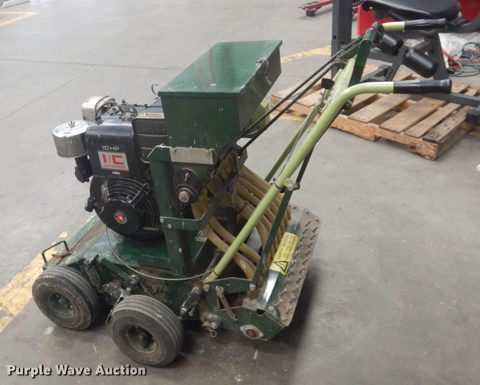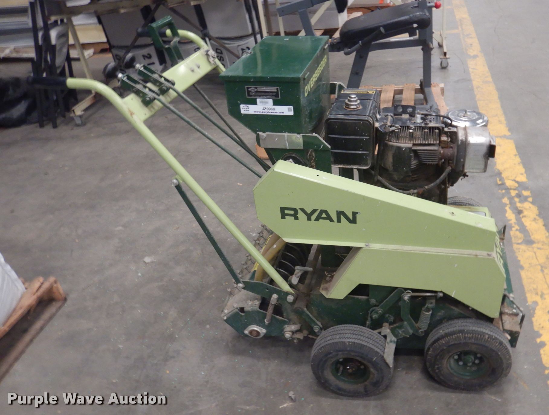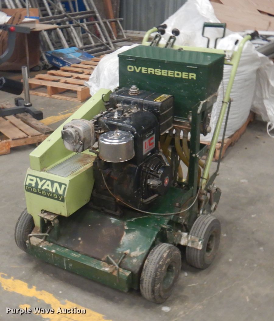 Purple Wave is selling a used Lawn and Garden in Kansas. This item is a Ryan Mataway overseeder with the following: Width: 19", Briggs & Stratton single cylinder gas engine, 4.10/3.50 tires, Serial 28534