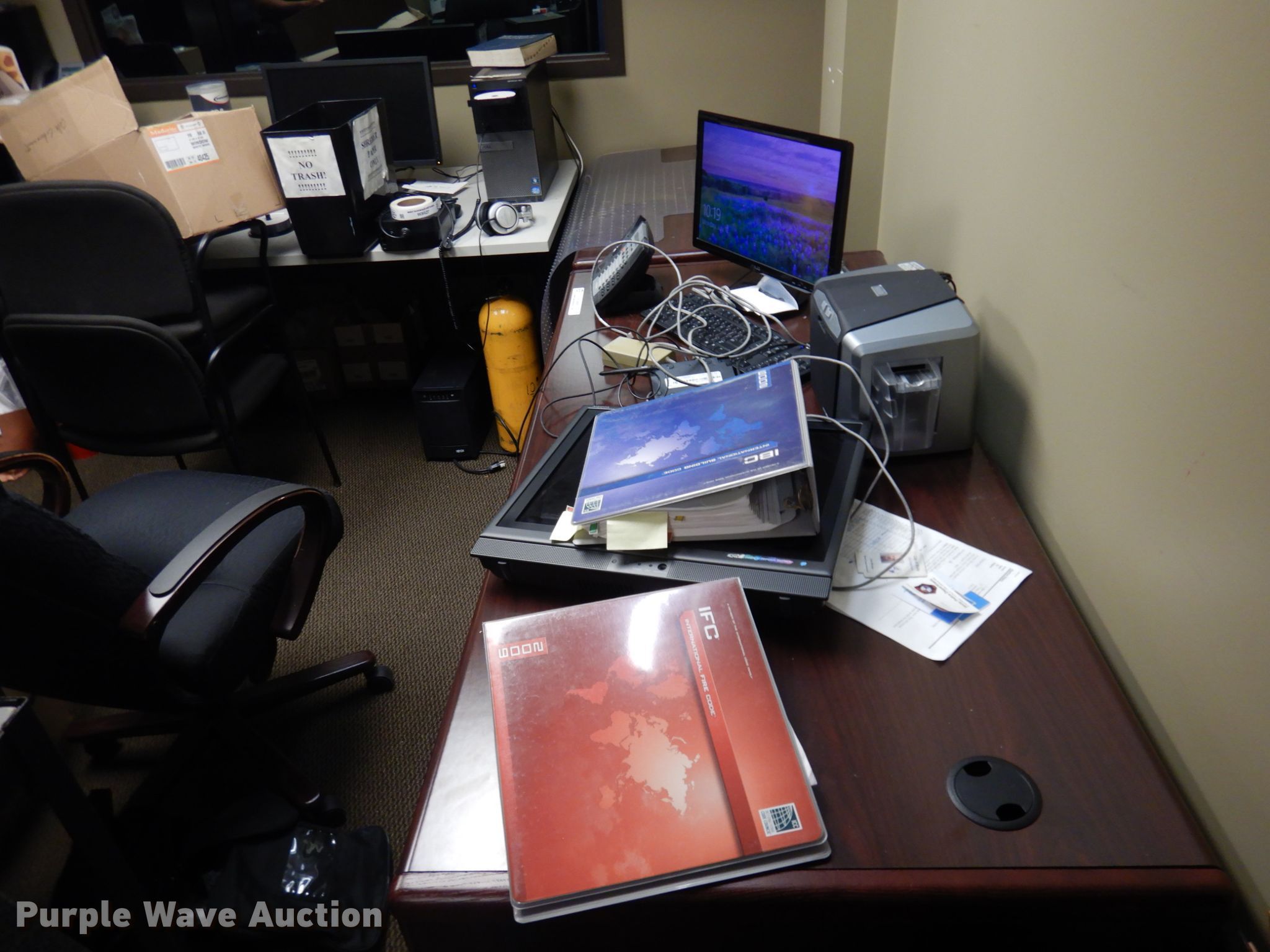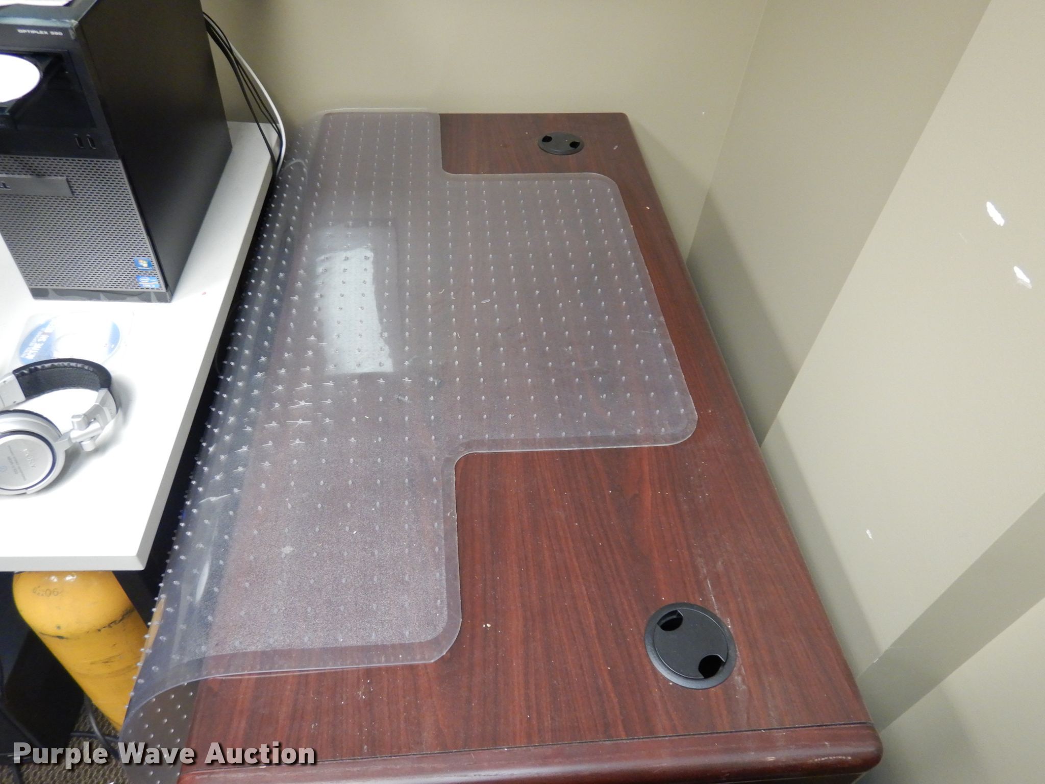 Purple Wave is selling a used Furniture in Oklahoma. This item is a Furniture with the following: L-shaped desk, 65"L x 29"W, 48"L x 24"W, Chair, Plastic chair mat, All other material or equipment is not included