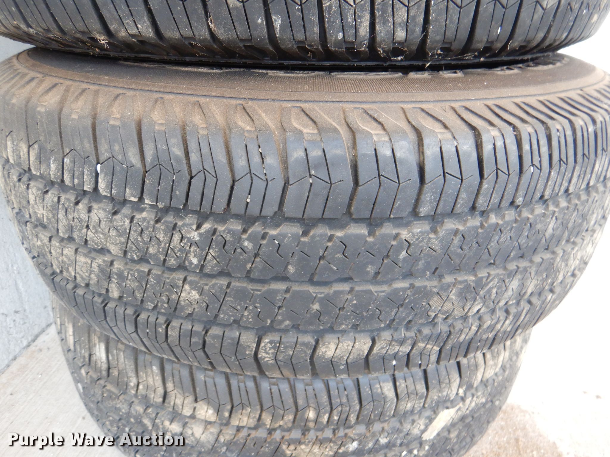 Purple Wave is selling a used Fleet Tires in Kansas. This item is a (4) wheels and tires with the following: Jeep wheels, Five lug, Goodyear Wrangler tires, 225/75R17