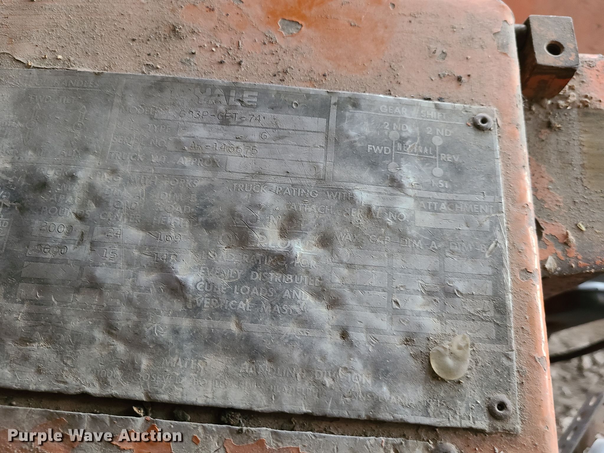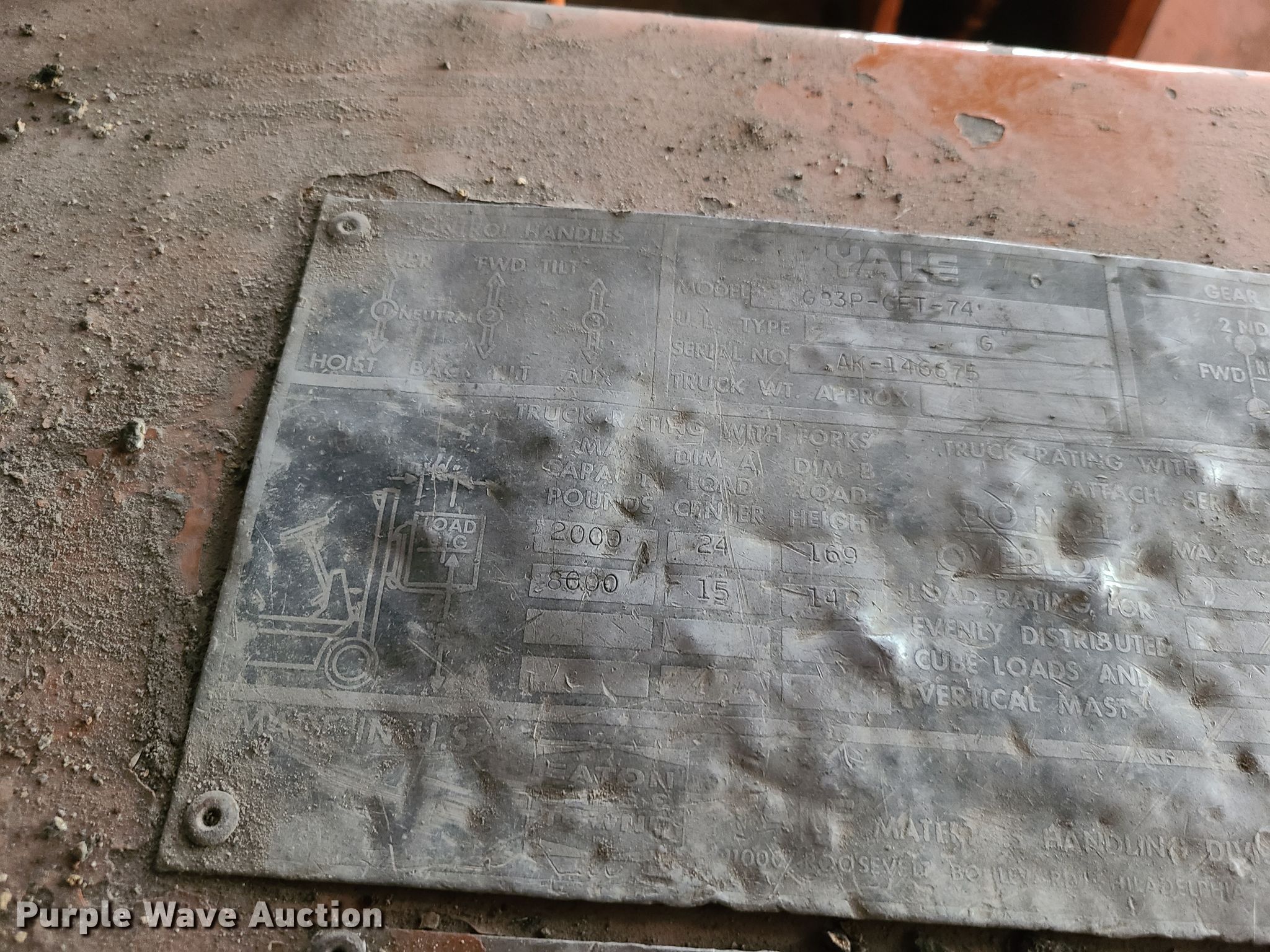 Purple Wave is selling a used Warehouse Forklift in Missouri. This item is a Yale G83P-GET-74 forklift with the following: 3,652 hours on meter, Serial: AK-146675