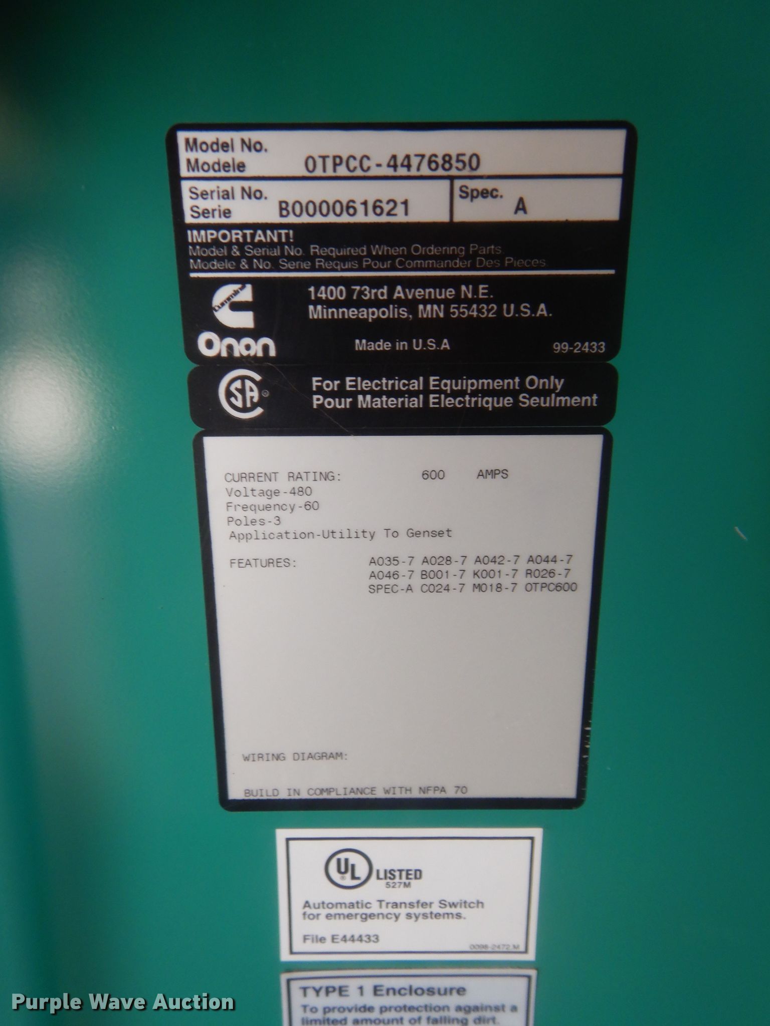 Purple Wave is selling a used Building Materials in Oklahoma. This item is a Onan OTPCC-4476850 power command transfer swatch with the following: 600 amp rating, 480V capacity