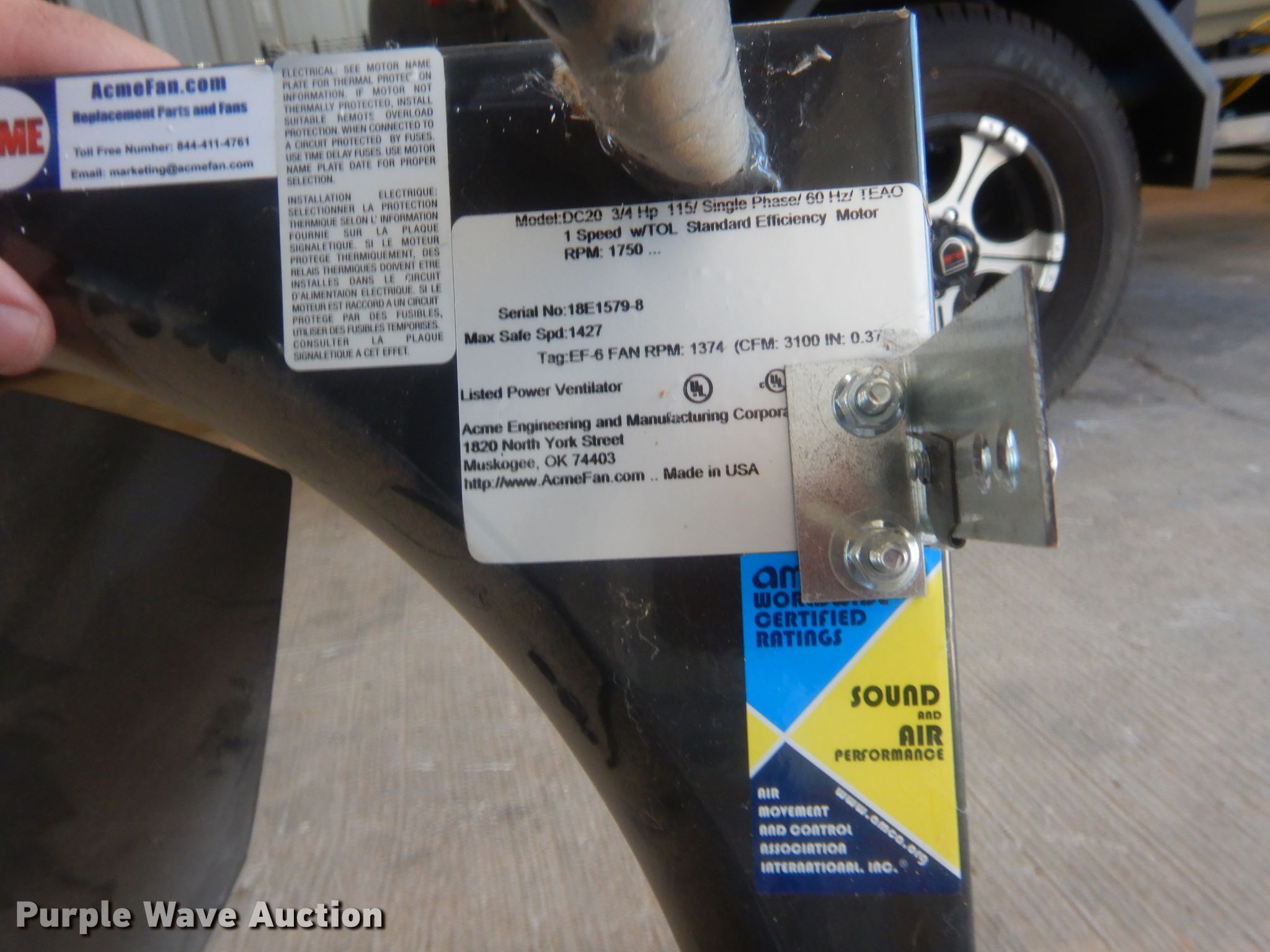 Purple Wave is selling a used Building Materials in Oklahoma. This item is a Acme DC20 exhaust fan with the following: Marathon TUB 56B17T15502A electric motor, 115V, 3/4 HP, Single phase, 1,750 RPM