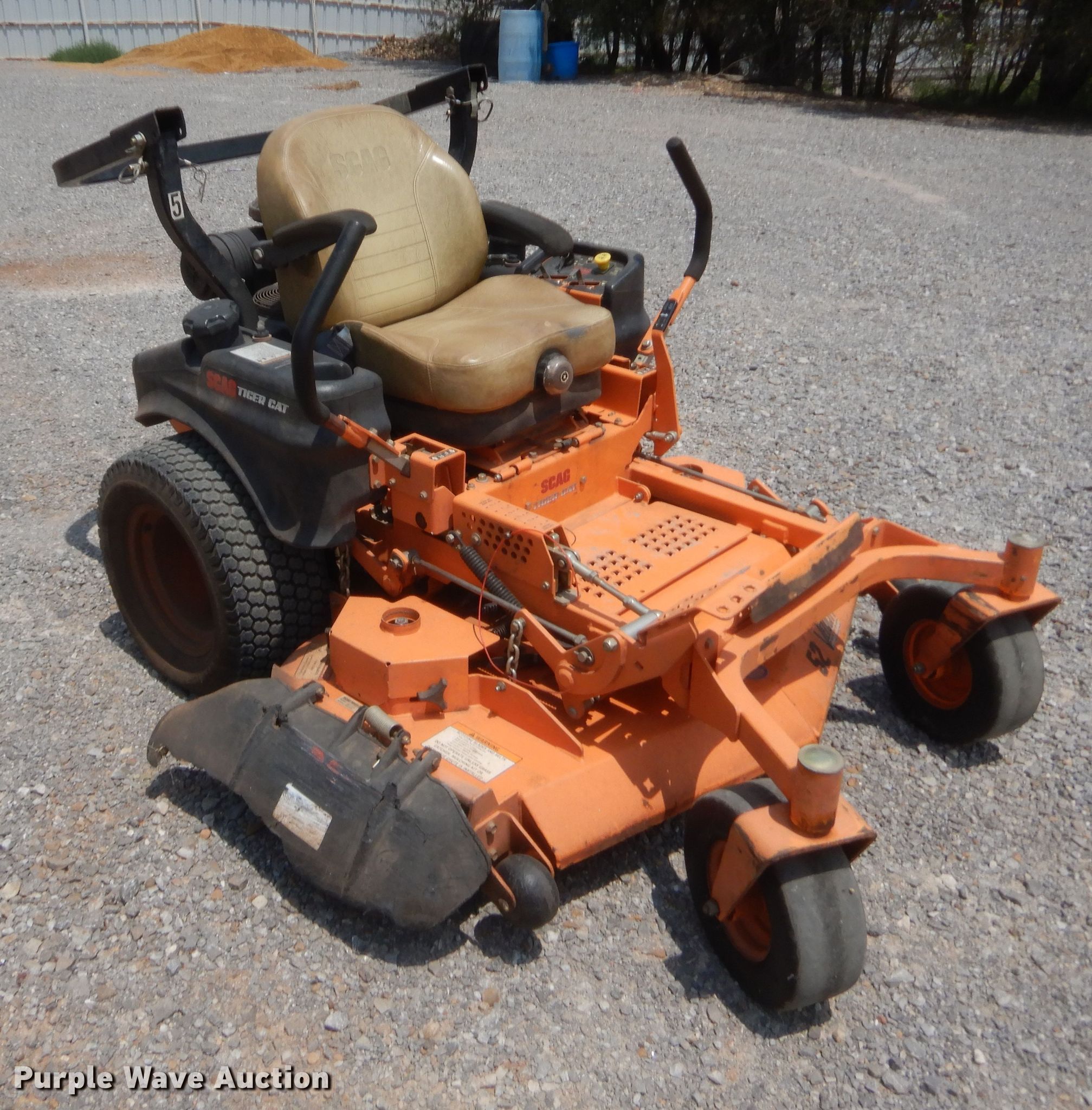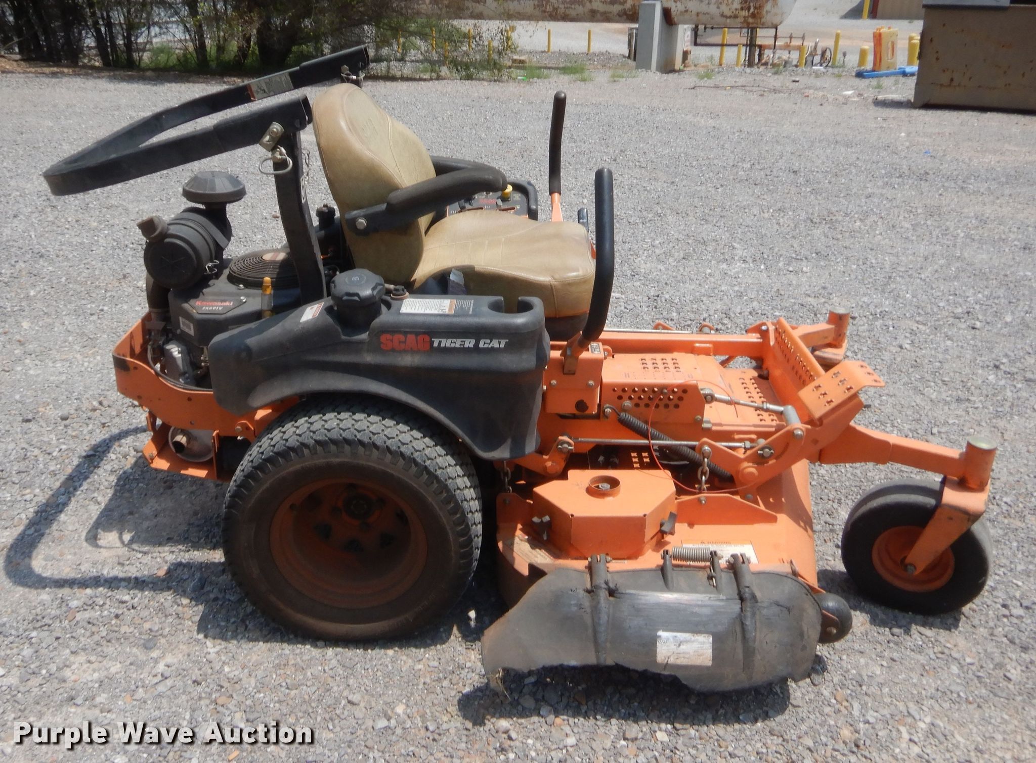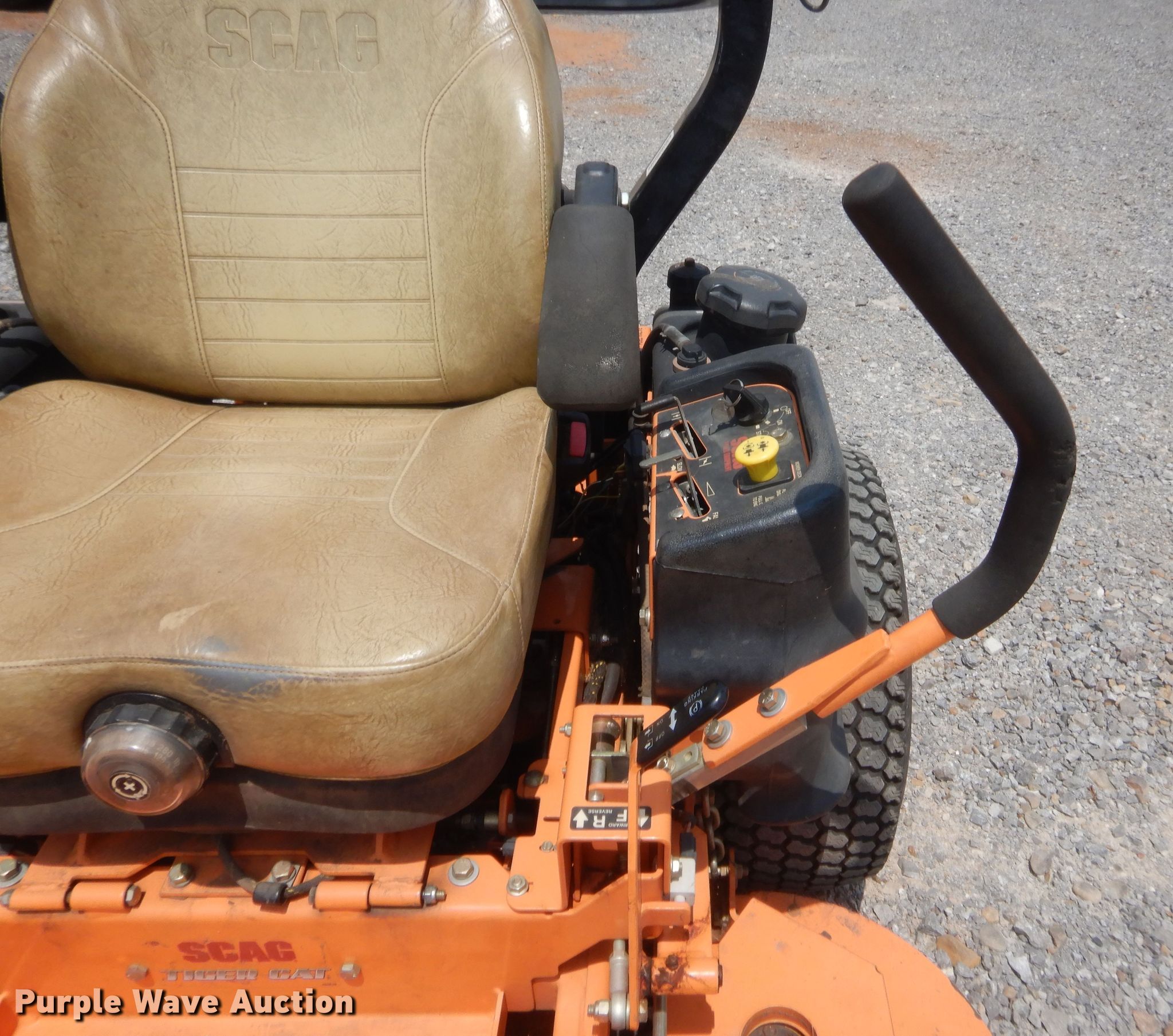 Purple Wave is selling a used Lawn Mower in Oklahoma. This item is a Scag Tiger Cat ZTR lawn mower with the following: 888 hours on meter, Cutting width: 52", Serial: J9004050