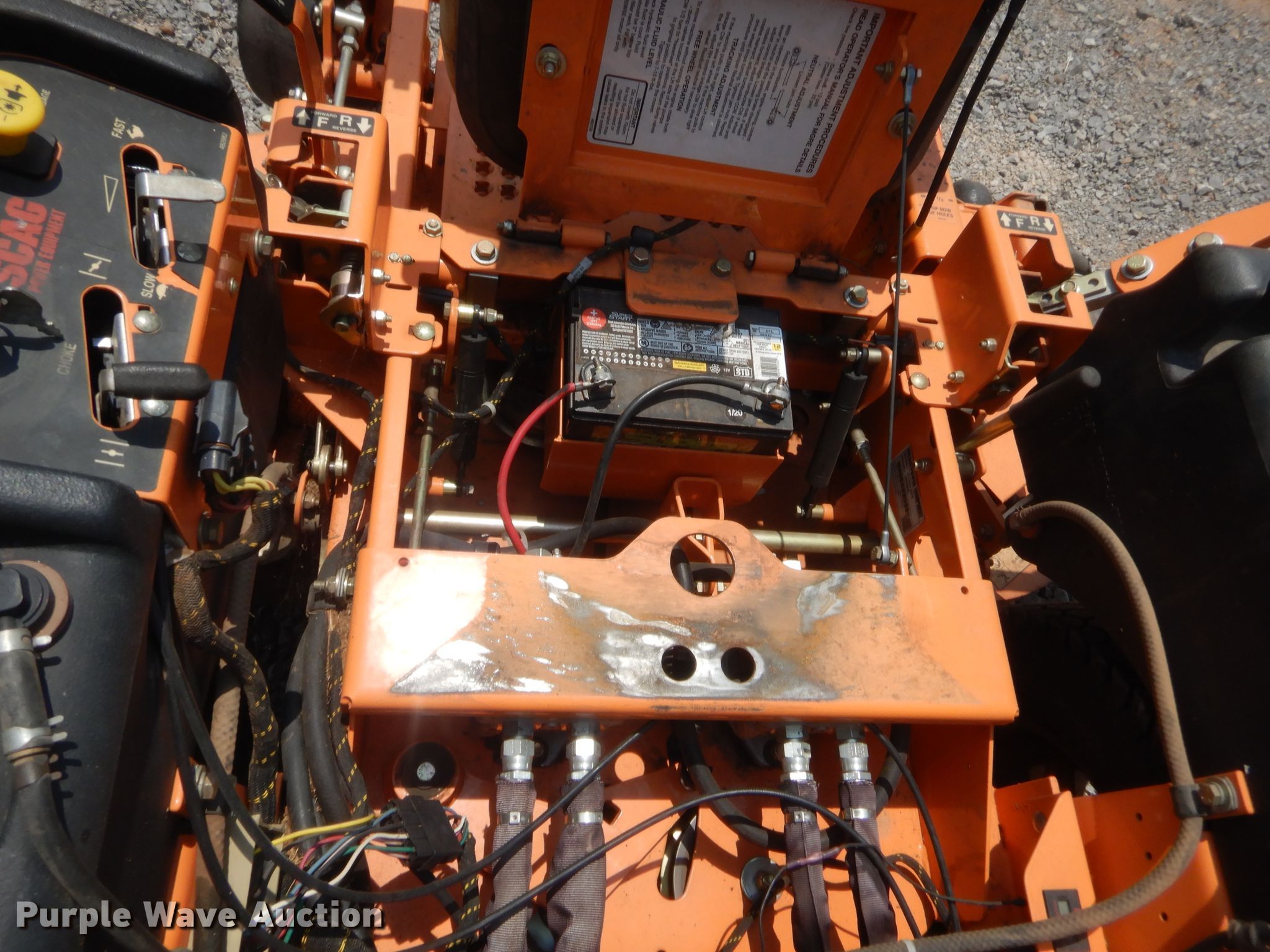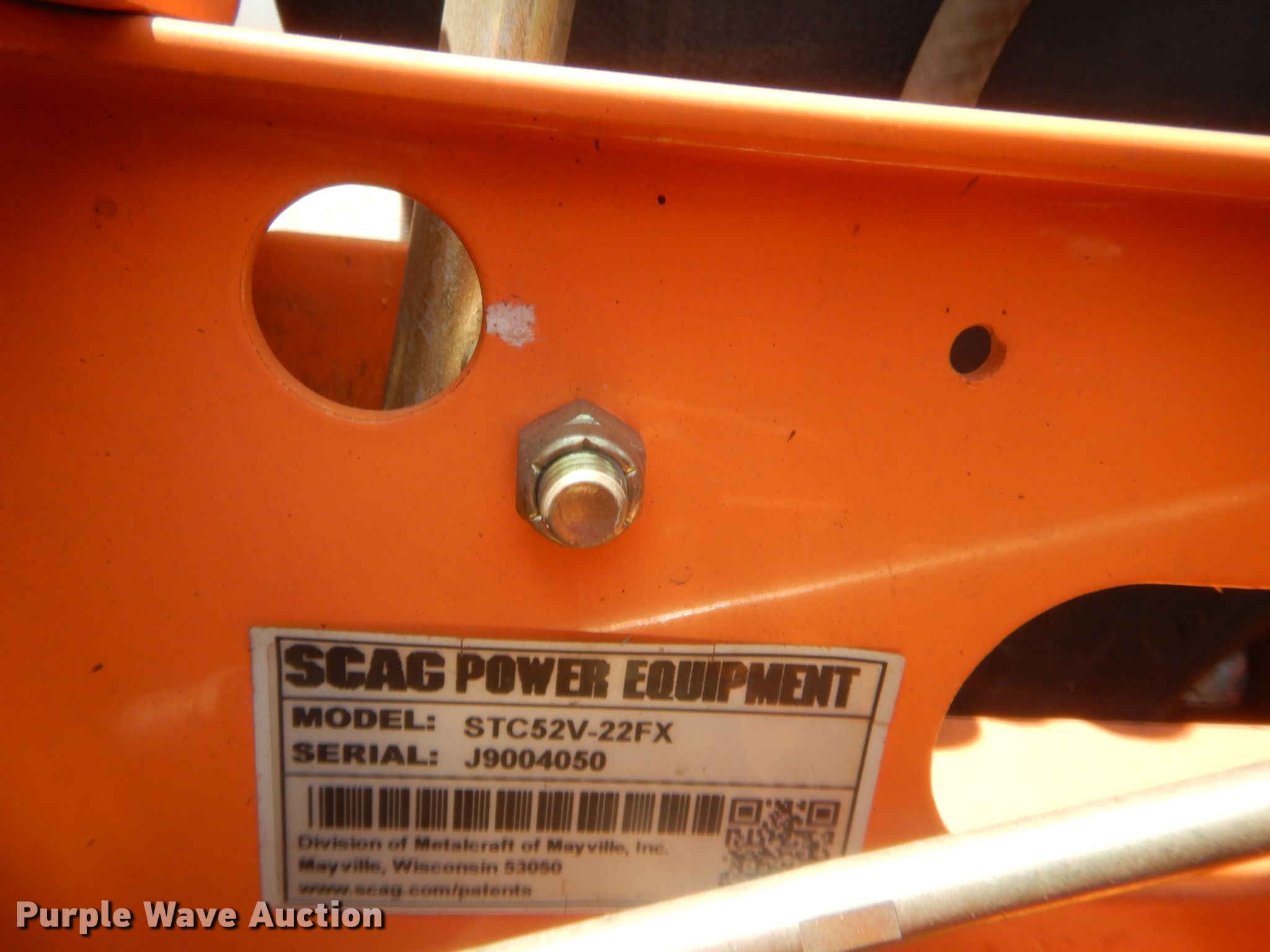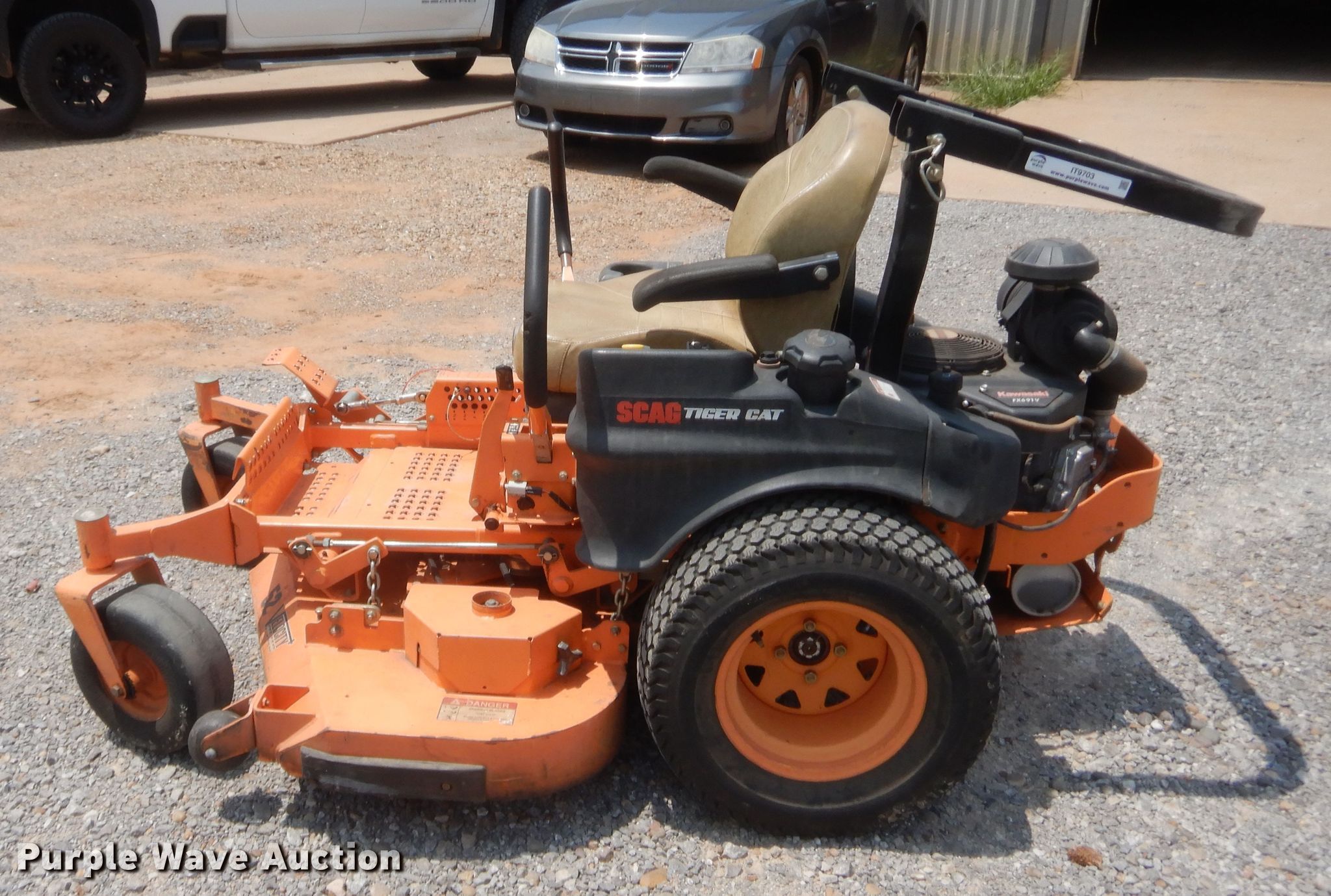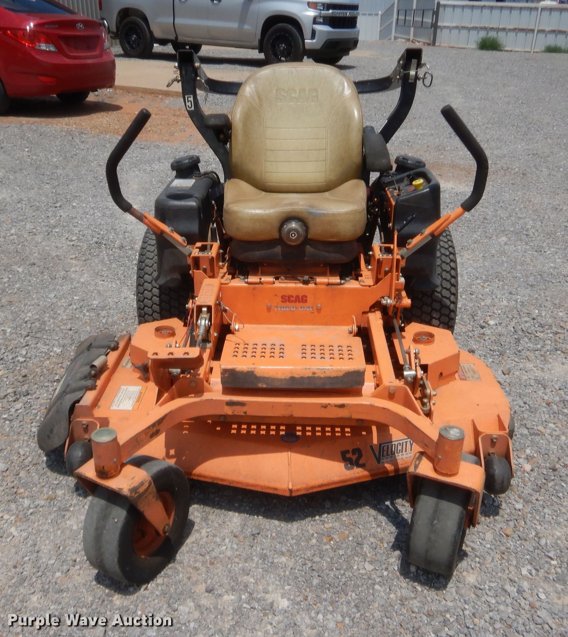 Purple Wave is selling a used Lawn Mower in Oklahoma. This item is a Scag Tiger Cat ZTR lawn mower with the following: 888 hours on meter, Cutting width: 52", Serial: J9004050