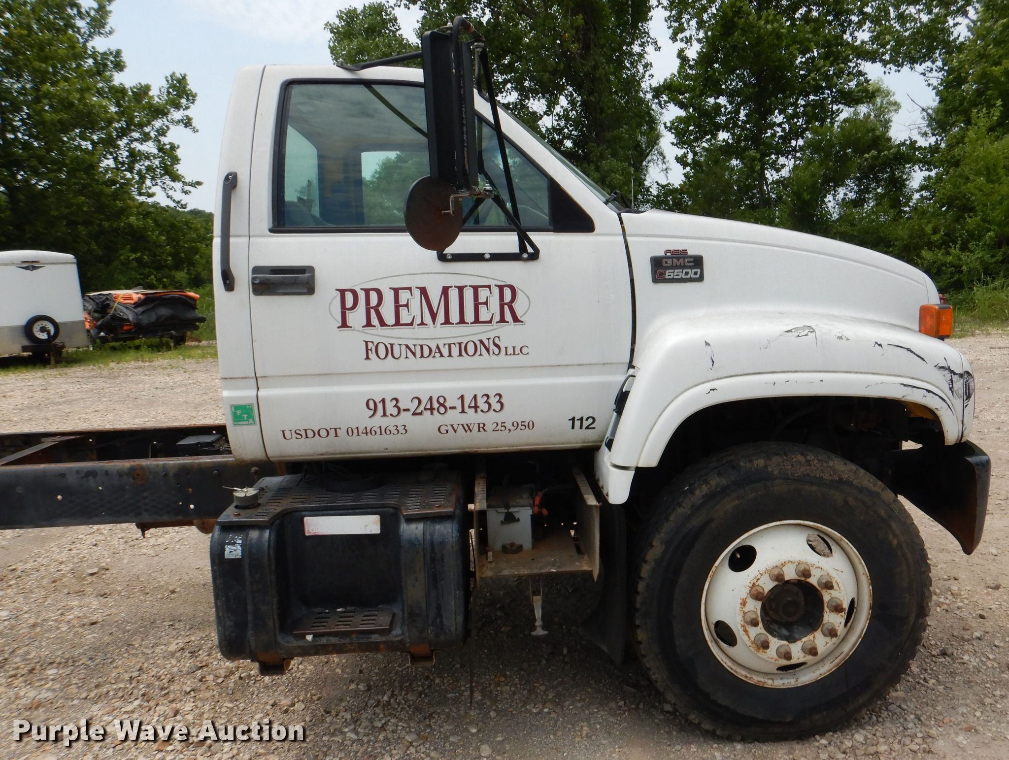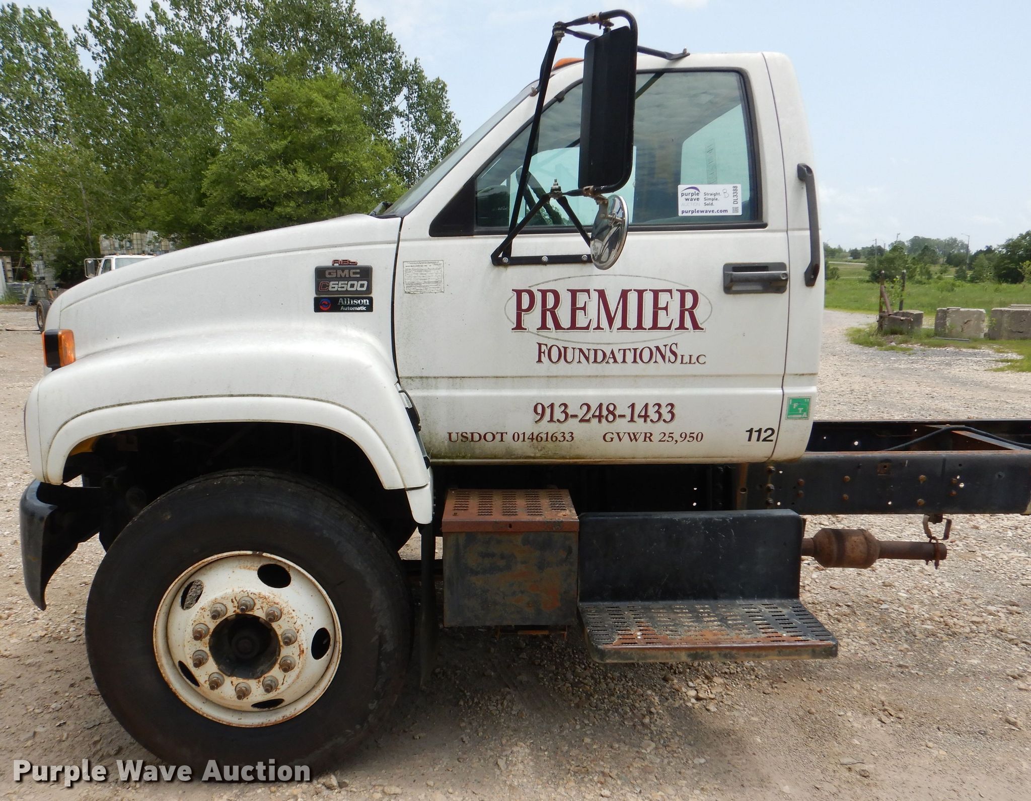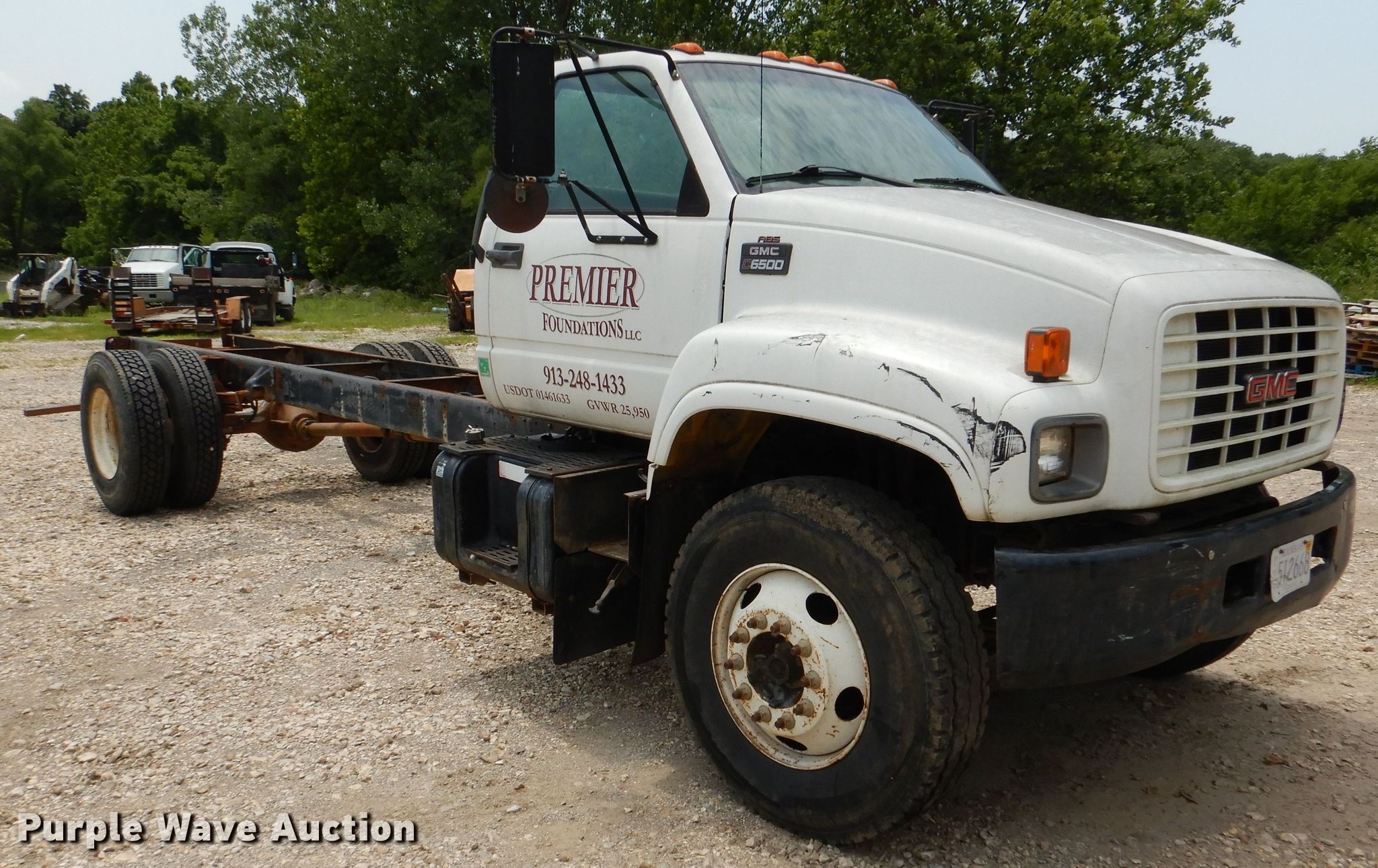 2002 GMC C6500 truck cab and chassis. 109,402 miles on odometer. Engine Displacement: 8.1L, Cylinders: 8, Fuel type: Gas. Transmission Automatic. Chassis Axles: Single, Suspension: Spring, Brakes: Hydraulic, Truck chassis: 224", GVWR: 25,950 lbs FAWR: 8,100 lbs, RAWR: 19,000 lbs. Interior AC, Heat. Operational Fuel tank: Single. Tires Size: 11R22.5. Notes Dash warning indicator: Brake, Windshield chipped or cracked, Dead battery, Non-operational AC. Kansas title. 1GDJ7H1EX2J900258. Premier Foundations, LLC. Lenexa, KS 66227