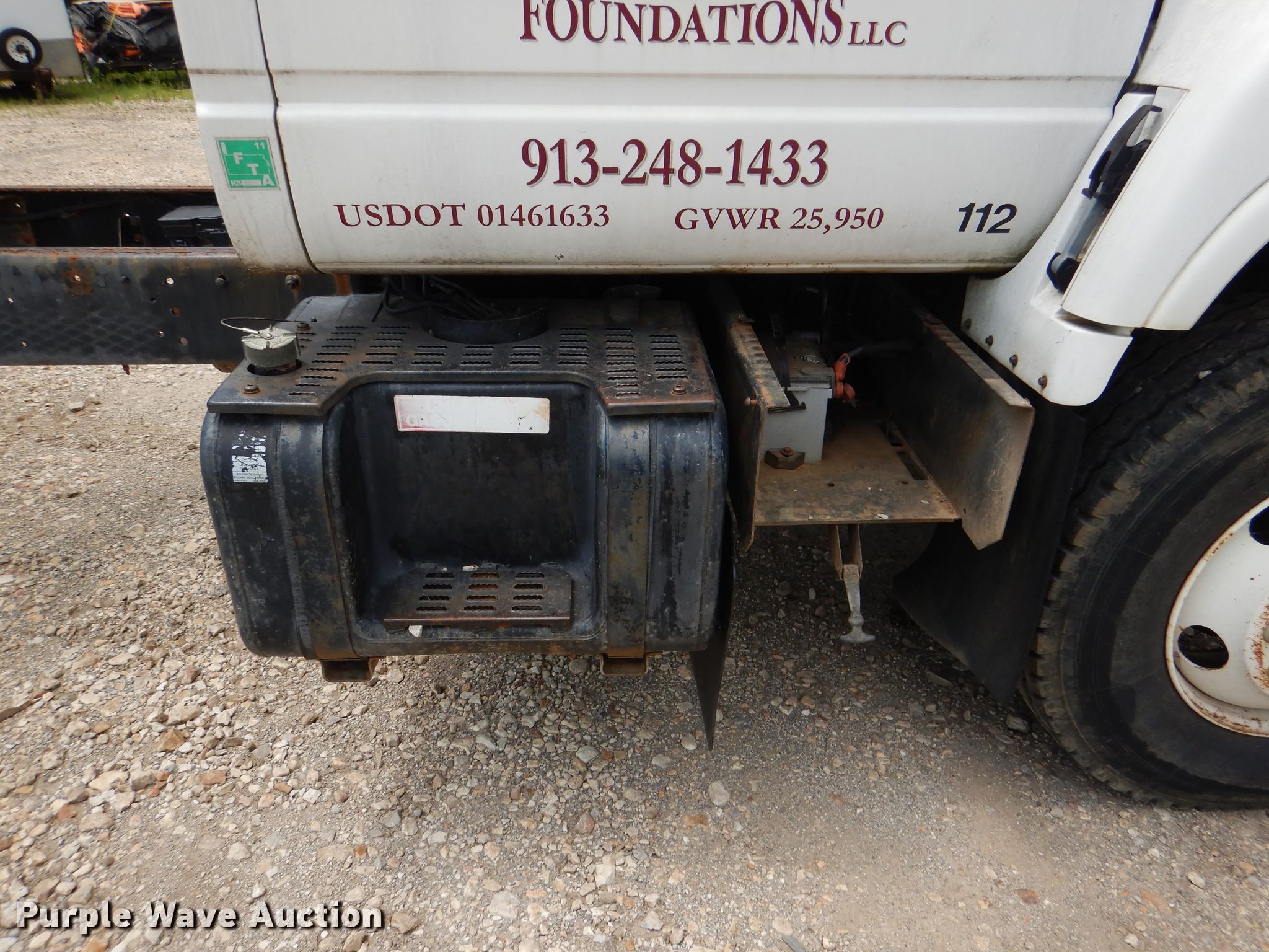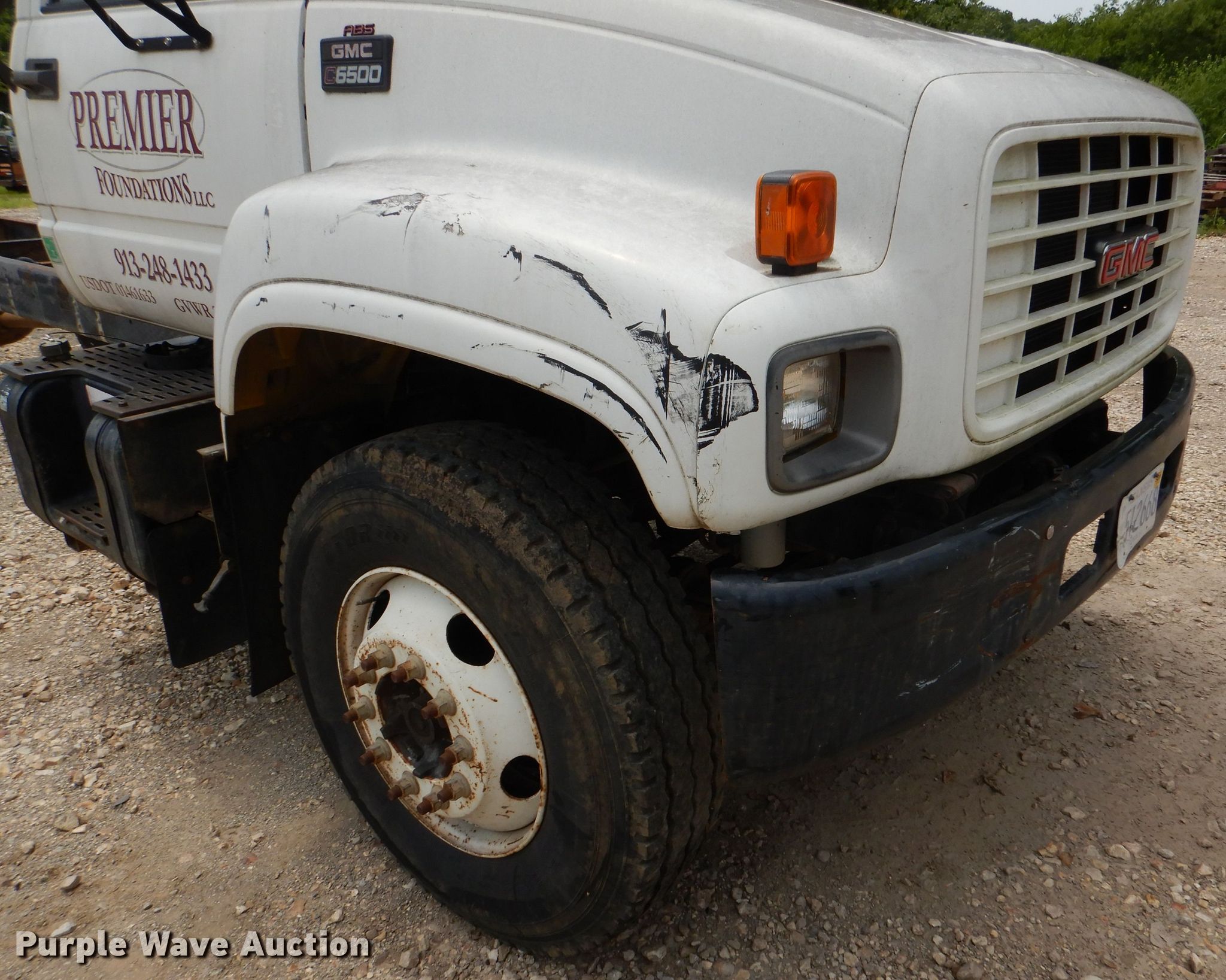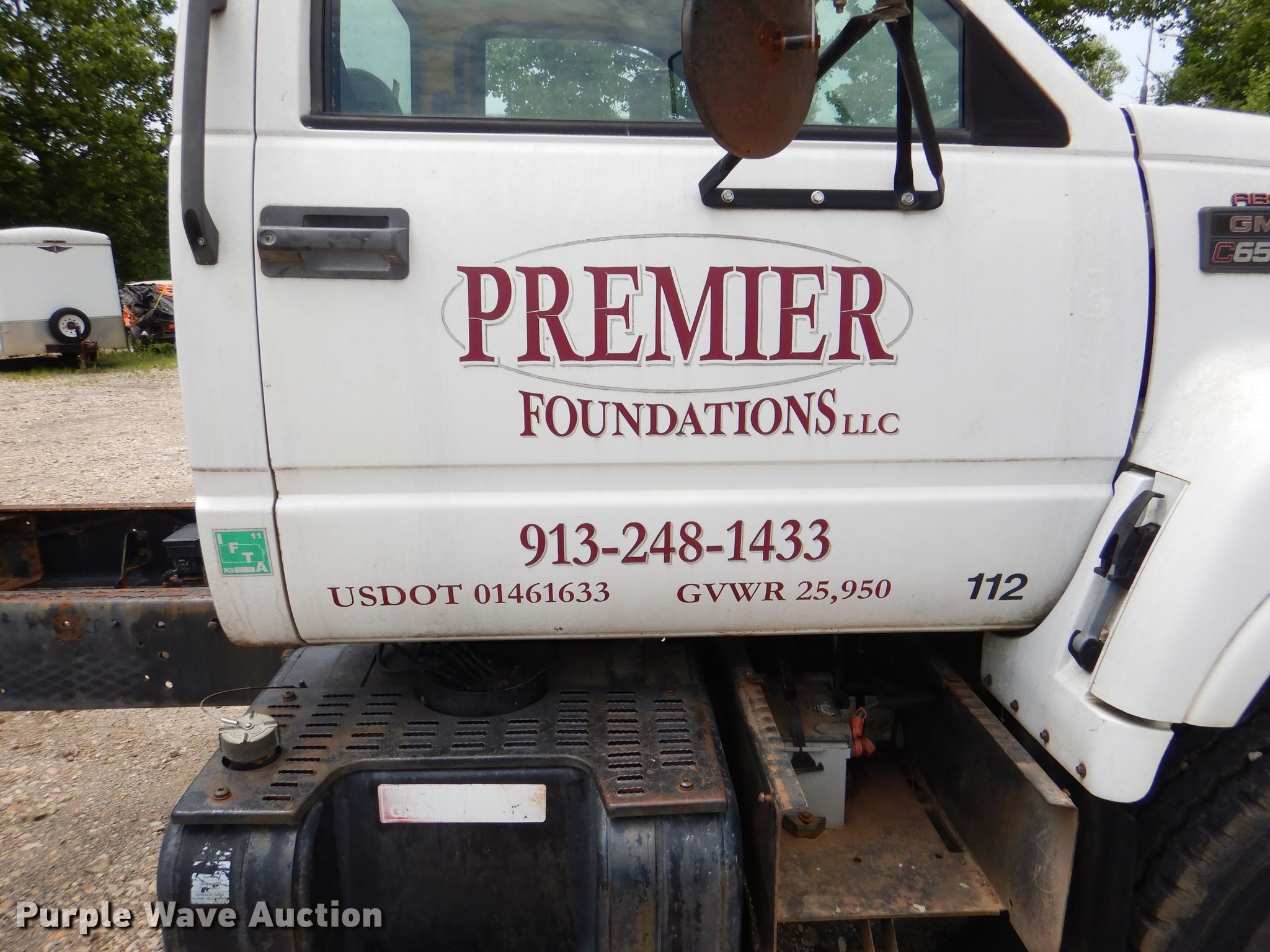 2002 GMC C6500 truck cab and chassis. 109,402 miles on odometer. Engine Displacement: 8.1L, Cylinders: 8, Fuel type: Gas. Transmission Automatic. Chassis Axles: Single, Suspension: Spring, Brakes: Hydraulic, Truck chassis: 224", GVWR: 25,950 lbs FAWR: 8,100 lbs, RAWR: 19,000 lbs. Interior AC, Heat. Operational Fuel tank: Single. Tires Size: 11R22.5. Notes Dash warning indicator: Brake, Windshield chipped or cracked, Dead battery, Non-operational AC. Kansas title. 1GDJ7H1EX2J900258. Premier Foundations, LLC. Lenexa, KS 66227