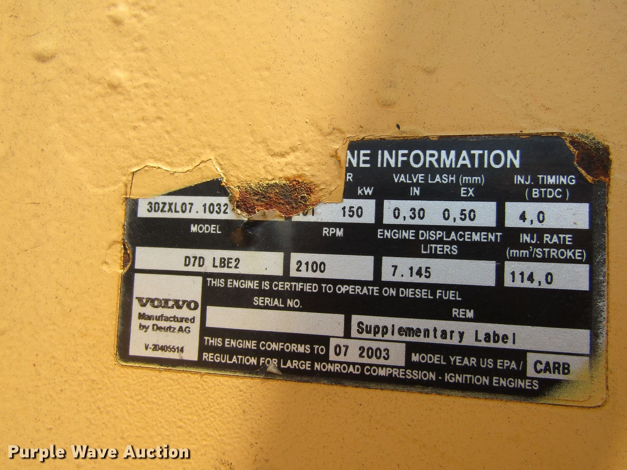 2003 Volvo L110E wheel loader. 18,766 hours on meter, Serial: L1100E60101. Engine Volvo D7D LBE2, Cylinders: 6, Fuel type: Diesel. Transmission Powershift, 4F - 4R. Operators station EROPS, AC, Heat, Bucket controls: Two-lever. Operational Auxiliary hydraulics: Front, Bucket Width: 108", Cutting edge: Bolt-on. Tires Size: 23.5R25. Rausch Brothers Trucking. 1521 220th St. Ionia, IA 50645