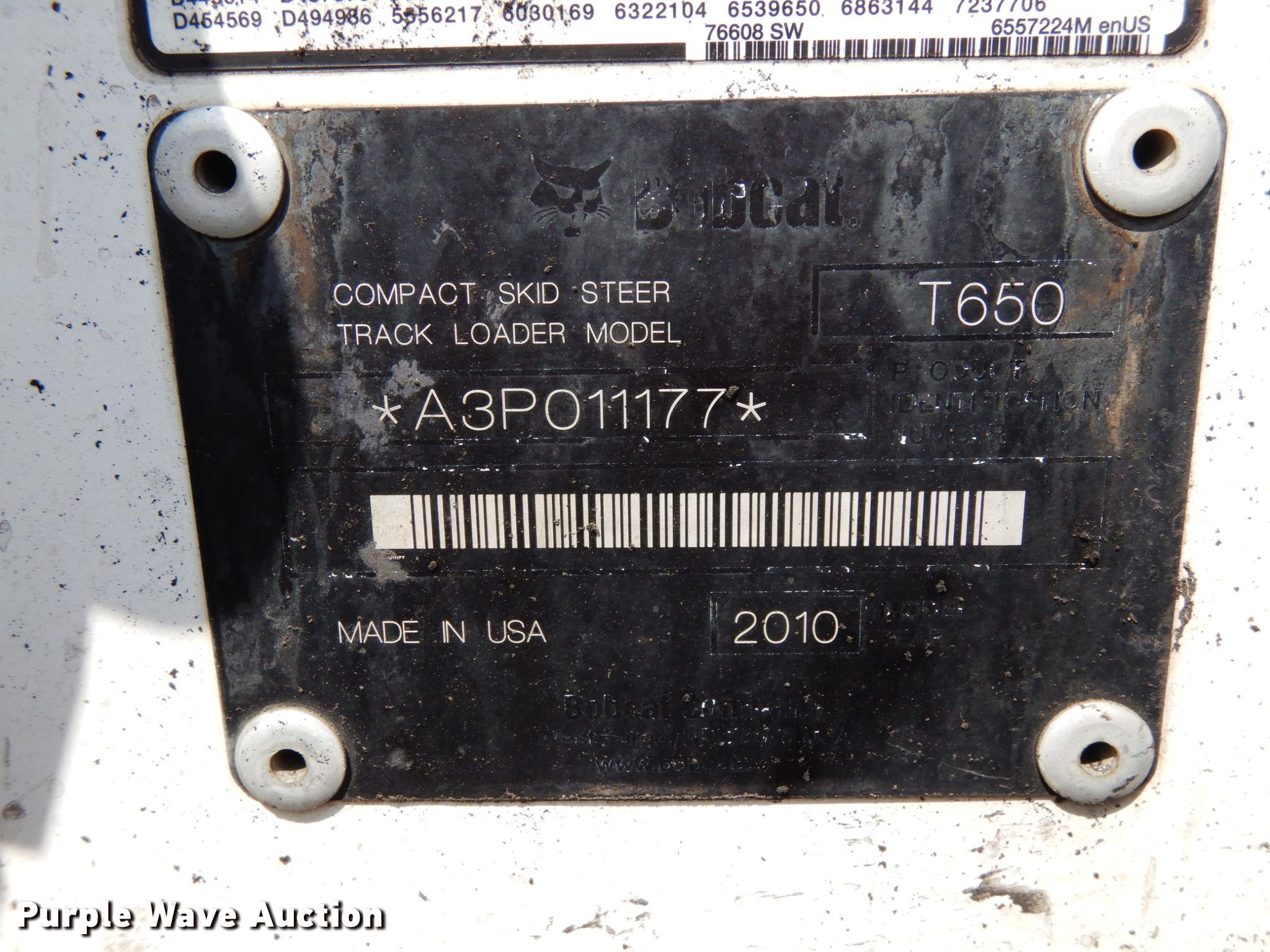 Purple Wave is selling a used Tracked Skid Steer Loader in Missouri. This item is a 2010 Bobcat T650 tracked skid steer loader with the following: 3,314 miles on odometer, Serial: A3P011177
