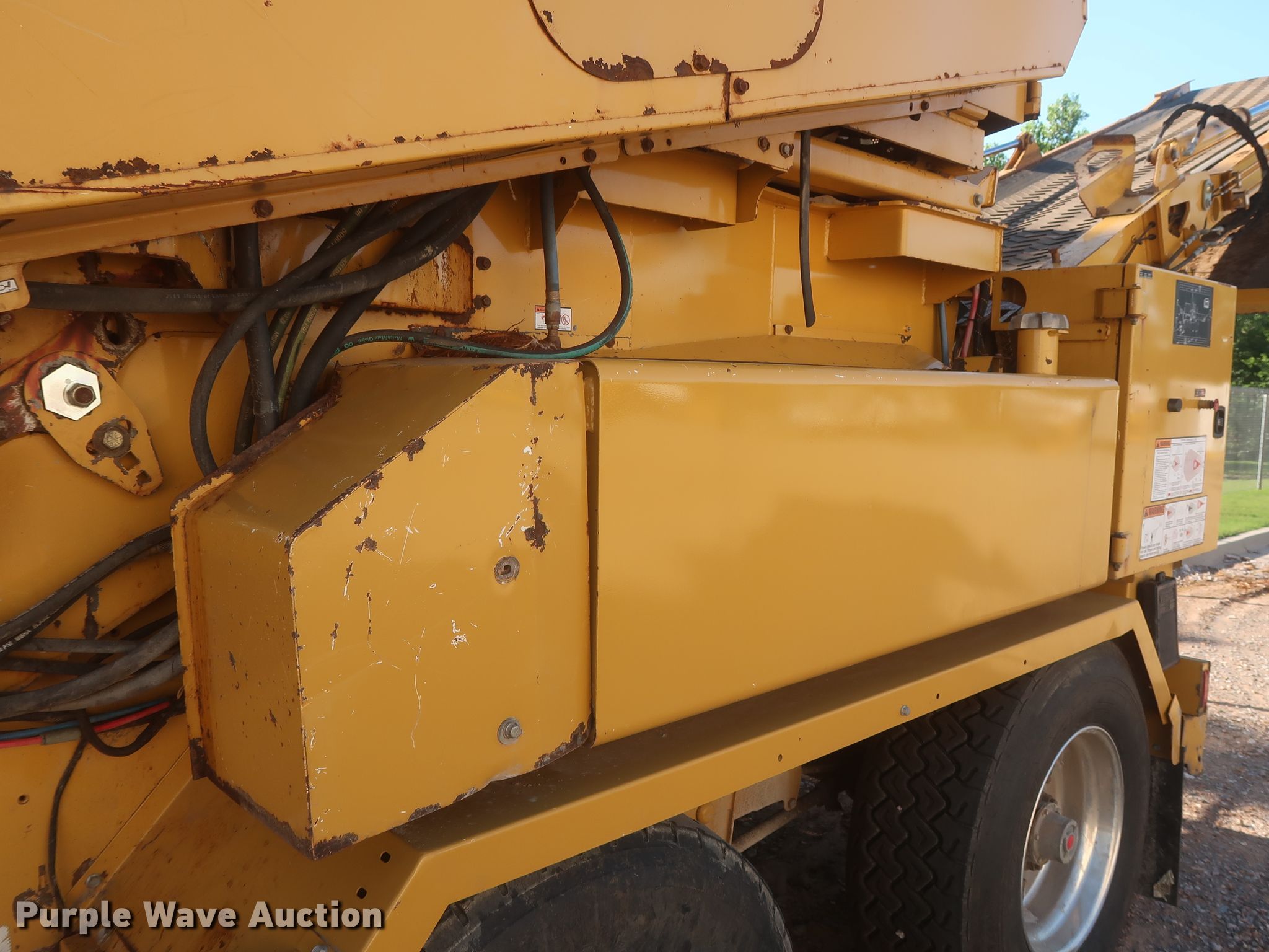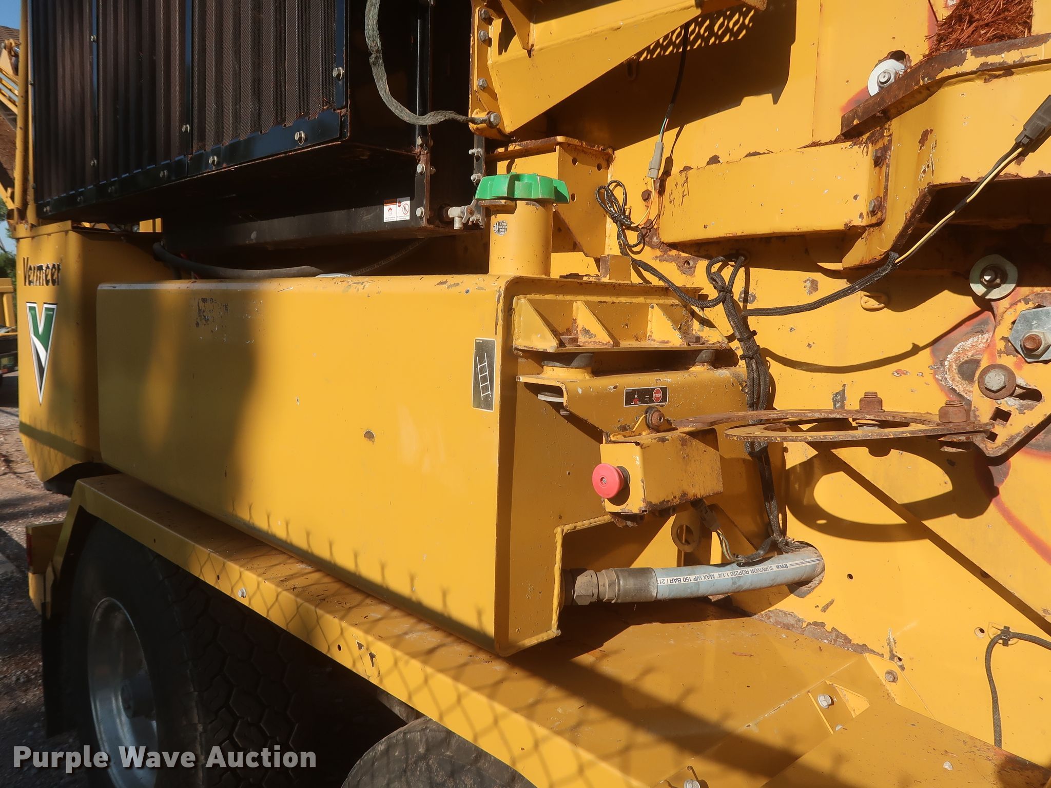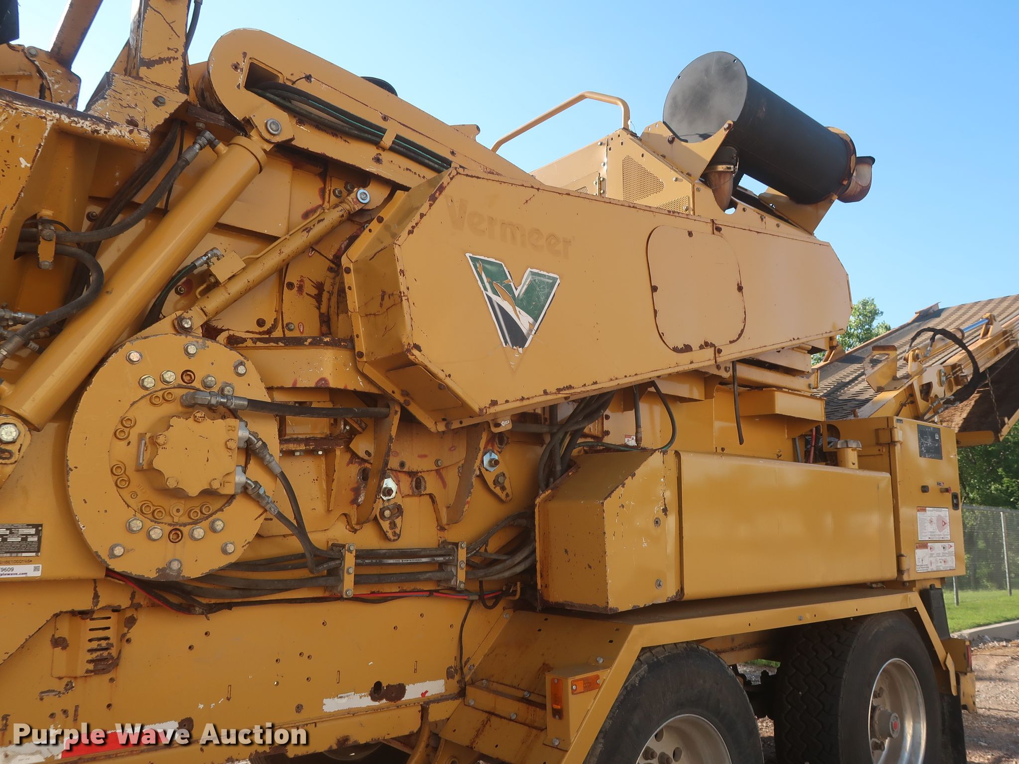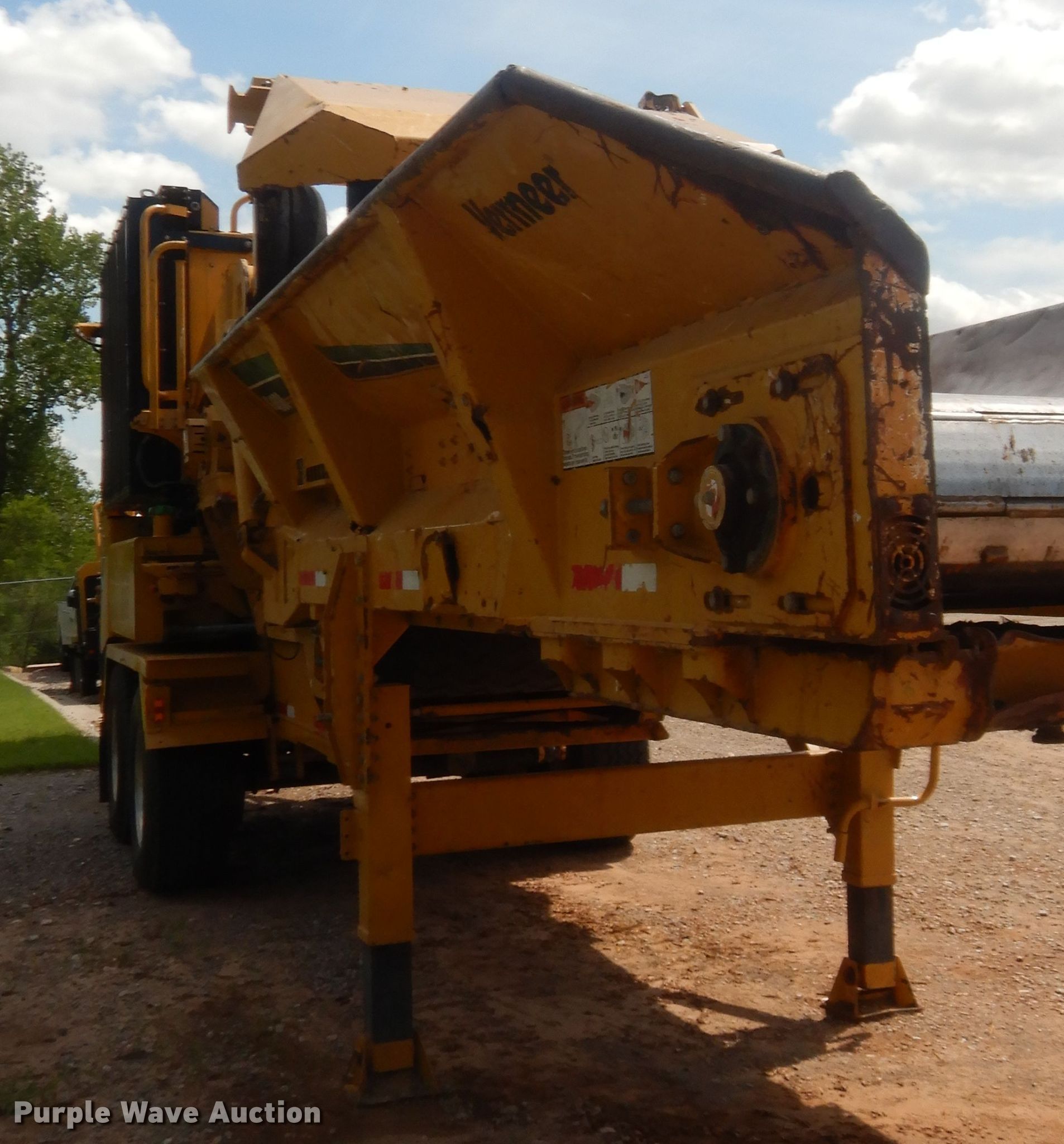 Purple Wave is selling a used Wood Grinder in Oklahoma. This item is a 2014 Vermeer HG4000 horizontal grinder with the following: 2,080 hours on meter, 52'L x 96"W overall, Fiat six cylinder diesel engine, 60" opening, Single belt discharge, Hydraulic conveyor, Tandem axle, Spring suspension, Air brakes, 385/65R22.5 tires, GVWR: 44,000 lbs