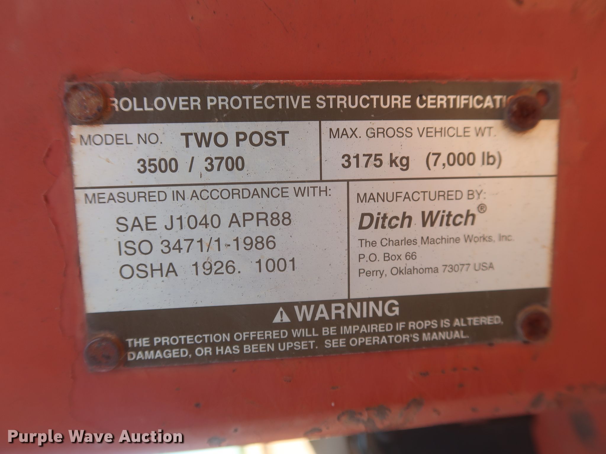 1997 Ditch Witch 3700 trencher. 600 hours on meter, Serial: 3P1288. Engine Deutz, Cylinders: 3, Fuel type: Diesel. Transmission Hydrostatic, Four wheel drive. Operators station OROPS. Operational Trencher Model: H313, Serial: CMWH313XPF0001970, Estimated dig depth: 60", Cutting width: 6", Teeth: Dirt, Crumber, Backfill blade Width: 63". Tires Size: 26x12.00-12. Notes Engine replaced December 2020. View repairs. Vermeer Great Plains. 8300 N I 35 Service Rd. Oklahoma City, OK 73131
