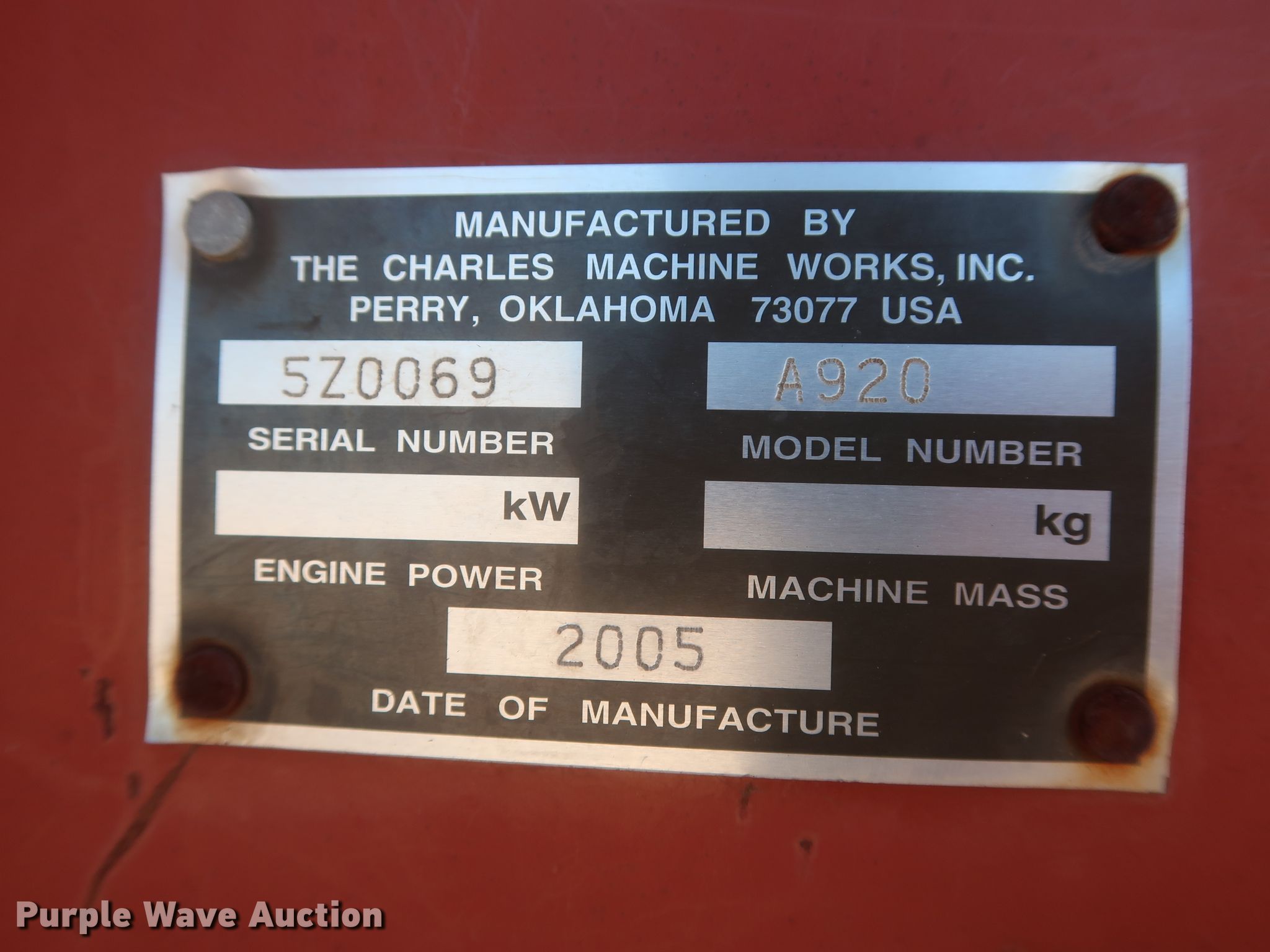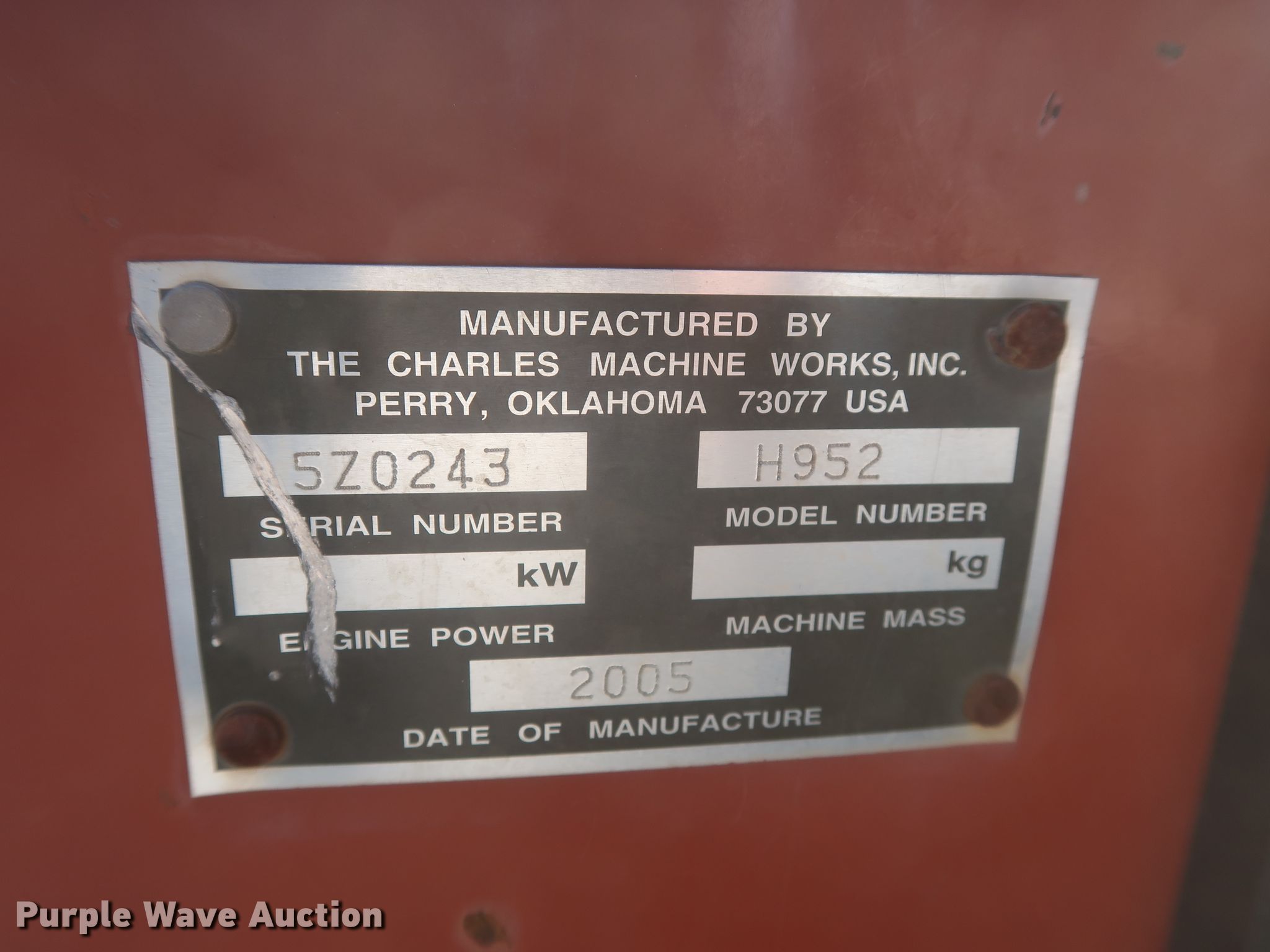 2005 Ditch Witch RT115 trencher. 1,480 hours on meter, Serial: 5Z0498. Engine John Deere 4045T, Serial: 381461, Displacement: 4.5L, Cylinders: 4, Fuel type: Diesel. Transmission Hydrostatic, Two speed travel, Four wheel drive. Operators station Canopy. Operational Combination unit Model: H952, Serial: 5Z0243, Trencher Estimated dig depth: 96", Cutting width: 6", Teeth: Dirt, Crumber, Vibratory plow Depth: 48", Backhoe Model: A920, Serial: 5Z0069, Bucket width: 18", Backfill blade Width: 80". Tires Size: 38x18.00-20. Vermeer Great Plains. 8300 N I 35 Service Rd. Oklahoma City, OK 73131