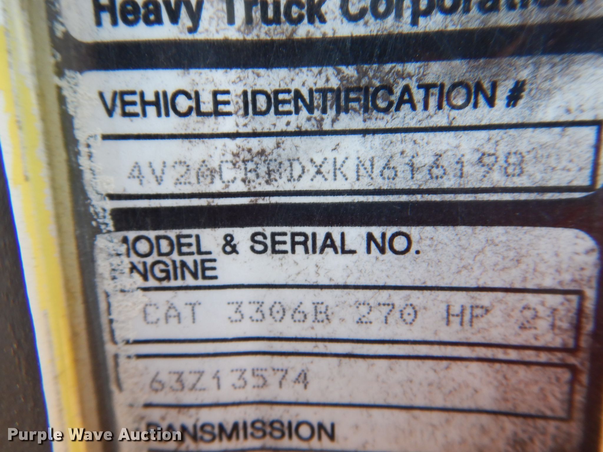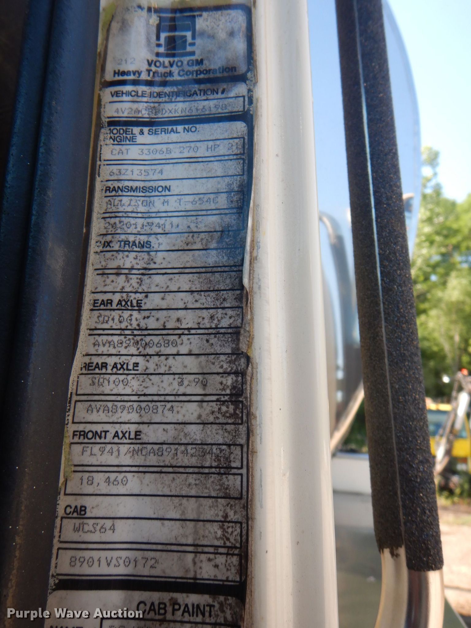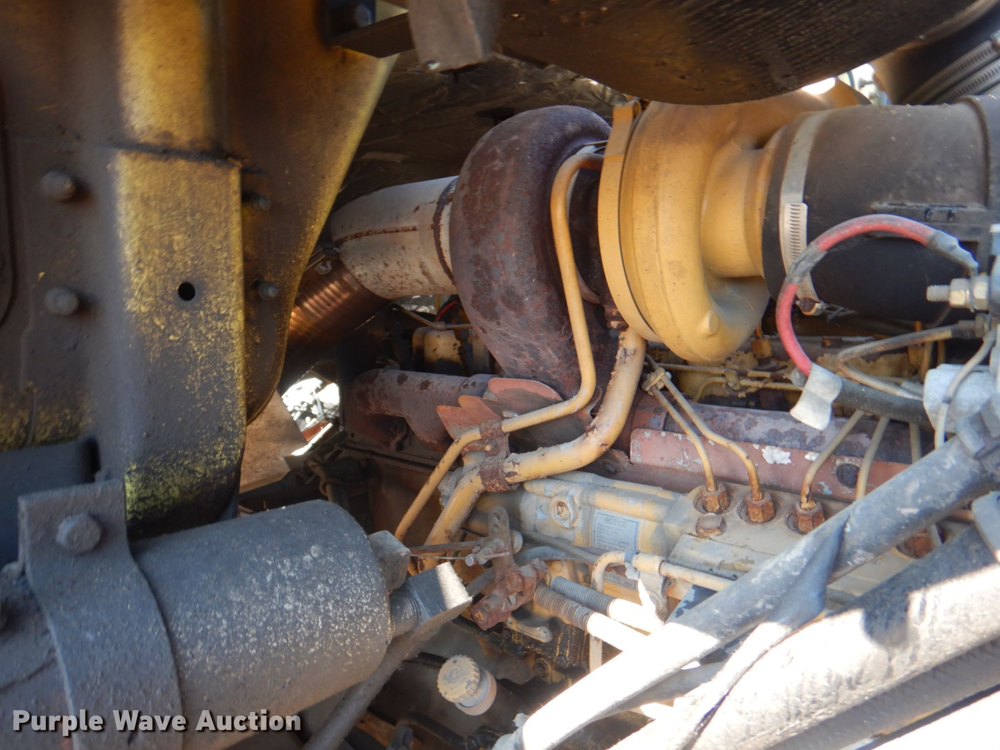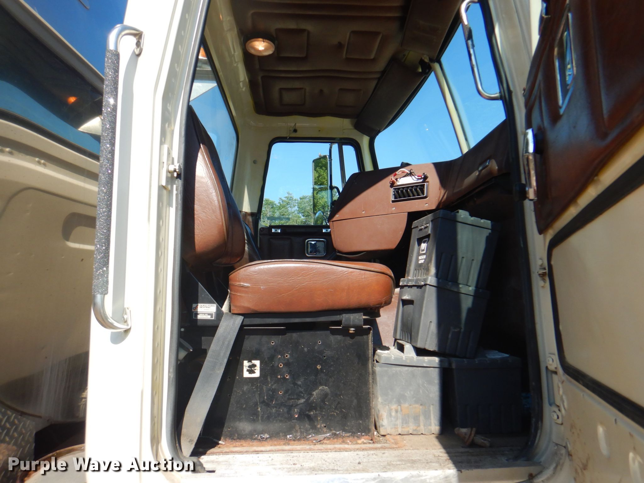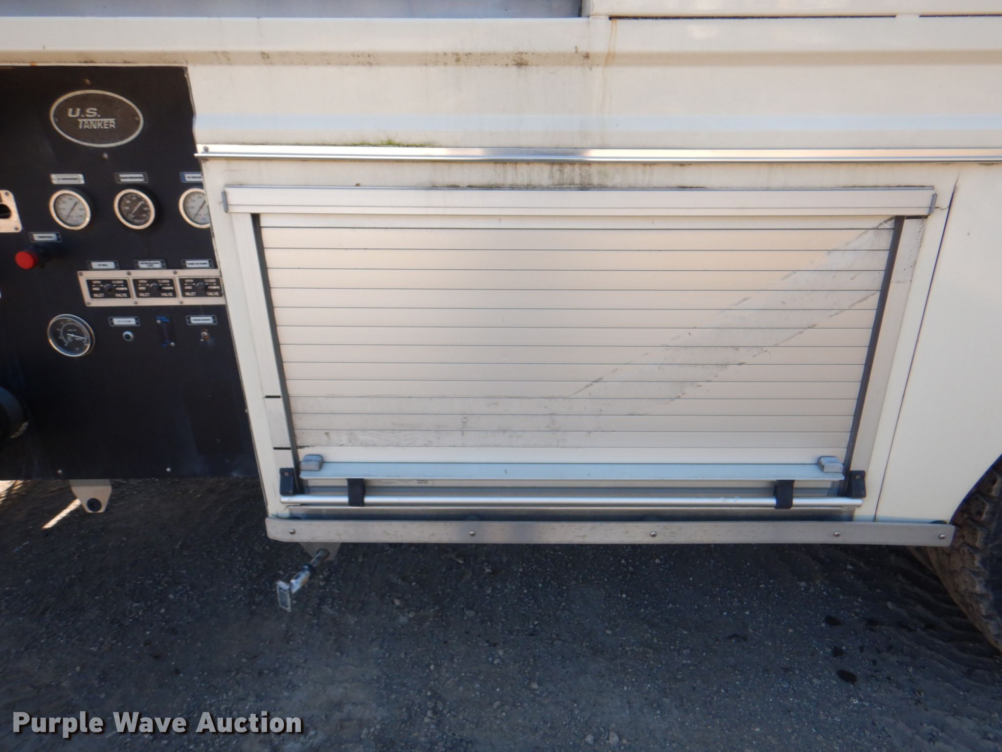 1989 White GMC WCS tank truck. 30,772 miles on odometer. Engine Caterpillar 33066B, Serial: 63Z13574, Displacement: 10.0L, Cylinders: 6, Fuel type: Diesel, HP: 270. Transmission Allison T-654C, Automatic. Chassis Axles: Tandem, Differential lock: Inter-axle, Suspension: Spring over walking beam, Brakes: Air, PTO. Interior Heat, Heated mirrors, Auxiliary controls. Operational Bed / tank US Tanker, 18' L x 95" W, Water tank Side discharge, Top fill, Rear drain: 2". Tires Front: 425/65R22.5, Rear: 11R22.5. Wisconsin title. 4V2ACBBDXKN616198. Asphalt Contractors, Inc... 21750 Durand Ave. Union Grove, WI 53182