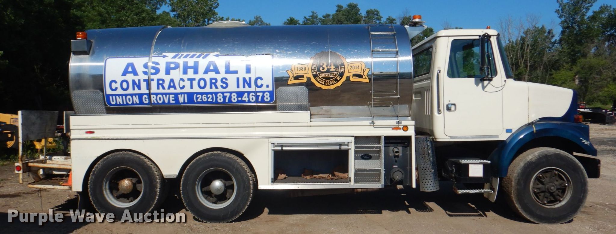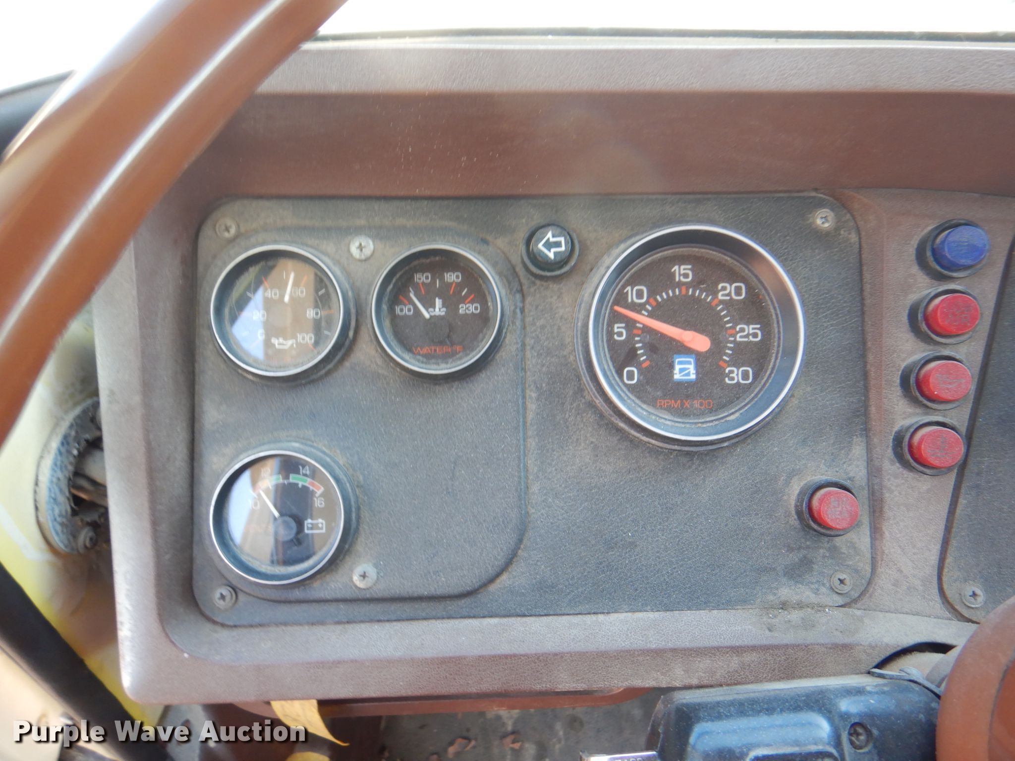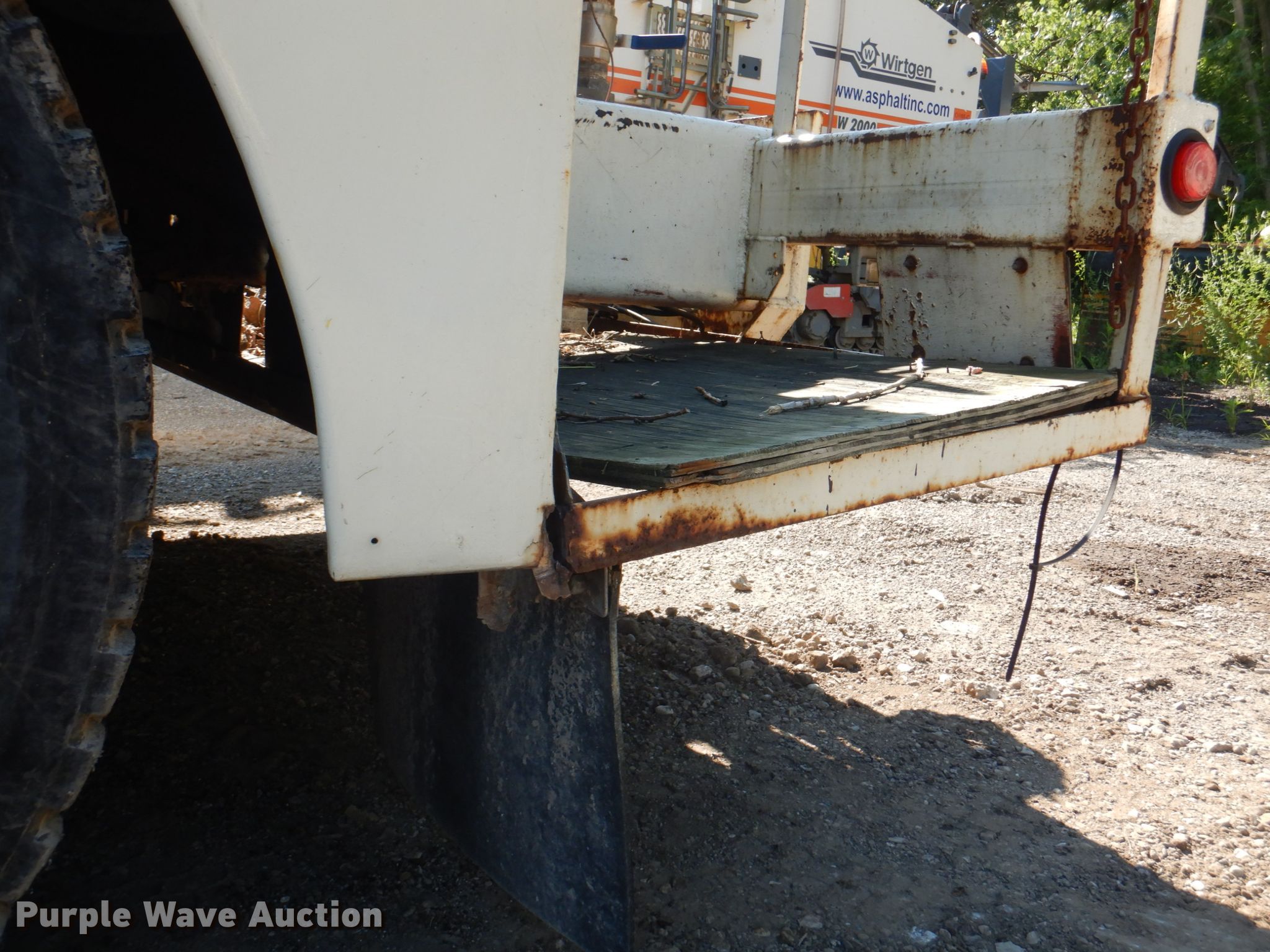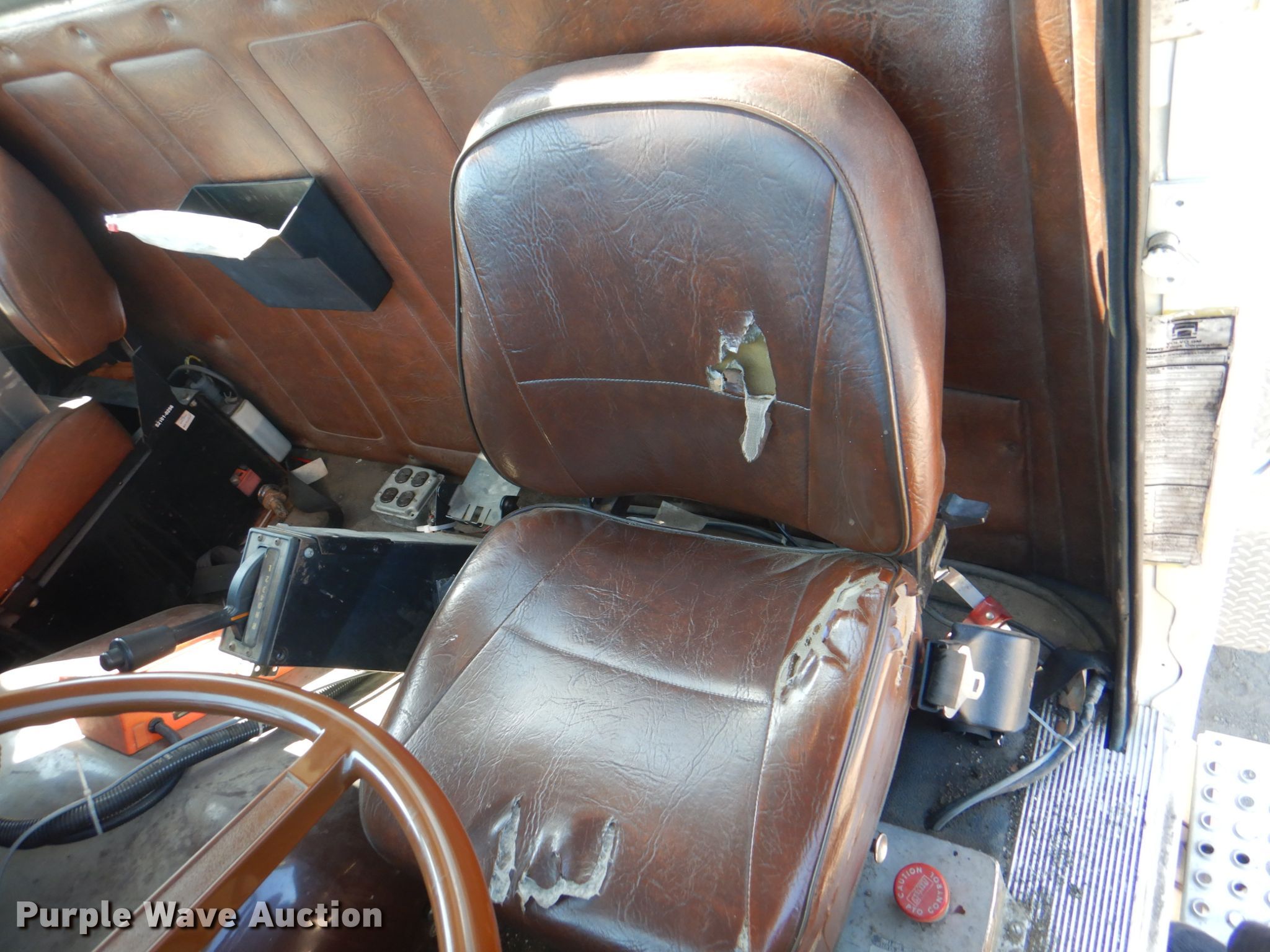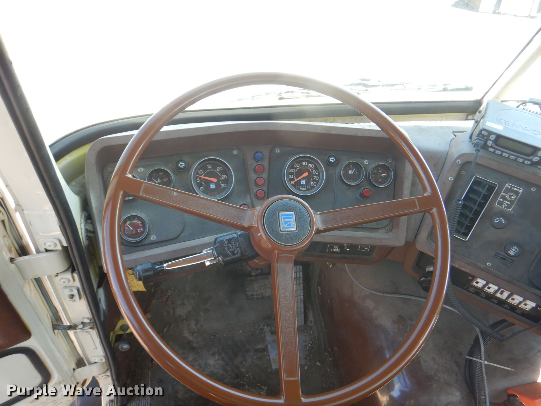 1989 White GMC WCS tank truck. 30,772 miles on odometer. Engine Caterpillar 33066B, Serial: 63Z13574, Displacement: 10.0L, Cylinders: 6, Fuel type: Diesel, HP: 270. Transmission Allison T-654C, Automatic. Chassis Axles: Tandem, Differential lock: Inter-axle, Suspension: Spring over walking beam, Brakes: Air, PTO. Interior Heat, Heated mirrors, Auxiliary controls. Operational Bed / tank US Tanker, 18' L x 95" W, Water tank Side discharge, Top fill, Rear drain: 2". Tires Front: 425/65R22.5, Rear: 11R22.5. Wisconsin title. 4V2ACBBDXKN616198. Asphalt Contractors, Inc... 21750 Durand Ave. Union Grove, WI 53182