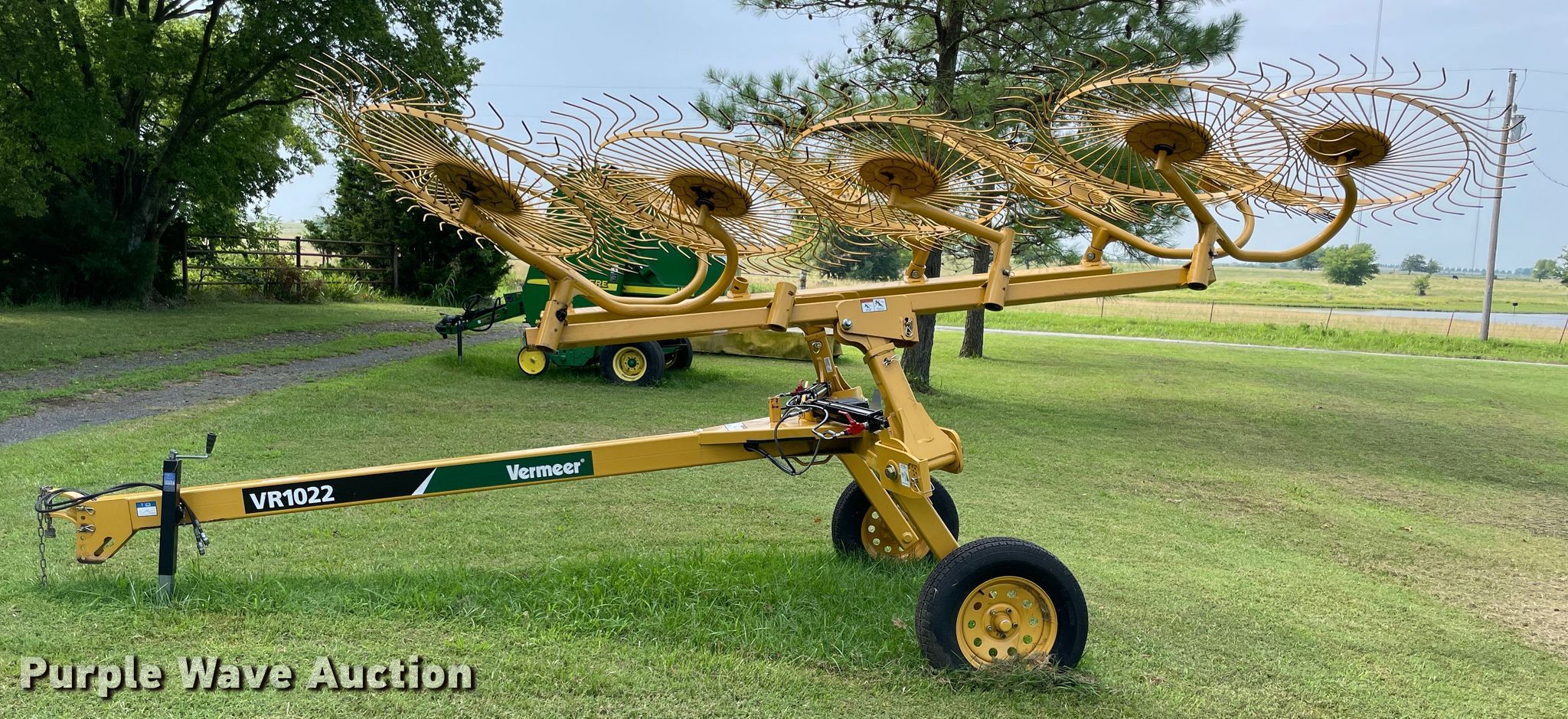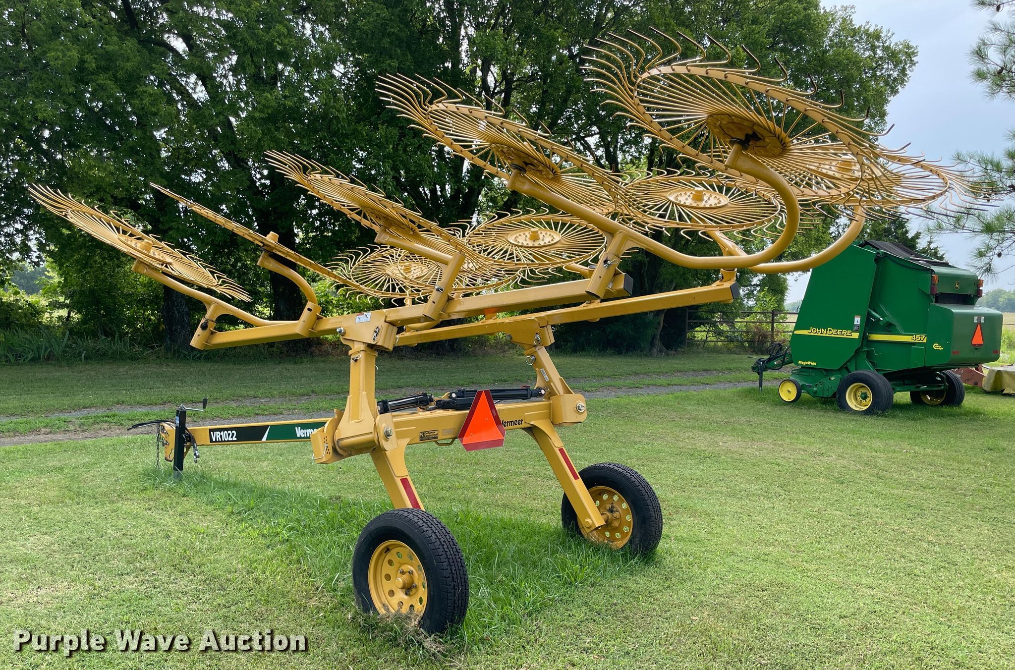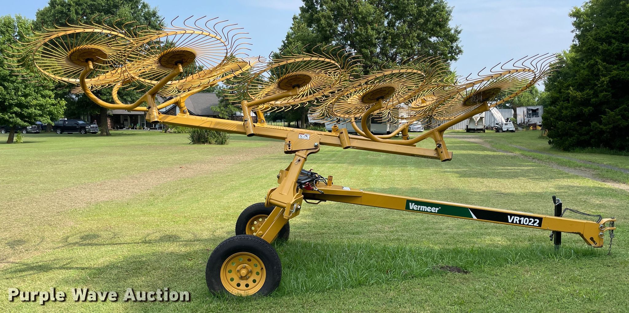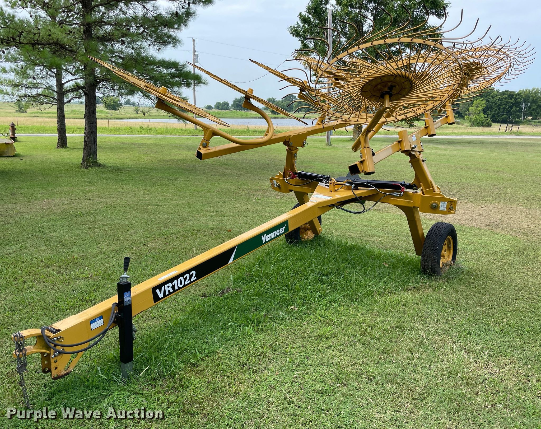 Purple Wave is selling a used Hay Rake in Oklahoma. This item is a Vermeer VR1022 hay rake with the following: 22'W, Hydraulic fold, ST205T/75R15 tires