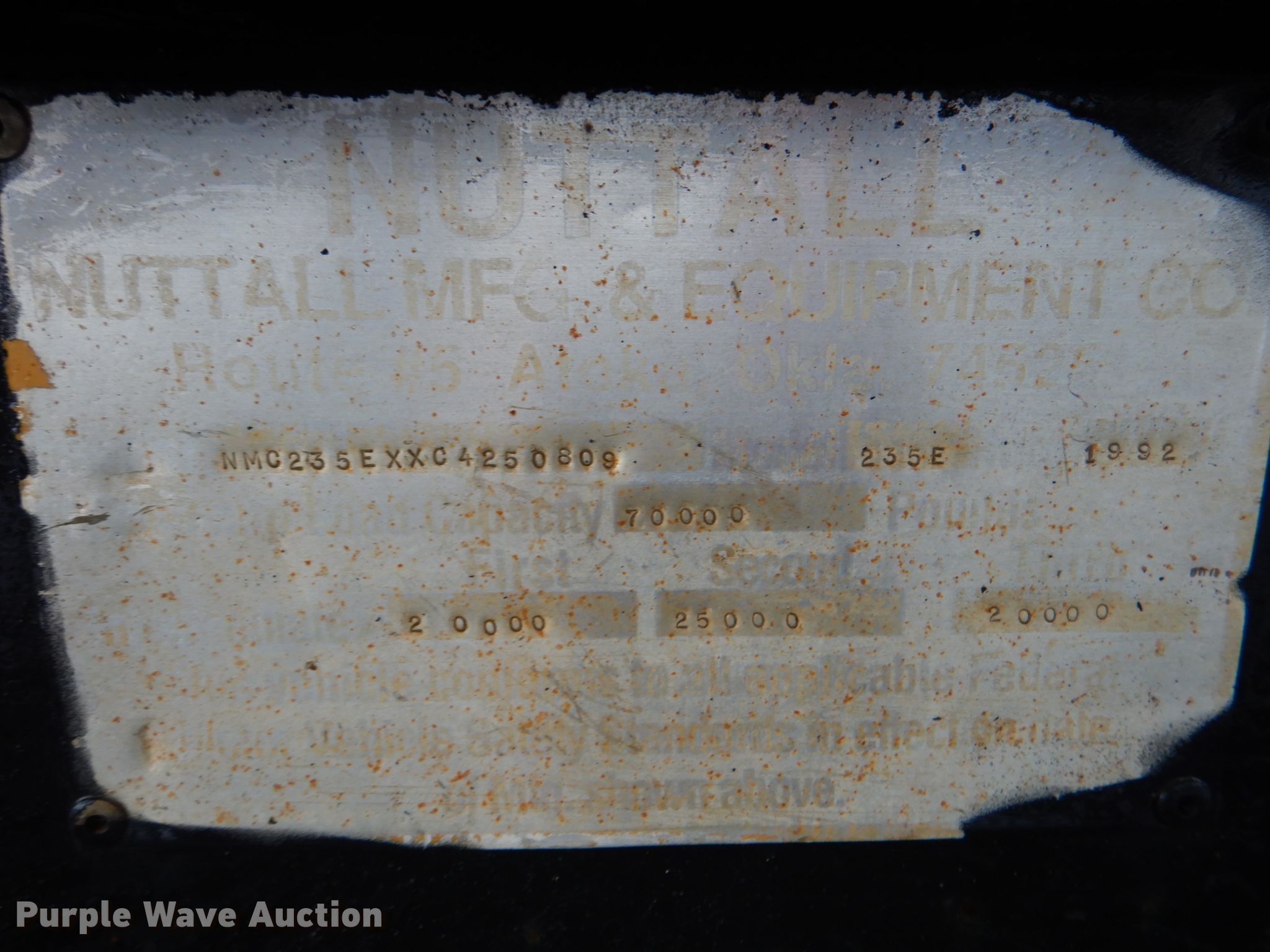 1992 Nuttal drop deck equipment trailer. Dimensions. Overall: 41' L x 102" W, Deck: 30' 7" L x 102" W, Top deck length: 10', Tail length: 3', Ramps: Manual Length: 4'. Operational Deck type: Steel, Wood. Chassis Landing gear: Dual, Suspension: Spring, Brakes: Air, Axles: Tandem, GVWR: 70,000 lbs. Tires Size: 255/70R22.5. Oklahoma title. Title distribution may be delayed up to 14 days from verification of funds. NMC235EXXC4250809. Shawn Gibson. Bennington, OK 74723