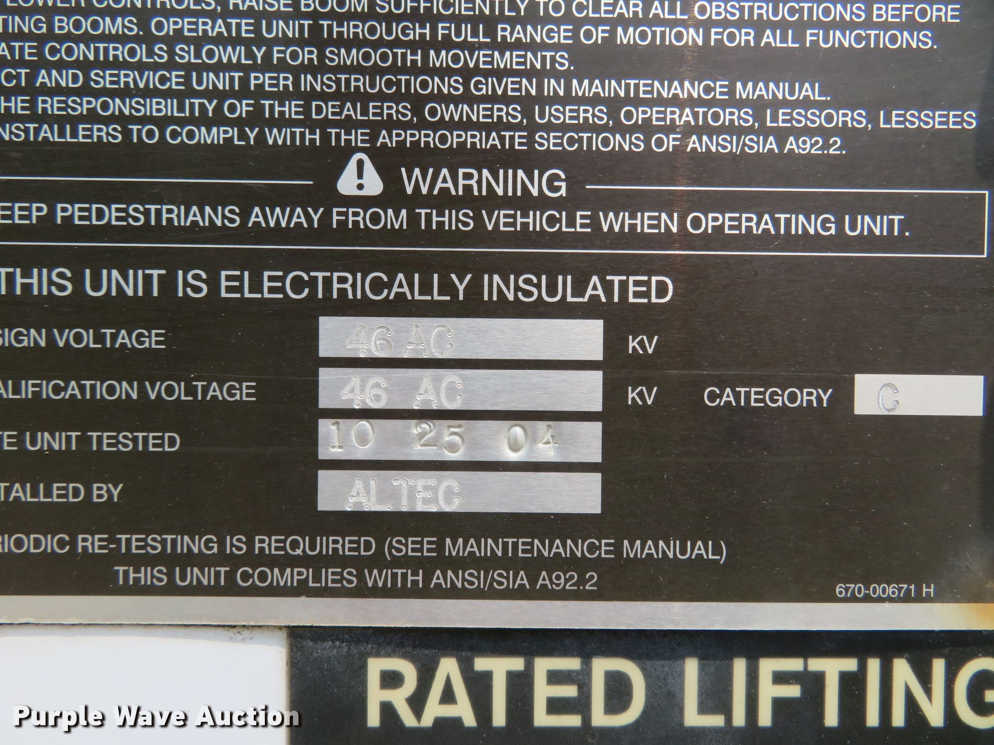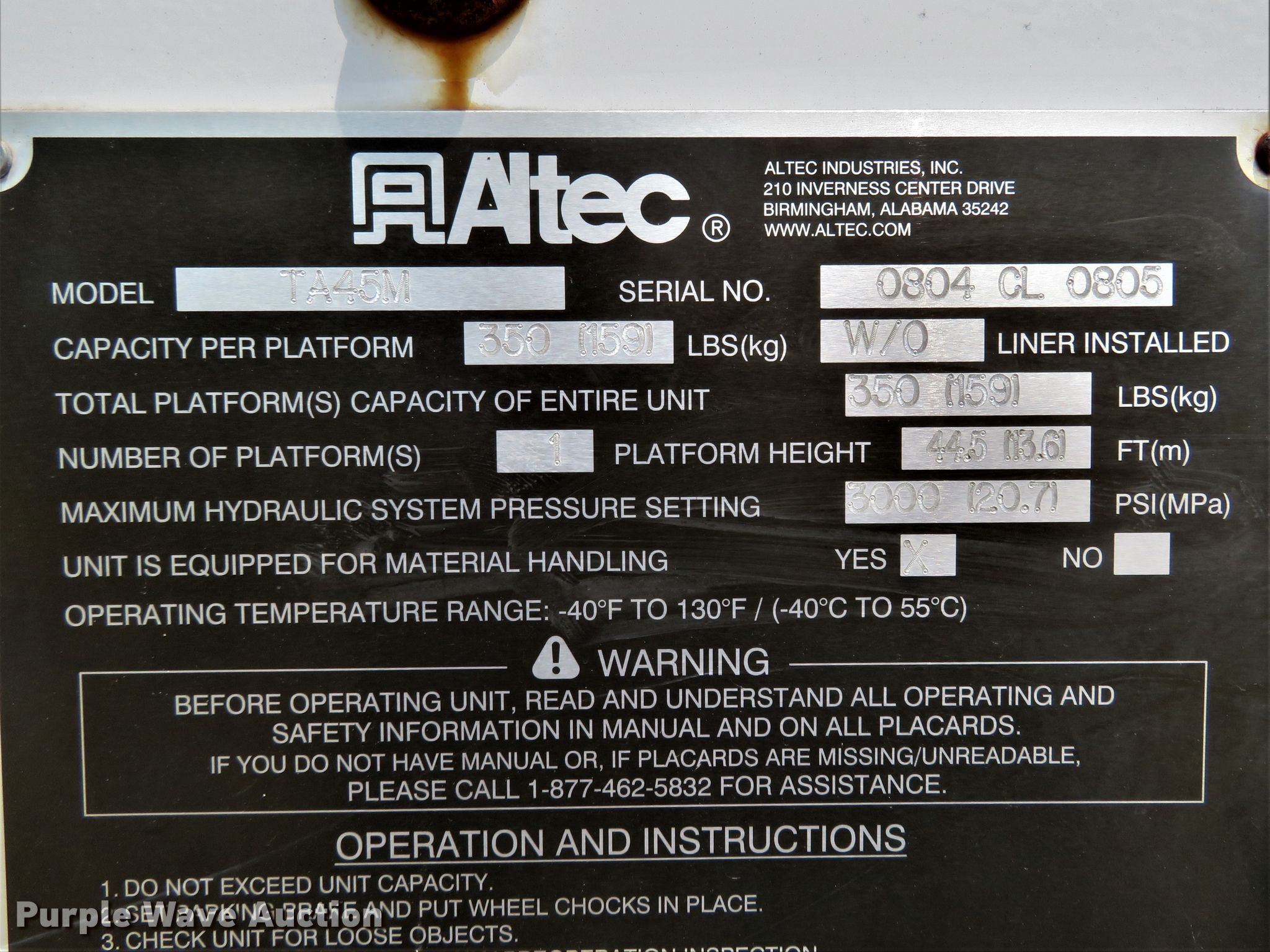 2003 Freightliner FL70 bucket truck. 133,287 miles on odometer, Engine hours: 9,542. Engine Caterpillar 3126, Displacement: 7.2L, Cylinders: 6, Fuel type: Diesel, HP: 250. Transmission Allison, Automatic. Chassis Axles: Single, Suspension: Spring, Brakes: Air, PTO, GVWR: 31,000 lbs, Wheelbase: 150". Interior AC, Heat, Cruise control, Brake controller. Operational Bed Altec, 11' L, Boom Altec TA45M, Serial: 0804CL0805, Maximum lift capacity: 350 lbs, Maximum lift height: 44.5', Boom type: Articulating, Insulated, Telescopic, Man basket, Boom controls Ground, Platform/ basket.. Tires Size: 11R22.5. Notes Tools not included, Contents not included. Missouri title. Title distribution may be delayed up to 30 days from verification of funds. 1FVABTAK93HK87073. Gaebe Contracting. 108 Metrocom Dr. Pacific, MO 63069