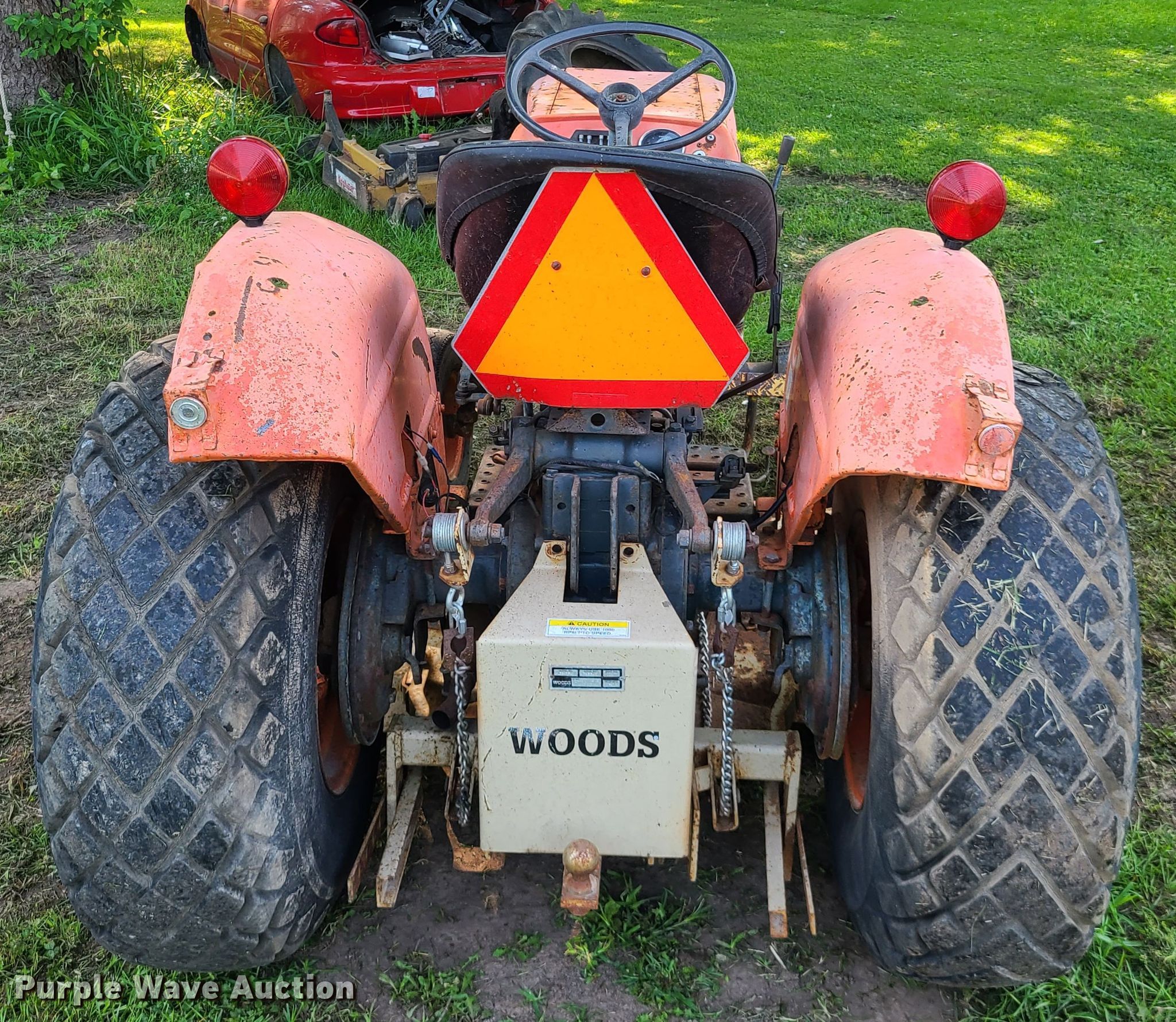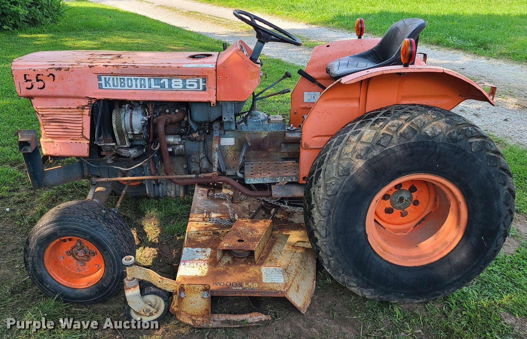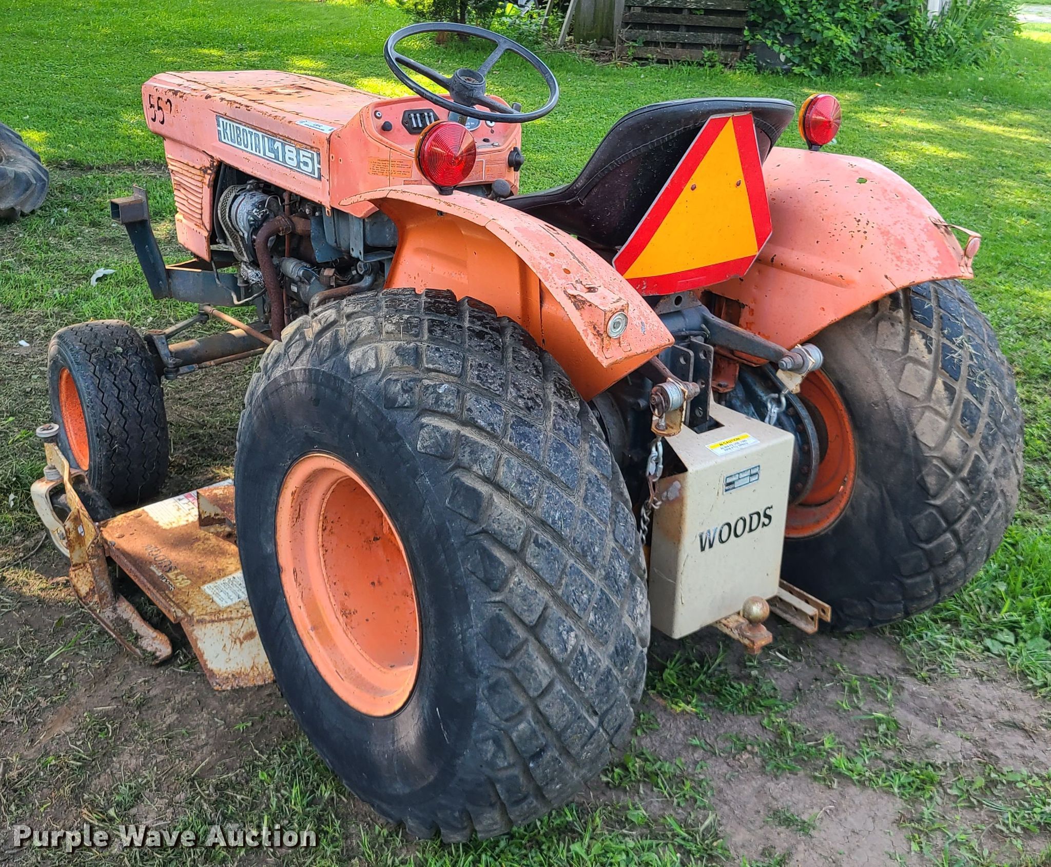 Kubota L185 tractor. 4,151 hours on meter. Engine Cylinders: 2, Fuel type: Diesel. Transmission Manual, 8F - 2R. Operational Mid-mounted mower Woods, Cutting width: 60". Tires Front: 20.5x8x10, Rear: 13.6-15. 108 S Lee St. Leeton, MO 64761
