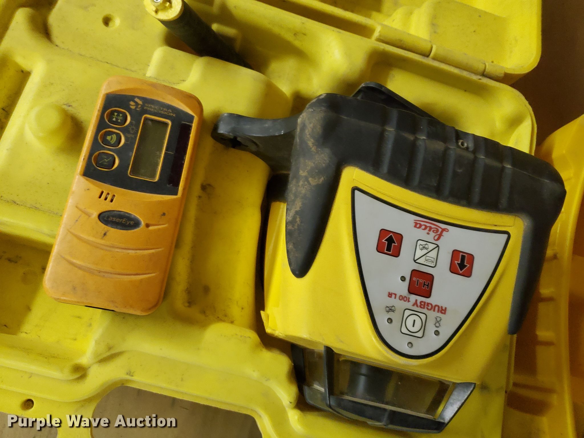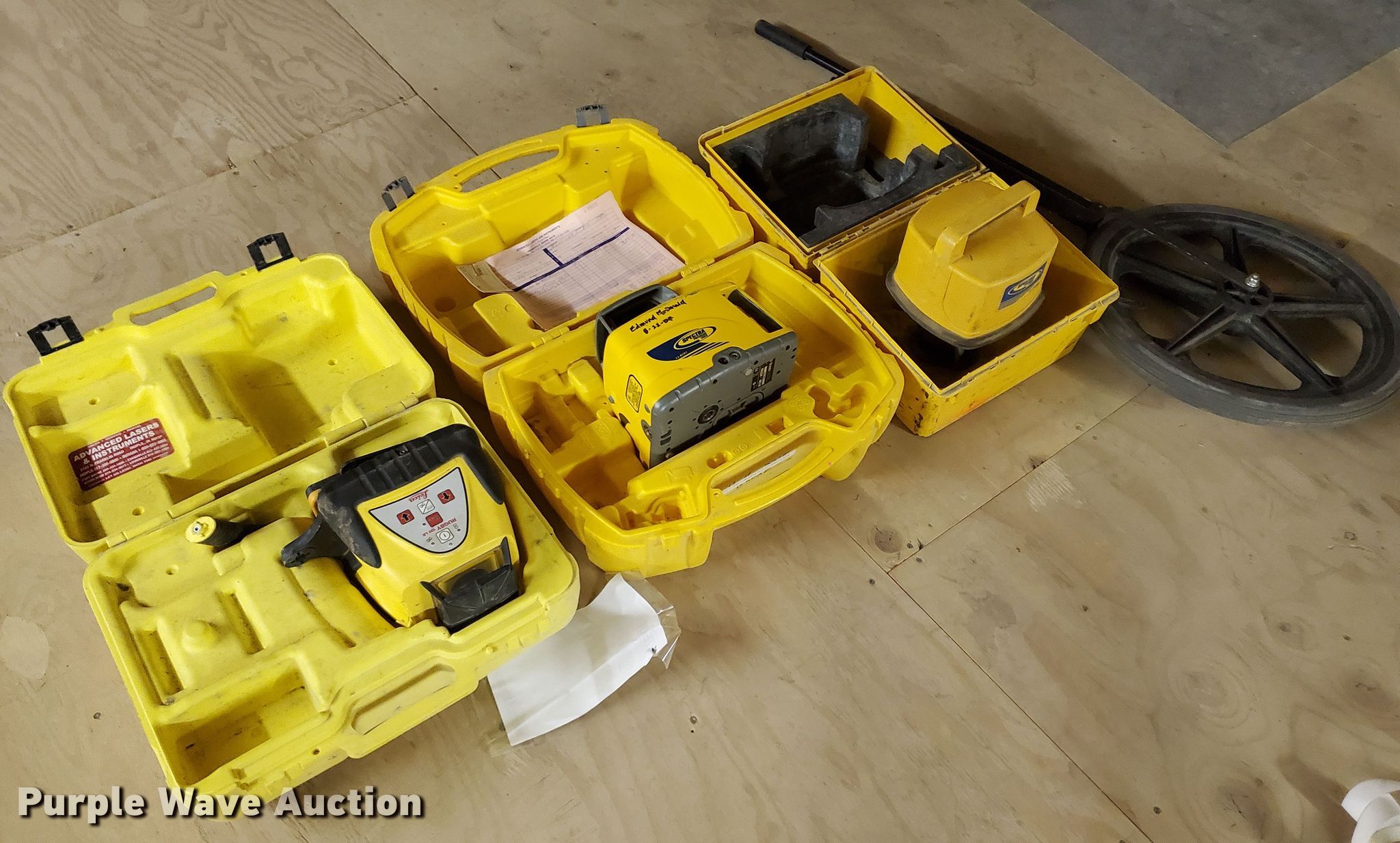 Purple Wave is selling a used Surveying Equip. in Kansas. This item is a Surveying equipment with the following: Leica Rugby 100LR laser level, Spectra LL400 laser level, Spectra LL500 laser level, Measuring wheel, Non-operational unit