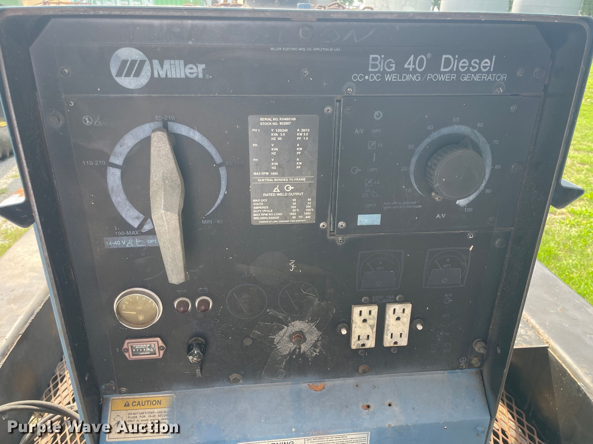 Miller Big 40 welder/generator. 769 hours on meter, Serial: KH460149. Engine Fuel type: Diesel. Operational Welder Capabilities: CC, DC, Leads, Generator kVA: 3, Phase: Single, 120V outlets: 4. Transfer of ownership documentation will be a bill of sale. KH460149. Wagner & Sons Trucking. 50300 E 90th Rd. Miami, OK 74354