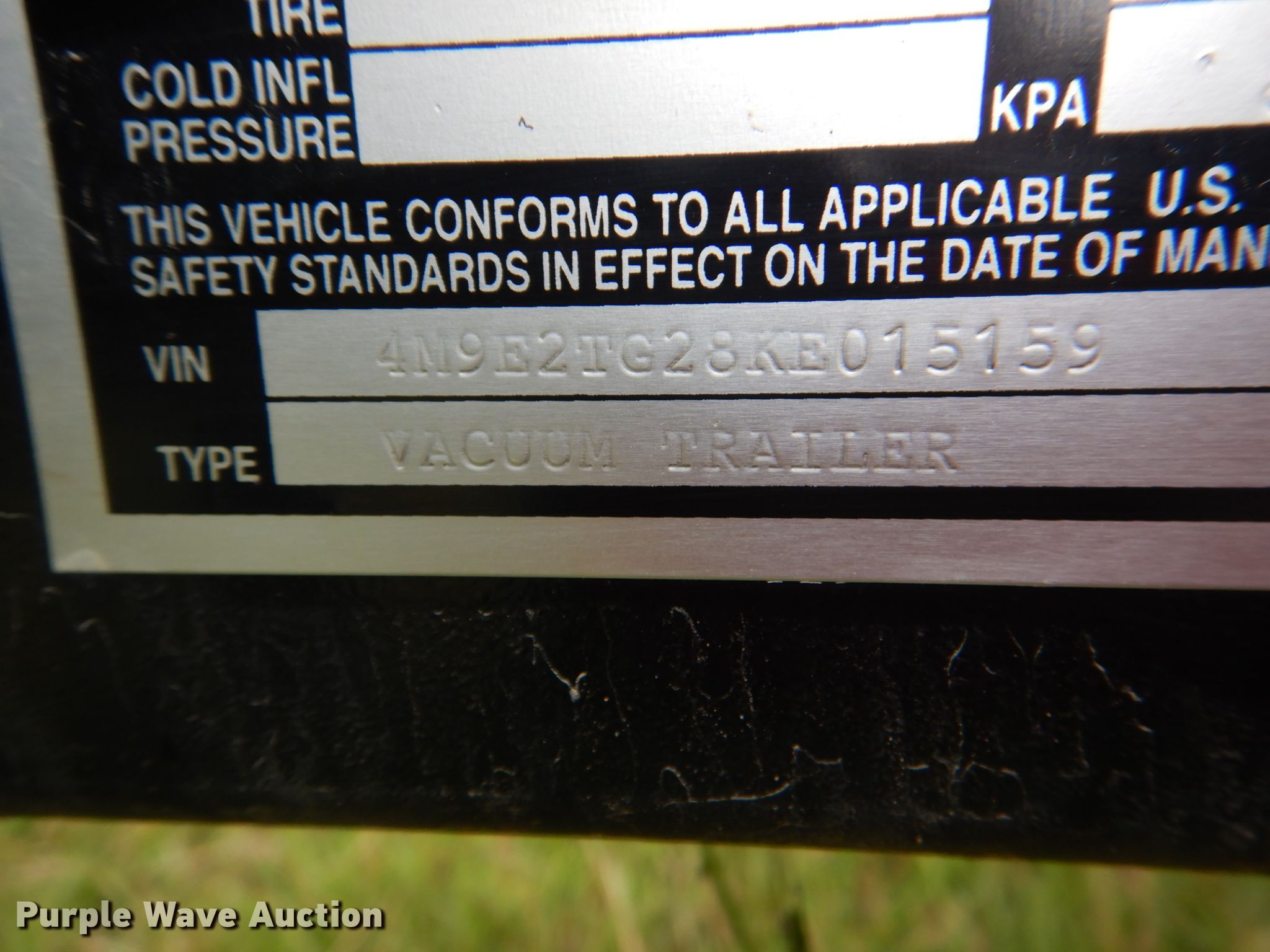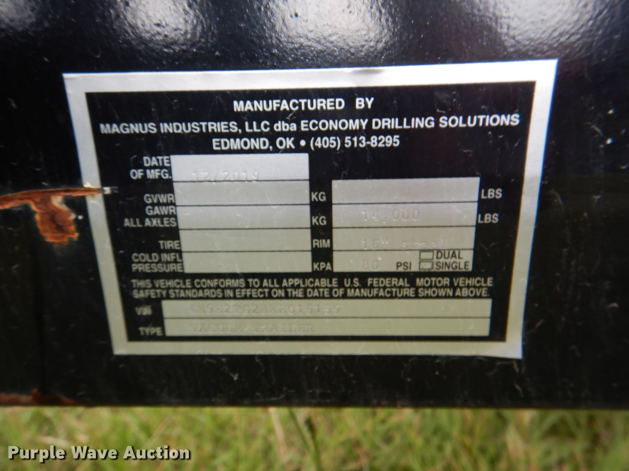 Magnus Vac LKT800D vacuum excavator. Engine. Kohler, Fuel type: Diesel, HP: 24. Operational Spoils tank Capacity: 800 gallons, Water tank Capacity: 225 gallons, Water pump Piston Pressure Pump, GPM: 4, PSI: 4,000, Vacuum pump Battioni MEC8000, Outlet valve size: 3", Reverse flow, Suction hose. Trailer 2019 Magnus, 20' L x 91" W, Suspension: Spring, Brakes: Electric, Axles: Tandem, Tire size: ST235/80R16, GVWR: 14,000 lbs. Transfer of ownership documentation will be a bill of sale. 4M9E2TG28KE015159. Shawn Gibson. Bennington, OK 74723