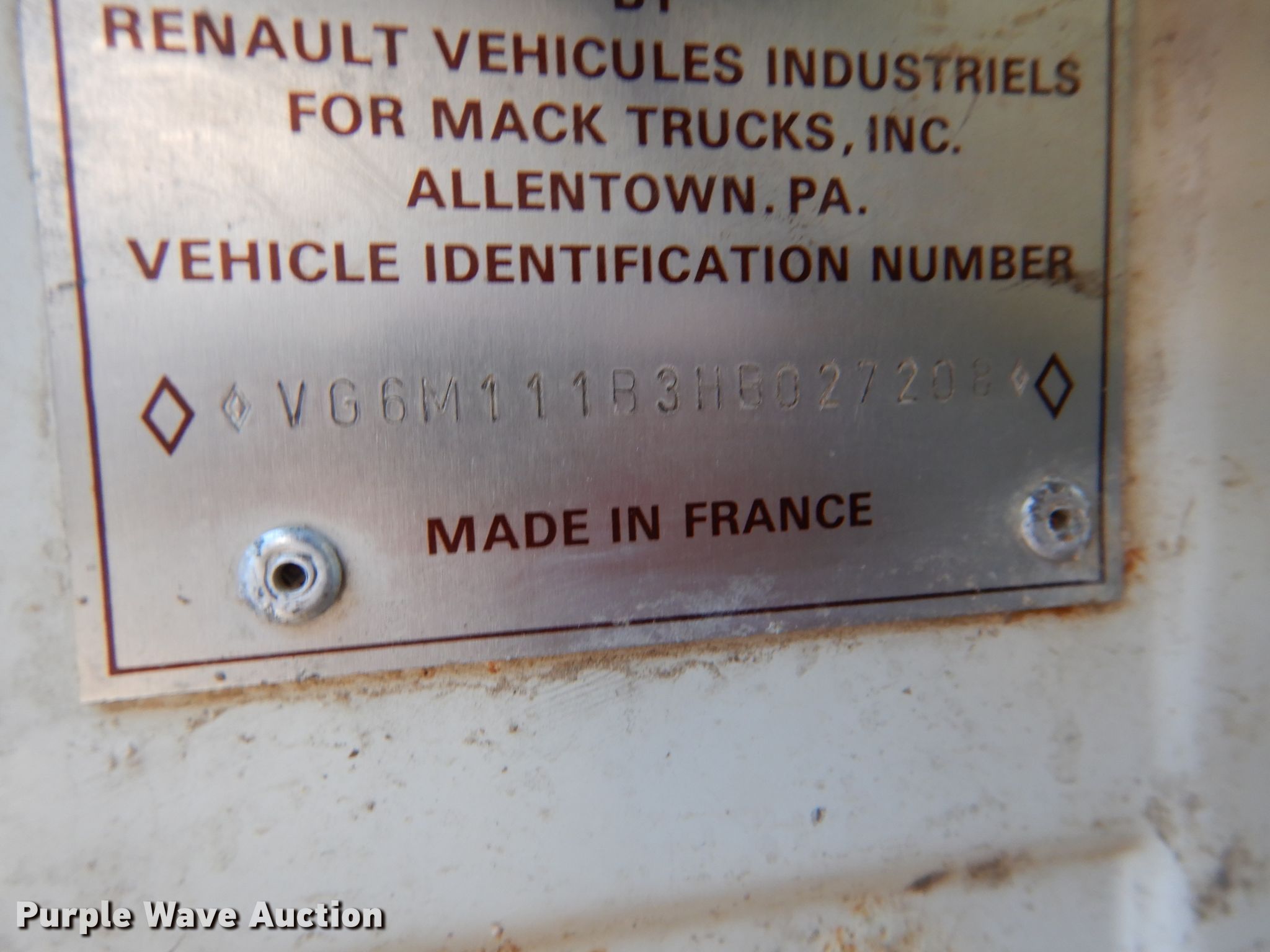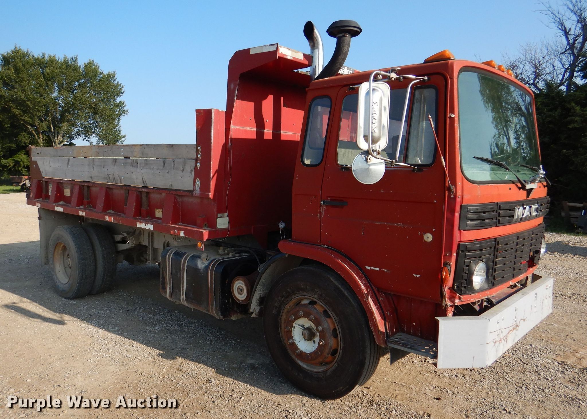 1987 Mack MS200P dump truck. 304,331 miles on odometer. Engine Renault, Displacement: 6.5L, Cylinders: 6, Fuel type: Diesel. Transmission Manual, Speed: 5. Chassis Axles: Single, Suspension: Spring, Brakes: Air, PTO. Interior Heat, Brake controller. Operational Dump bed Galio, 14' L x 95" W, Side height: 13", Side board height: 16", Bed type: Steel, Ram: Single , End gate: Manual. Tires Front: 11R22.5, Rear: 275/80R22.5. Notes Contents of bed not included, Non-operational fuel gauge. Kansas title. VG6M111B3HB027208. Price Excavating. Baldwin City, KS 66006