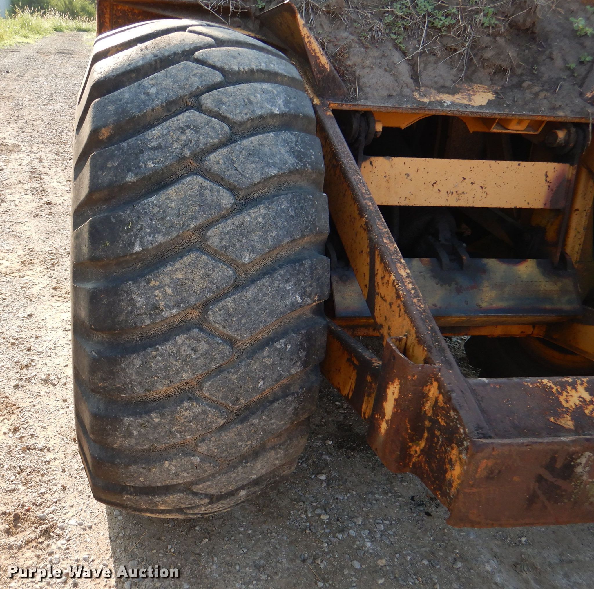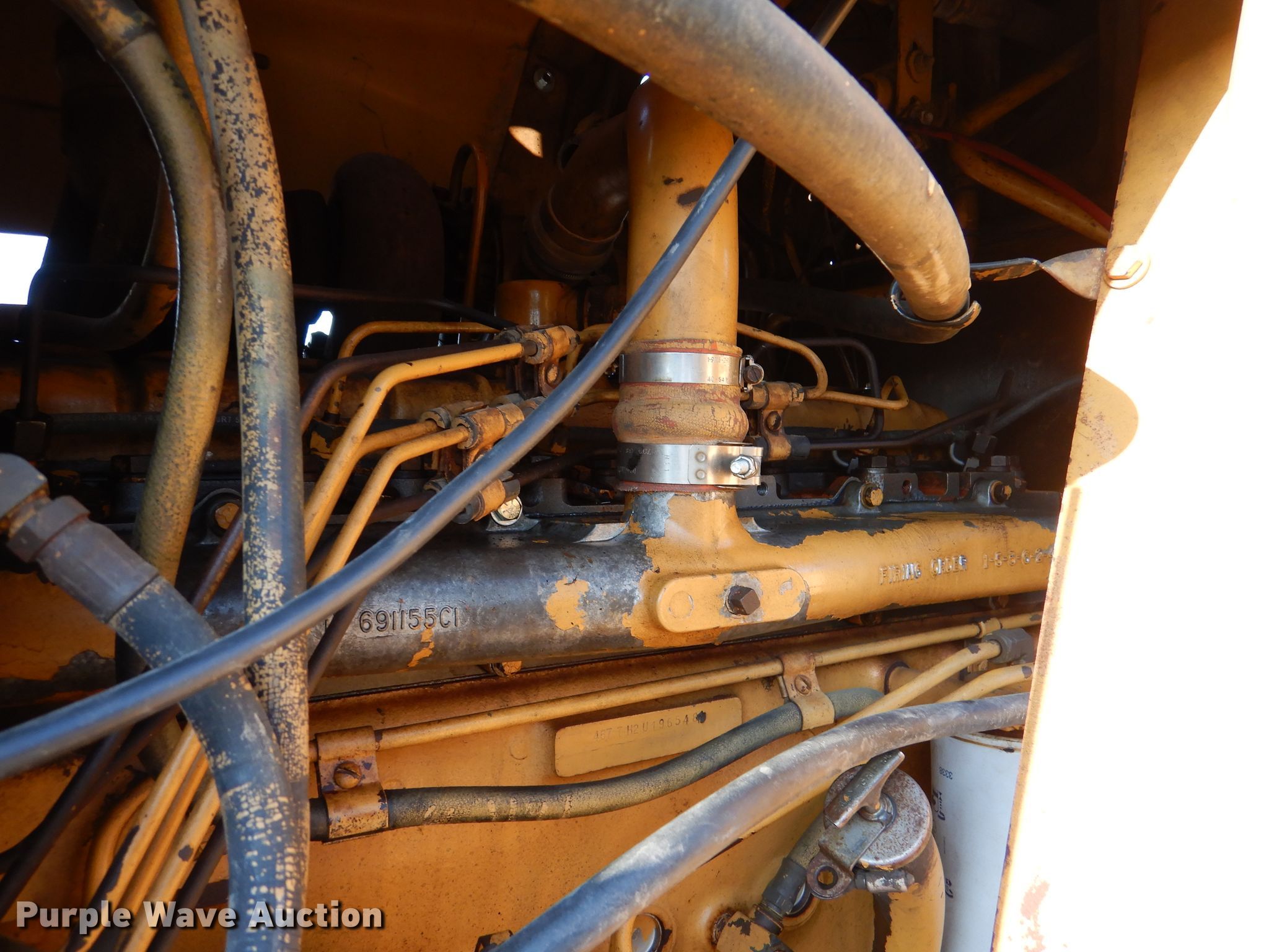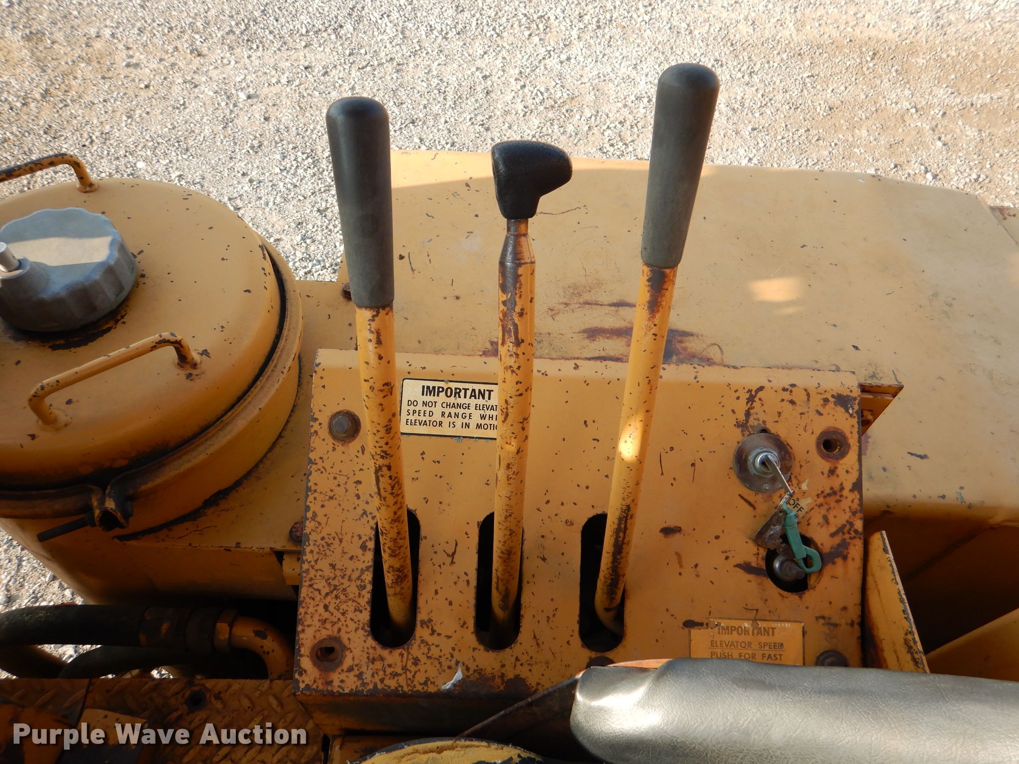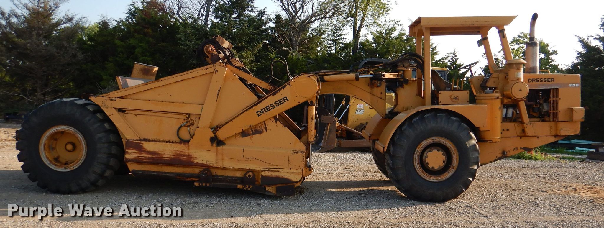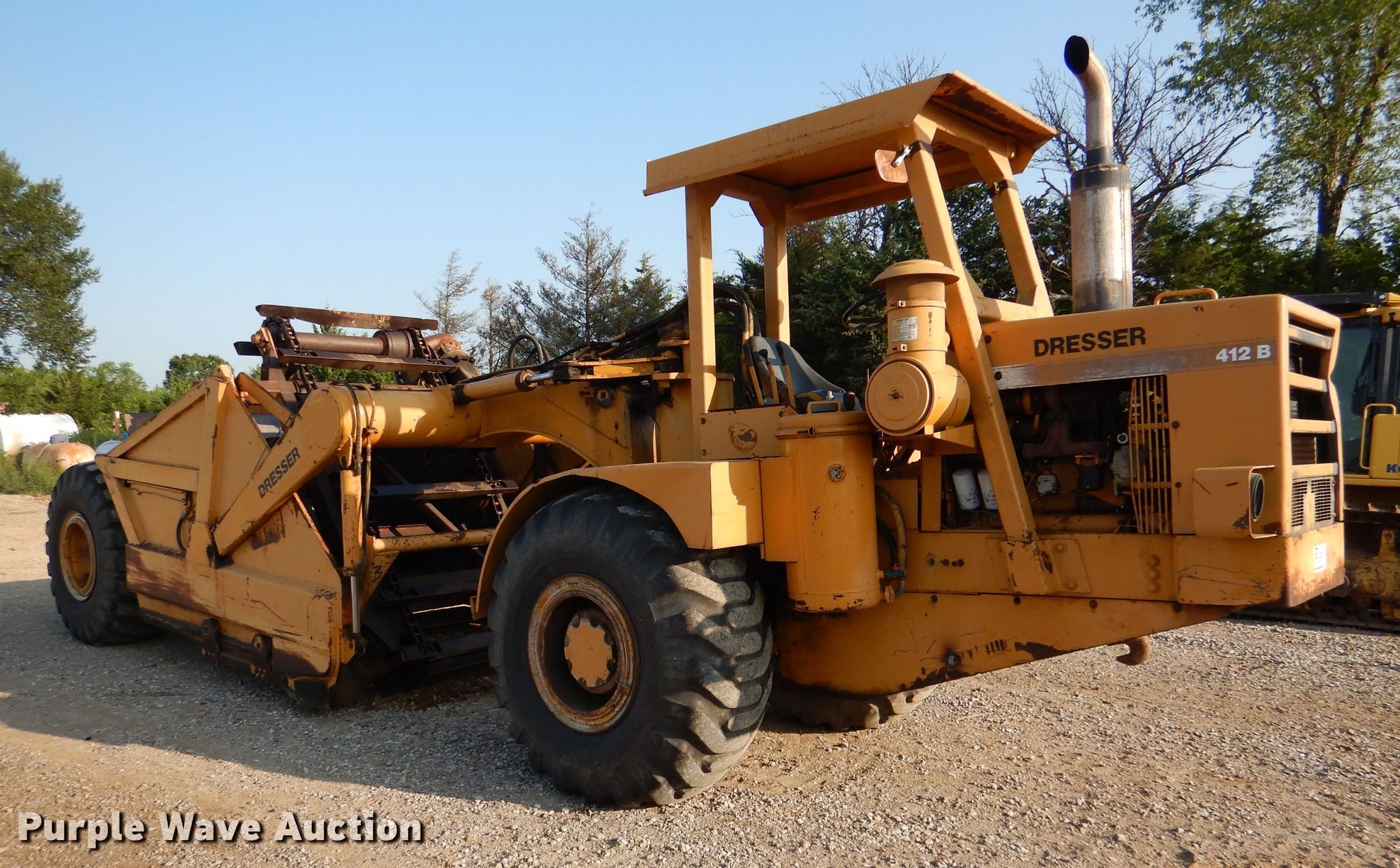 International 412B elevating scraper. 330 hours on meter, Serial: 5420114U016565. Engine International DT466, Serial: 467TH2U196548, Cylinders: 6, Fuel type: Diesel. Transmission Powershift, 4F - 1R. Operators station OROPS. Operational Bowl capacity: 13.1 cu.yd., Reversible cutting edge, Elevator reverse, Hydraulic lift, Scraper controls: Lever controls No. of controls: 3. Tires Size: 23.5-25. Notes Non-operational tachometer, Non-operational brakes , Missing brake components. Price Excavating. Baldwin City, KS 66006