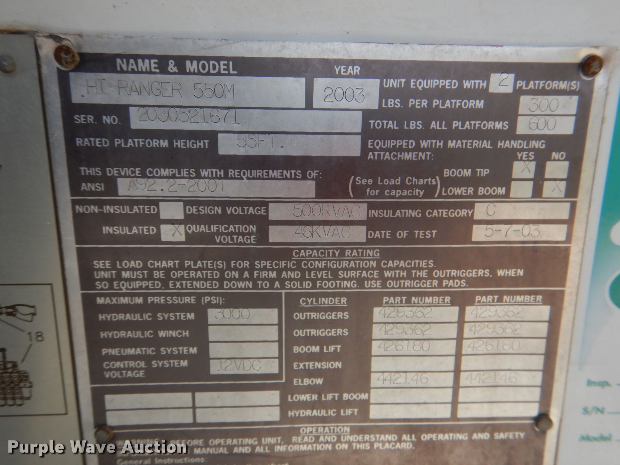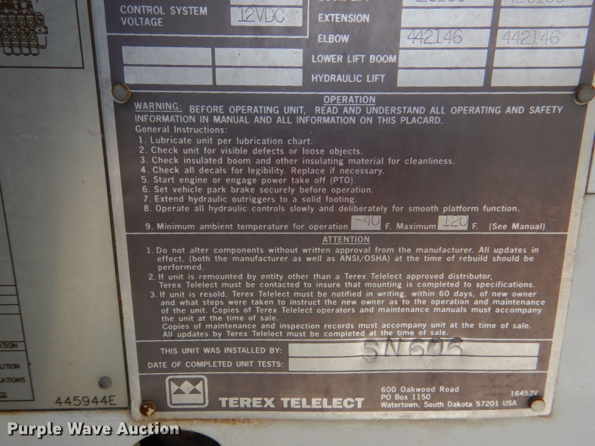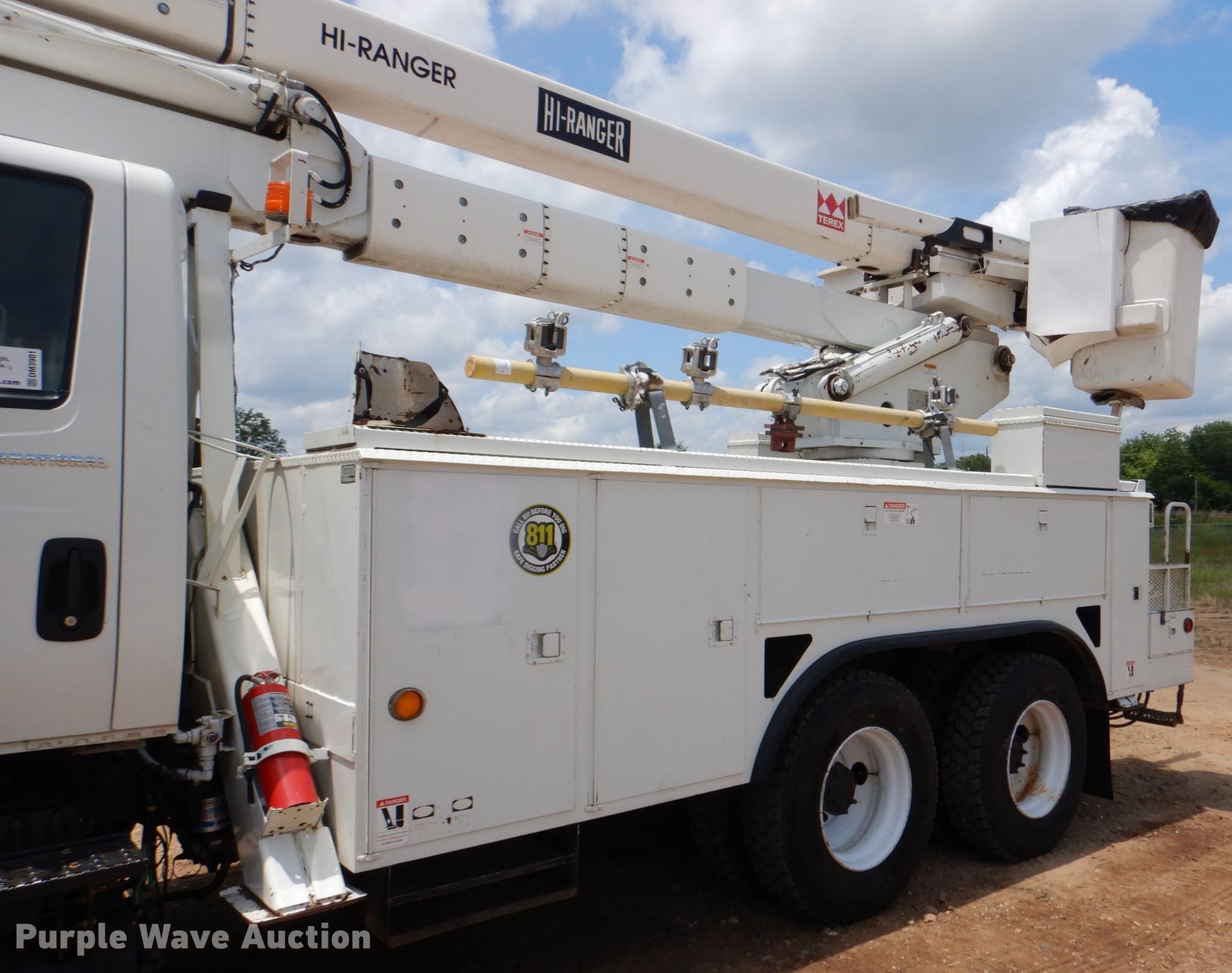 2004 International 7400 bucket truck. 90,006 miles on odometer, Engine hours: 6,548. Engine International/Navistar DT530, Displacement: 8.7L, Cylinders: 6, Fuel type: Diesel. Transmission Eaton Fuller, Manual, Speed: 10. Chassis Four wheel drive, Axles: Tandem, Suspension: Spring over walking beam, Brakes: Air, PTO, Wheelbase: 198". Interior AC, Heat. Operational Bed Terex IN08158, 15' 7" L, Boom 2003 Hi-Ranger 550M, Serial: 2030521671, Boom length: 27', Maximum lift capacity: 600 lbs, Maximum lift height: 55', Boom type: Articulating, Man basket, Boom controls Ground, Platform/ basket, Material handler, Front mounted winch 3,000 lbs max capacity. Tires Front: 315/80R22.5, Rear: 11R22.5. Oklahoma title. 1HTWGADT44J081765. 392 Sweet Home Rd. Broken Bow, OK 74728