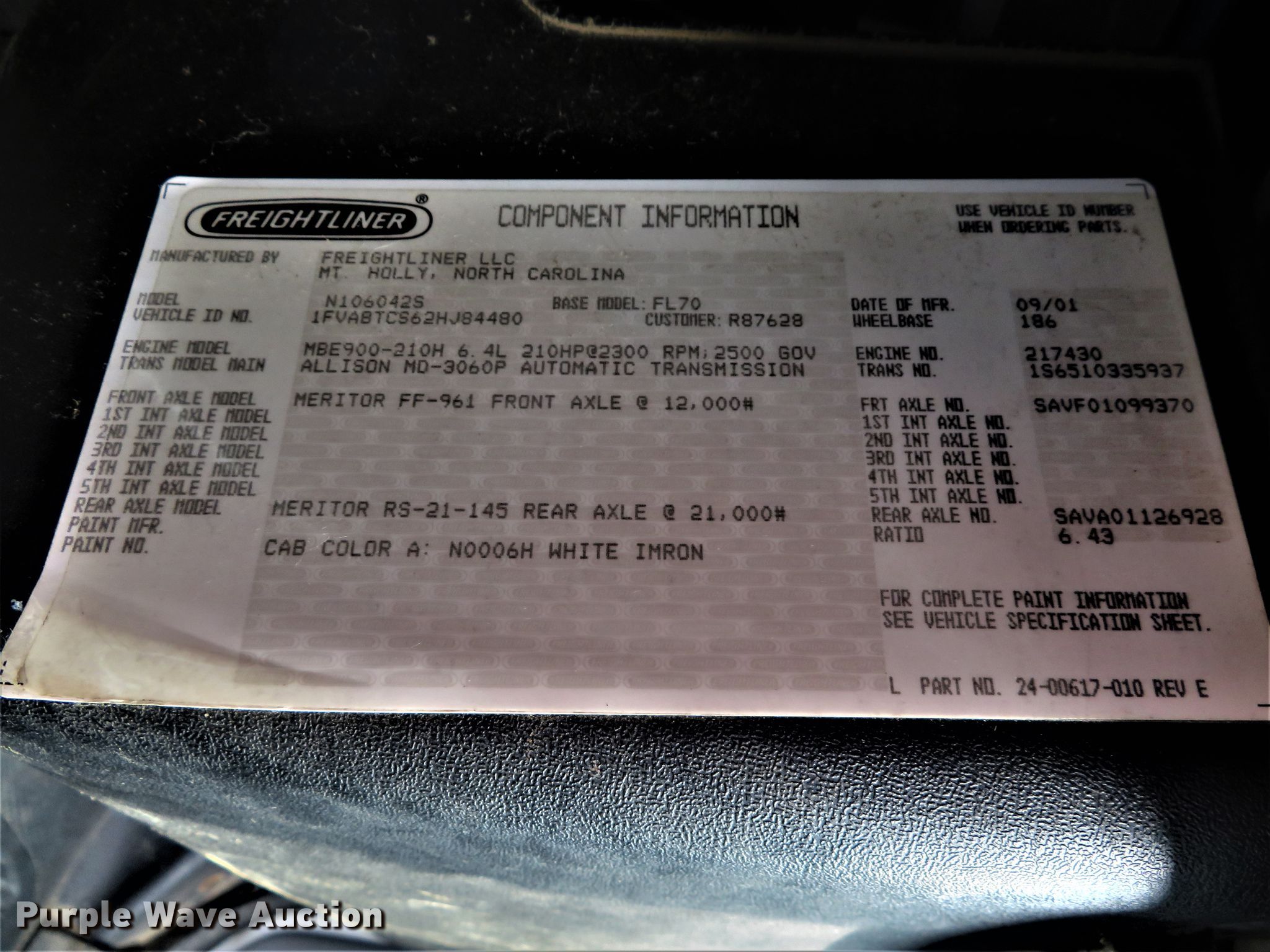 2002 Freightliner FL70 crane truck. 20,986 miles on odometer. Engine Mercedes-Benz OM906, Displacement: 6.4L, Cylinders: 6, Fuel type: Diesel, HP: 210. Transmission Allison MD-3060P, Automatic. Chassis Axles: Single, Suspension: Spring, Brakes: Air, GVWR: 33,000 lbs, Wheelbase: 186". Interior AC, Heat, Brake controller. Operational Flatbed Knapheide PVMXT-123C, 12' L x 96" W, Side height: 14", Crane Weldco Hydra-Lift HL800 Serial: 3-38506-1, Telescopic, Sections: 2, Maximum lift capacity: 16,000 lbs, Boom controls Ground, Crane ball & hook, Lift chart. Tires Size: 11R22.5. Missouri title. Seller is a Missouri licensed motor vehicle dealer. Title will be assigned and distributed by the dealer. Please contact the seller for distribution questions. Title distribution may be delayed up to 30 days from verification of funds. 1FVABTCS62HJ84480. Northpoint Enterprises, LLC. Troy, MO 63379