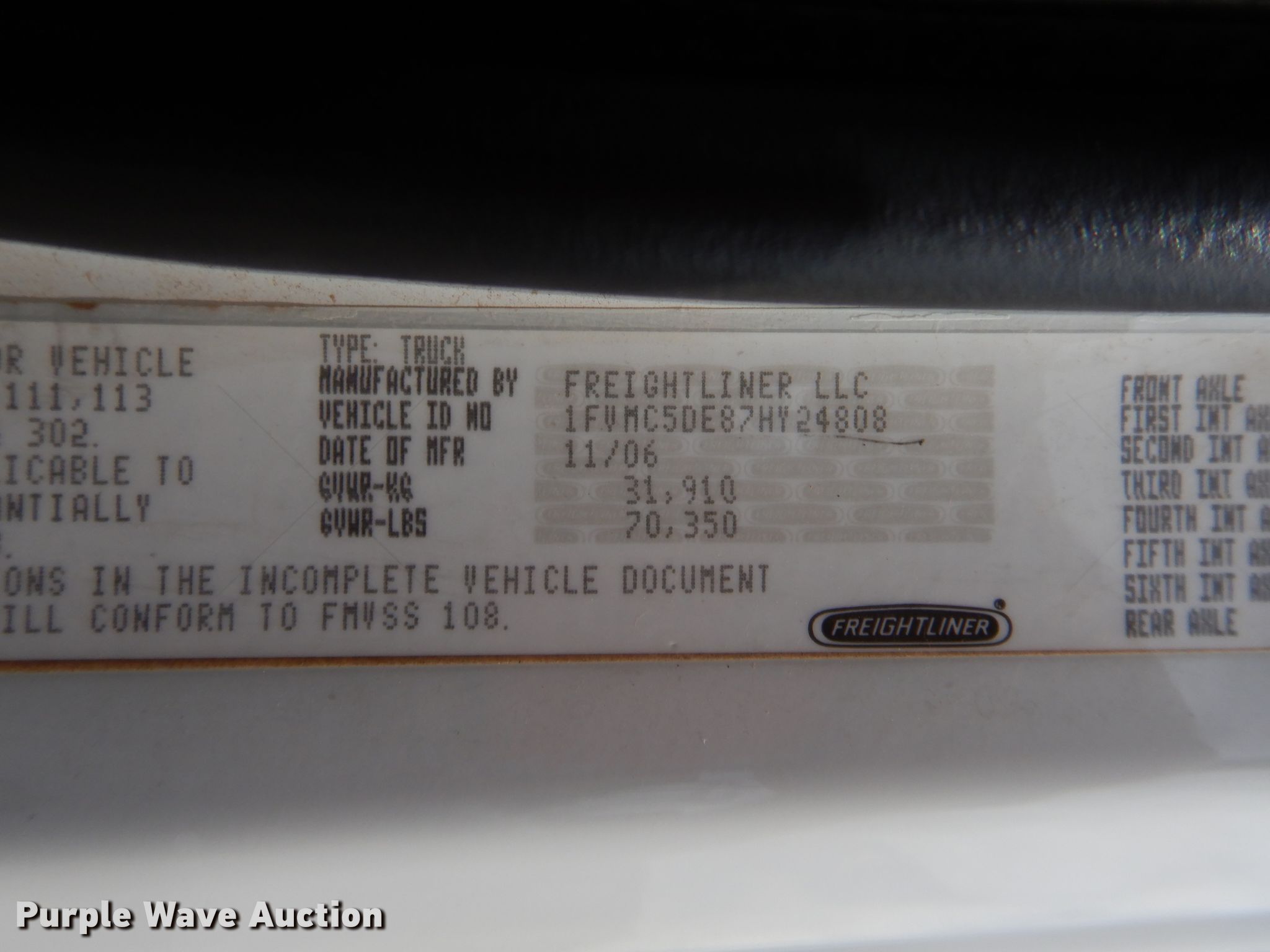 2007 Freightliner Business Class M2 dump truck. 341,791 miles on odometer. Engine Caterpillar C13, Displacement: 12.5L, Cylinders: 6, Fuel type: Diesel. Transmission Allison, Automatic. Chassis Double frame, Axles: Tandem, Pusher axle, Differential lock: Full, Suspension: Air, Dump valves, Brakes: Air, PTO, GVWR: 70,350 lbs FAWR: 18,000 lbs, RAWR: 40,000 lbs, Lift axle GAWR: 12,000 lbs. Interior AC, Heat, Cruise control. Operational Dump bed 19' 6" L x 96" W, Side height: 46", Bed type: Steel, Roll tarp, Ram: Single , End gate: Air operated. Tires Size: 11R22.5. Notes Dash warning indicator: Check engine, ABS. Oklahoma title. Title distribution may be delayed up to 30 days from verification of funds. 1FVMC5DE87HY24808. 500 N Bryant Ave. Oklahoma City, OK 73117