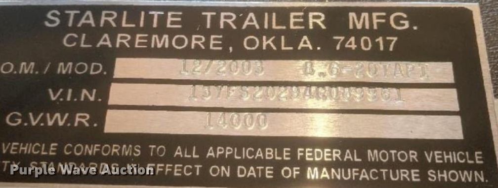 Purple Wave is selling a used Equip. Trailer in Missouri. This item is a 2004 Starlite Trailers flatbed trailer with the following: Overall: 25' L x 102' W, Deck: 20' L x 102' W