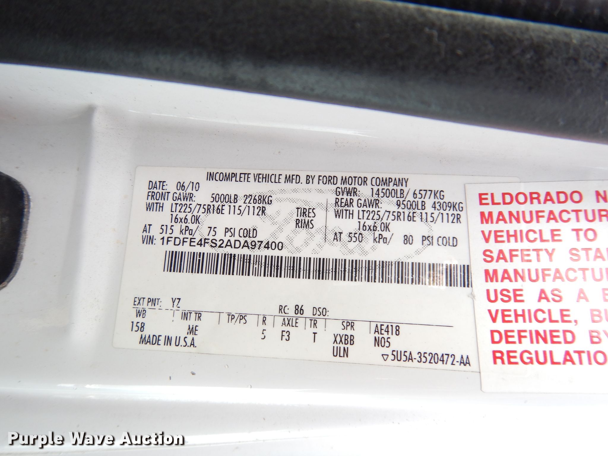 2010 Ford E450 Super Duty ElDorado shuttle bus. Unknown miles on odometer, Unit #: 751. Engine Displacement: 6.8L V10 SOHC 20V, Cylinders: 10, Fuel type: Gas. Transmission Manual. Chassis Axles: Single, Suspension: Spring, Brakes: Hydraulic, GVWR: 14,500 lbs, Wheelbase: 176". Interior AC, Heat, Electric passenger sliding door, Passengers: 6, Seats, Wheelchair lift. Tires Size: 225/75R16, Brand: Firestone. Notes Decals will be removed or painted over, No battery , Parts only unit , Unit must be towed or hauled, Non-operational unit. Kansas title. Title distribution may be delayed up to 14 days from verification of funds. Mileage has not been verified. Odometer discrepancy will be marked on the title. 1FDFE4FS2ADA97400. Lawrence, KS 66044