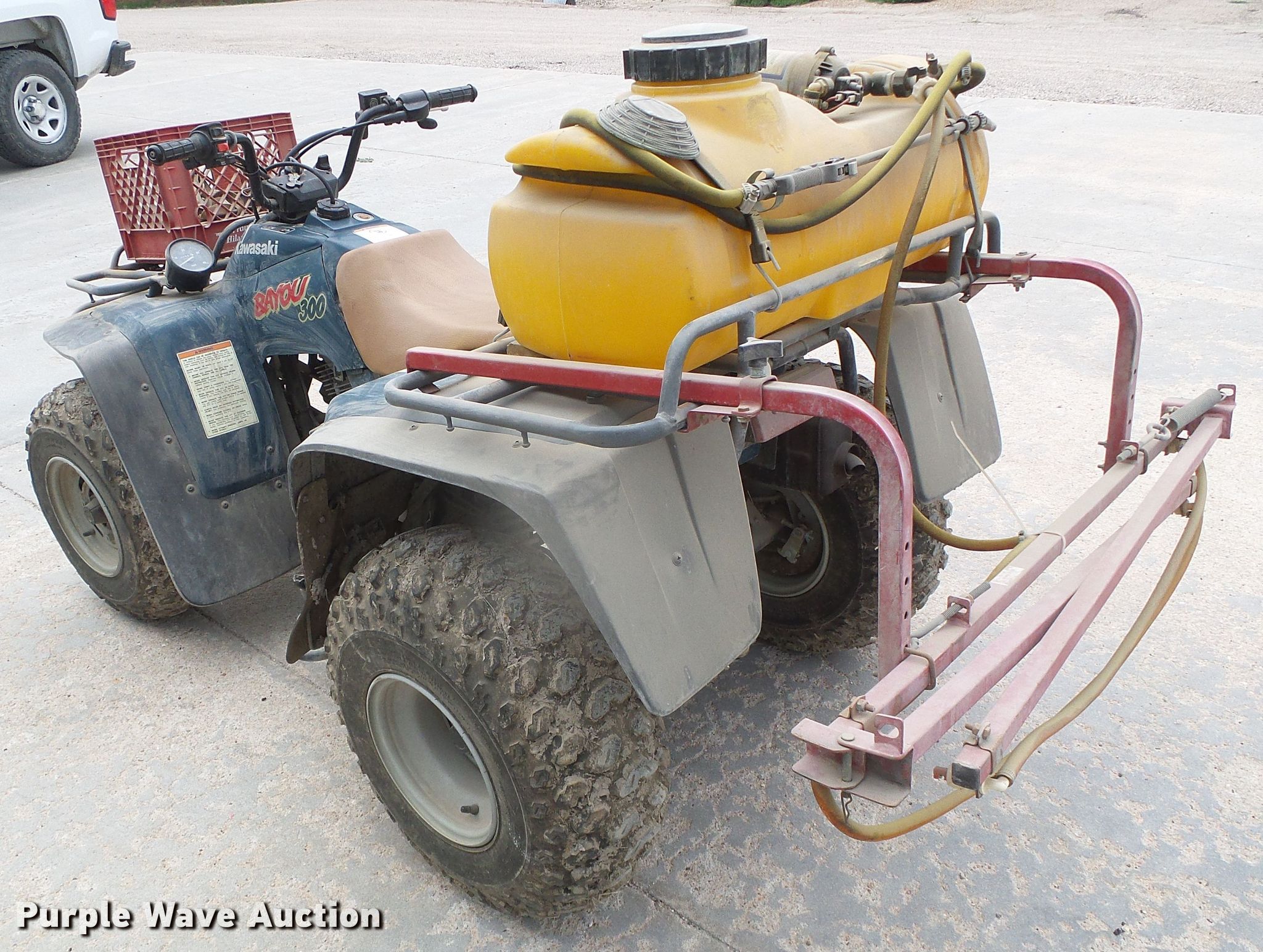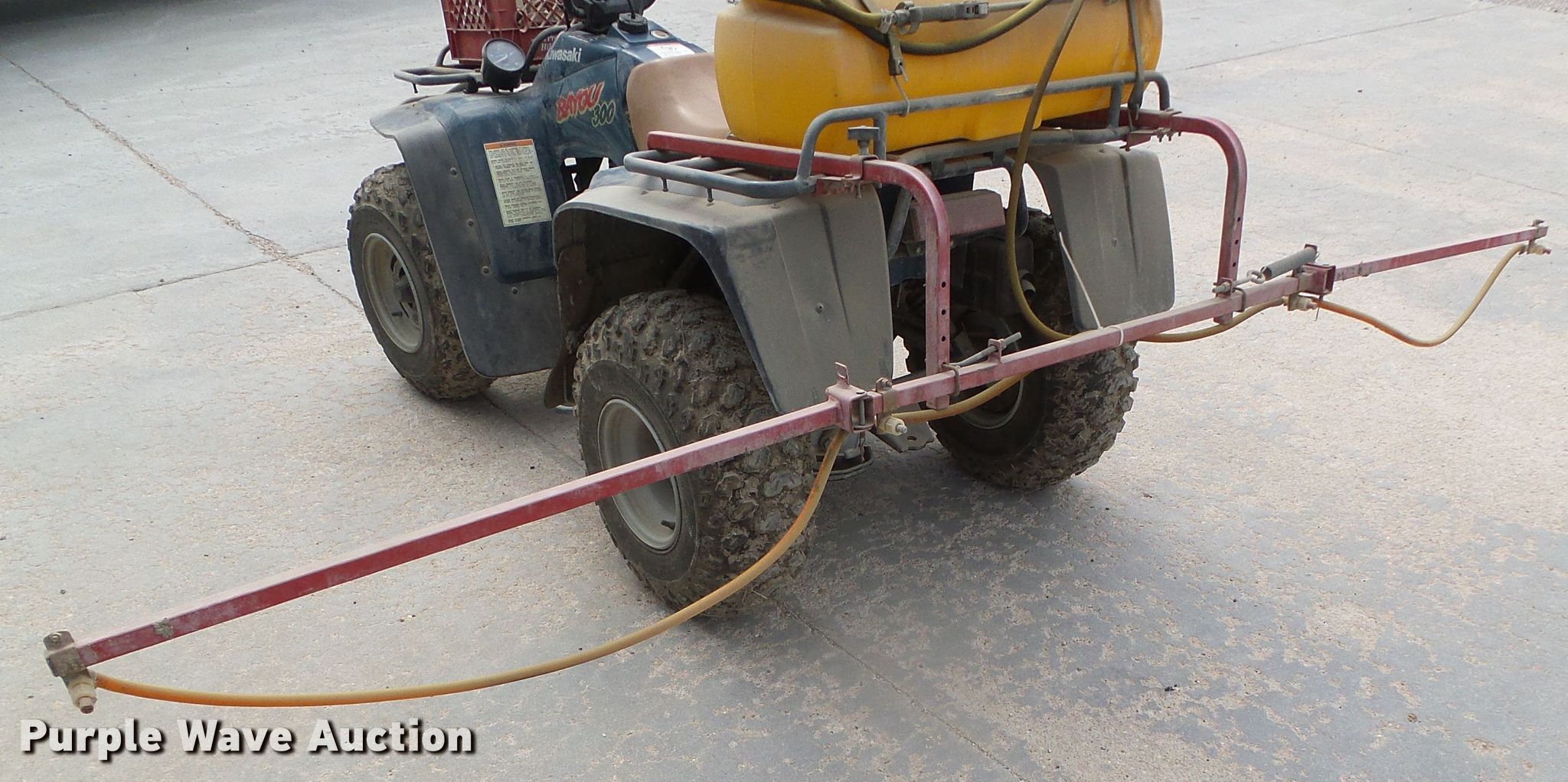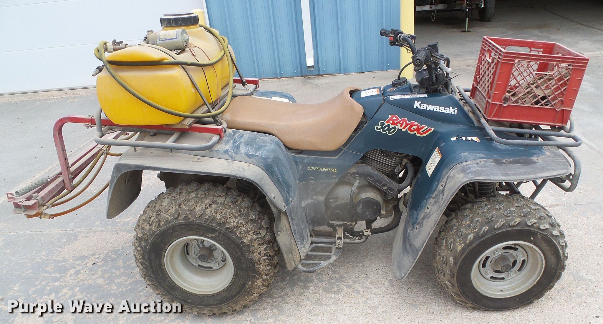 1997 Kawasaki Bayou 300 ATV. 887 miles on odometer. Engine Kawasaki, Cylinders: 1, Fuel type: Gas, Electric start, Recoil start. Transmission Manual, Speed: 5. Operational Sprayer Tank capacity: 14 gallons, Boom width: 10', Nozzle spacing: 40". Tires Front: AT22X9-10, Rear: AT24X11-10. Kansas non-highway title. JKALF8B17VB551273. City of Scott City, KS. 211 Kingsley St. Scott City, KS 67871