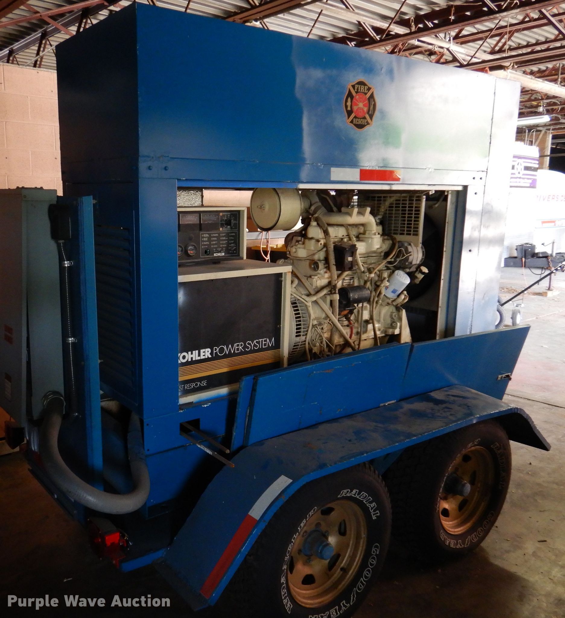 John Deere generator. 326 hours on meter, Serial: 296744. Engine John Deere, Serial: T04039T373051, Cylinders: 4, Fuel type: Diesel. Operational Generator Kohler 50R0ZJ71, kW: 15, Phase: Single, Electric start, Fuel tank, Trailer mounted. Trailer Shop built, Suspension: Spring, Axles: Tandem, Tire size: P235/75R15. Notes Unit is not road worthy, Lift pump issues, may need replaced, Unknown operating condition , Serial 296744. Transfer of ownership documentation will be a bill of sale. Riverside Fire Department. 2990 NW Vivion Rd. Riverside, MO 64150