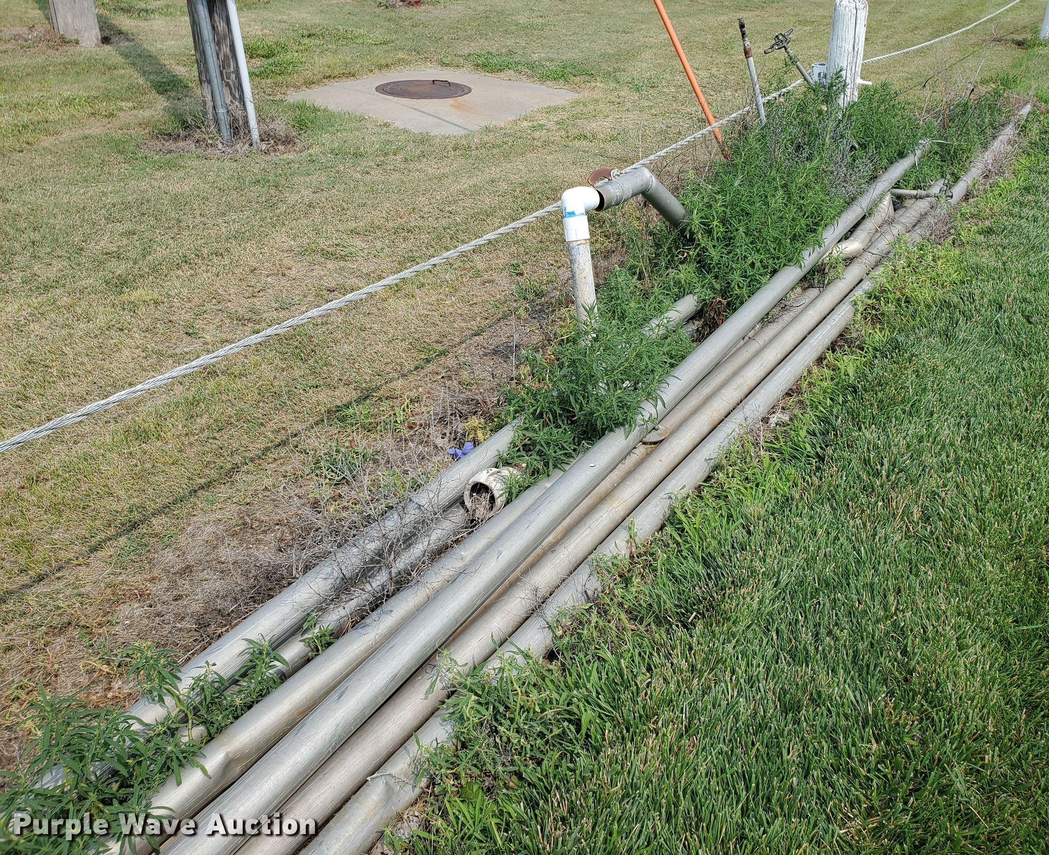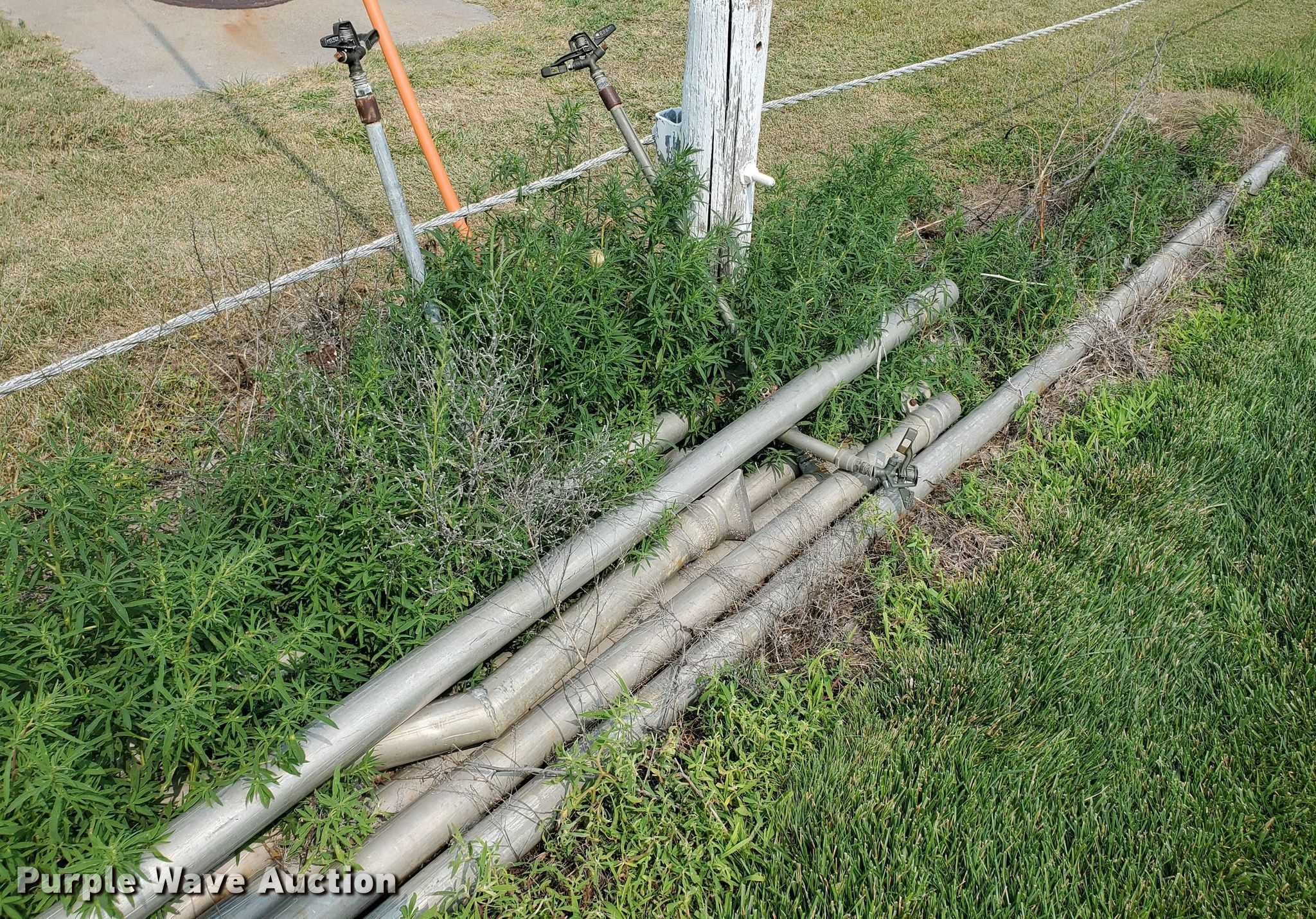 Purple Wave is selling a used Building Materials in Kansas. This item is a Approximately 40 sections of irrigation pipe with the following: 30' L x 3" D, Sprinkler heads, Elbows, Couplers