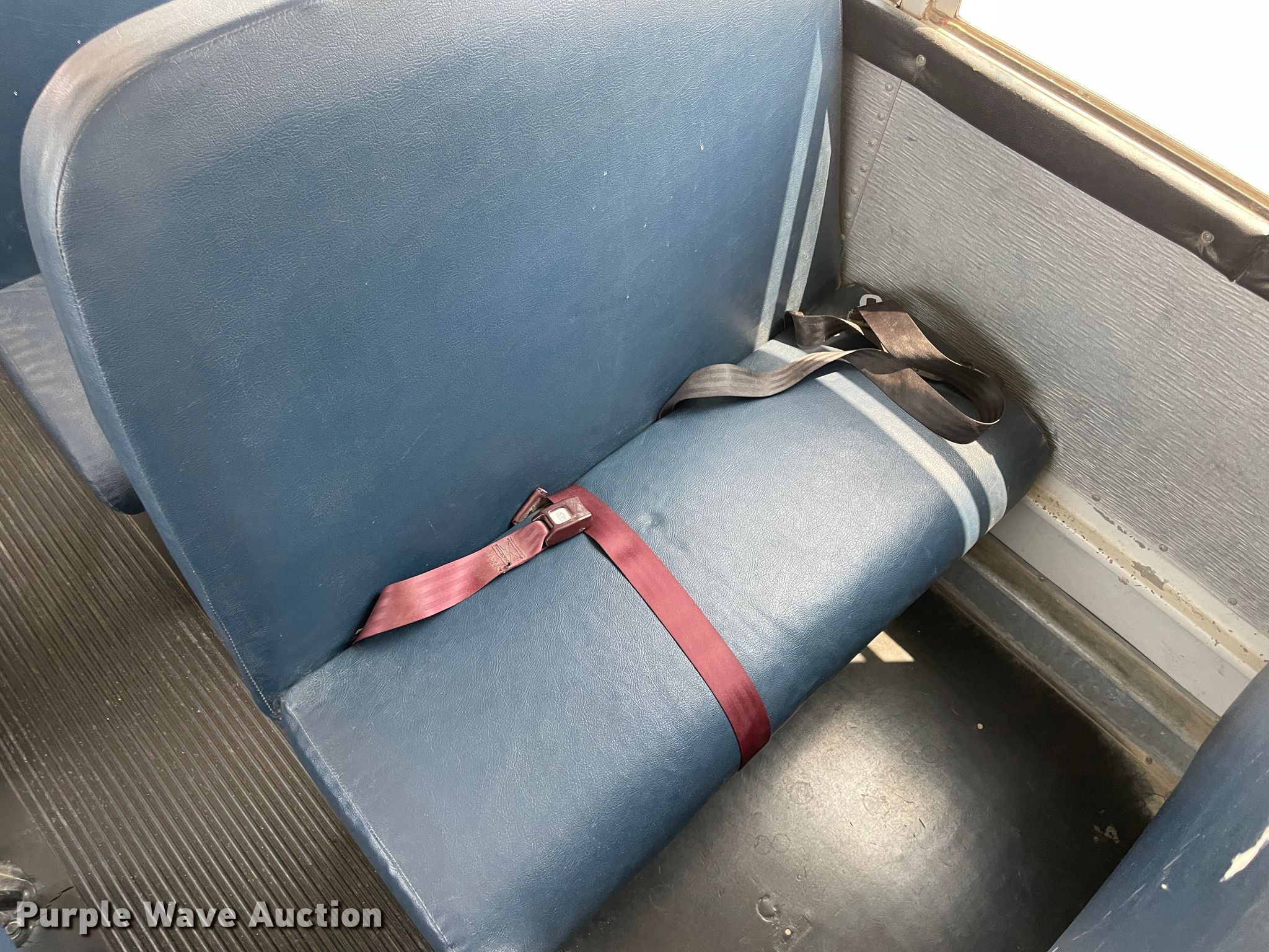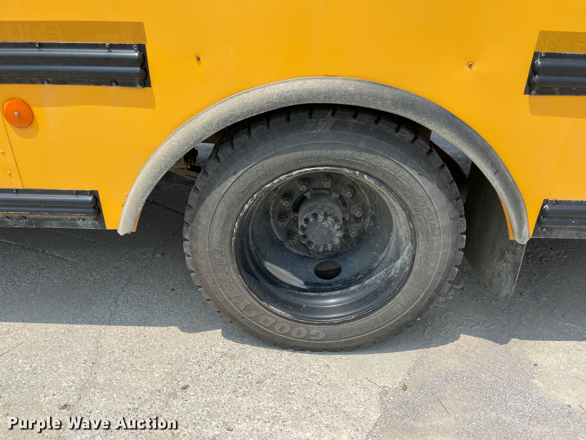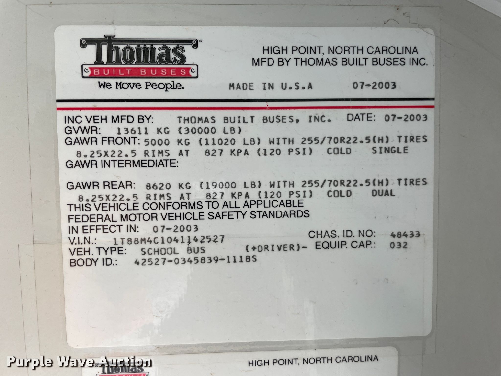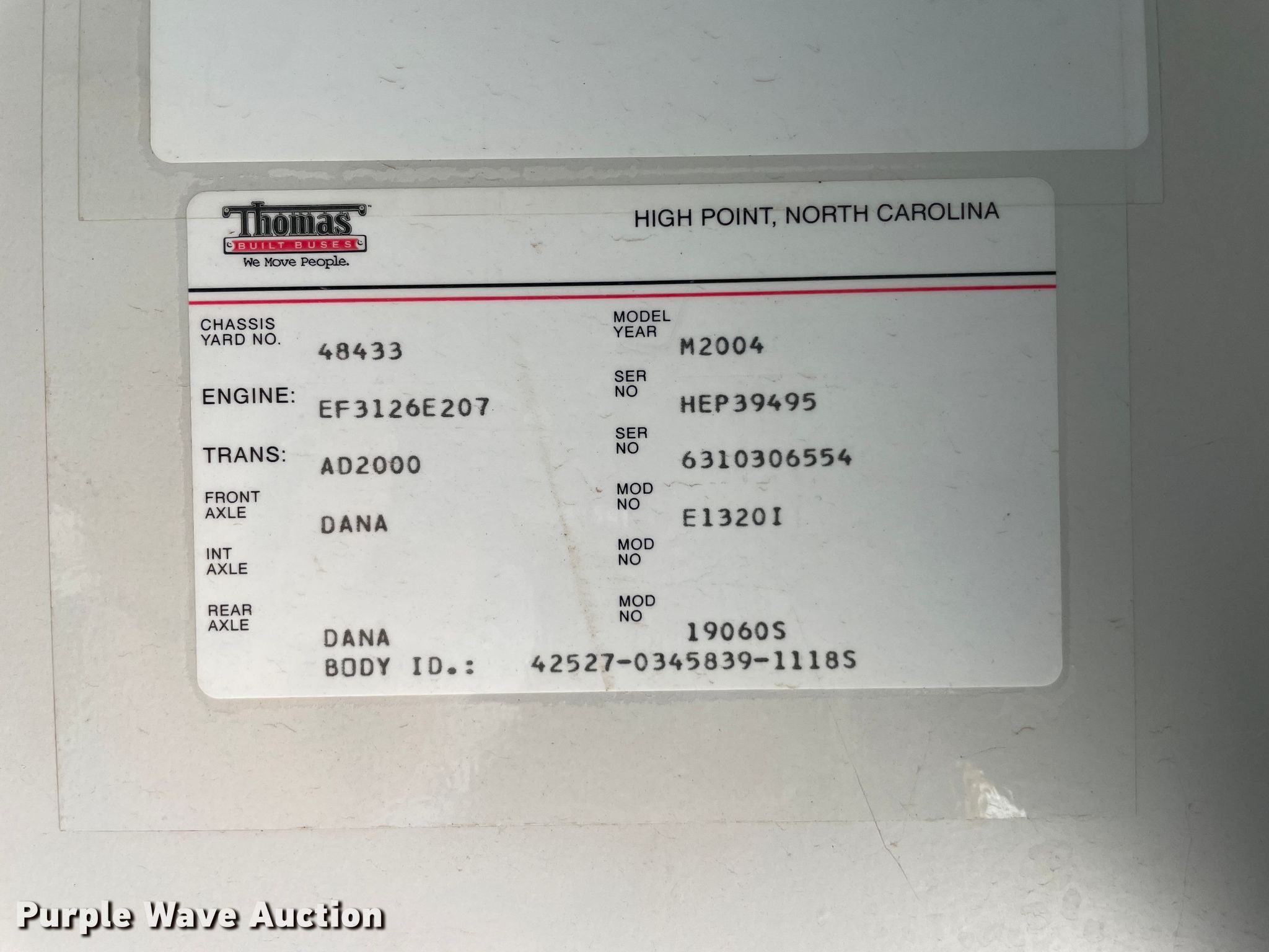 2004 Thomas school bus. 134,420 miles on odometer, Engine hours: 6,820. Engine Caterpillar 3126, Displacement: 7.2L, Cylinders: 6, Fuel type: Diesel. Transmission Automatic. Chassis Axles: Single, Suspension: Spring, Brakes: Hydraulic, GVWR: 30,000 lbs. Interior AC, Heat, Heated mirrors, Cruise control, Auxiliary controls, Passengers: 45, Seats Child safety seats: 8, Adult seats: 15, Wheelchair lift. Tires Size: 255/70R22.5. Notes Windshield chipped or cracked. Kansas title. 1T88M4C1041142527. 150 Apico Way. Girard, KS 66743