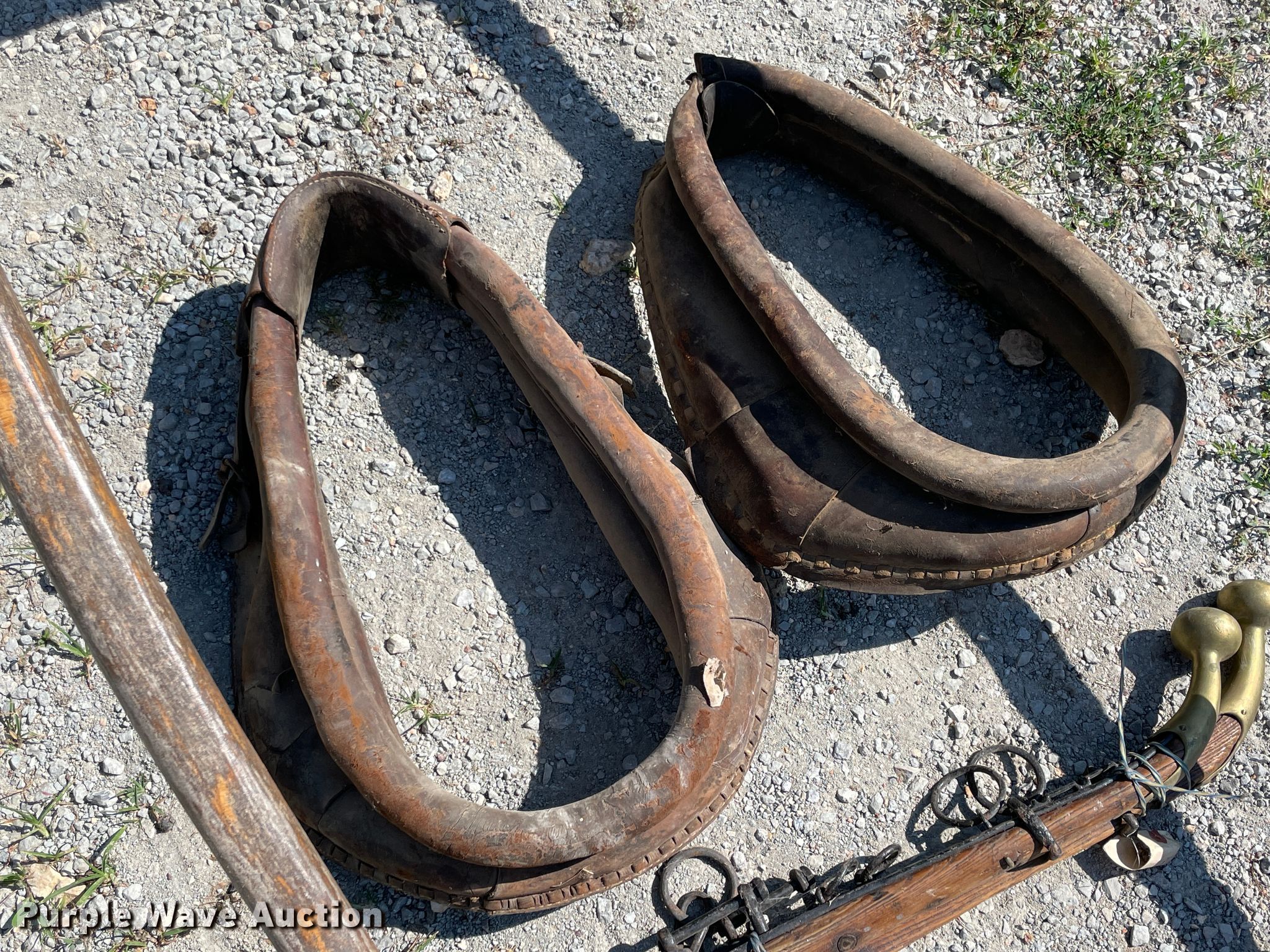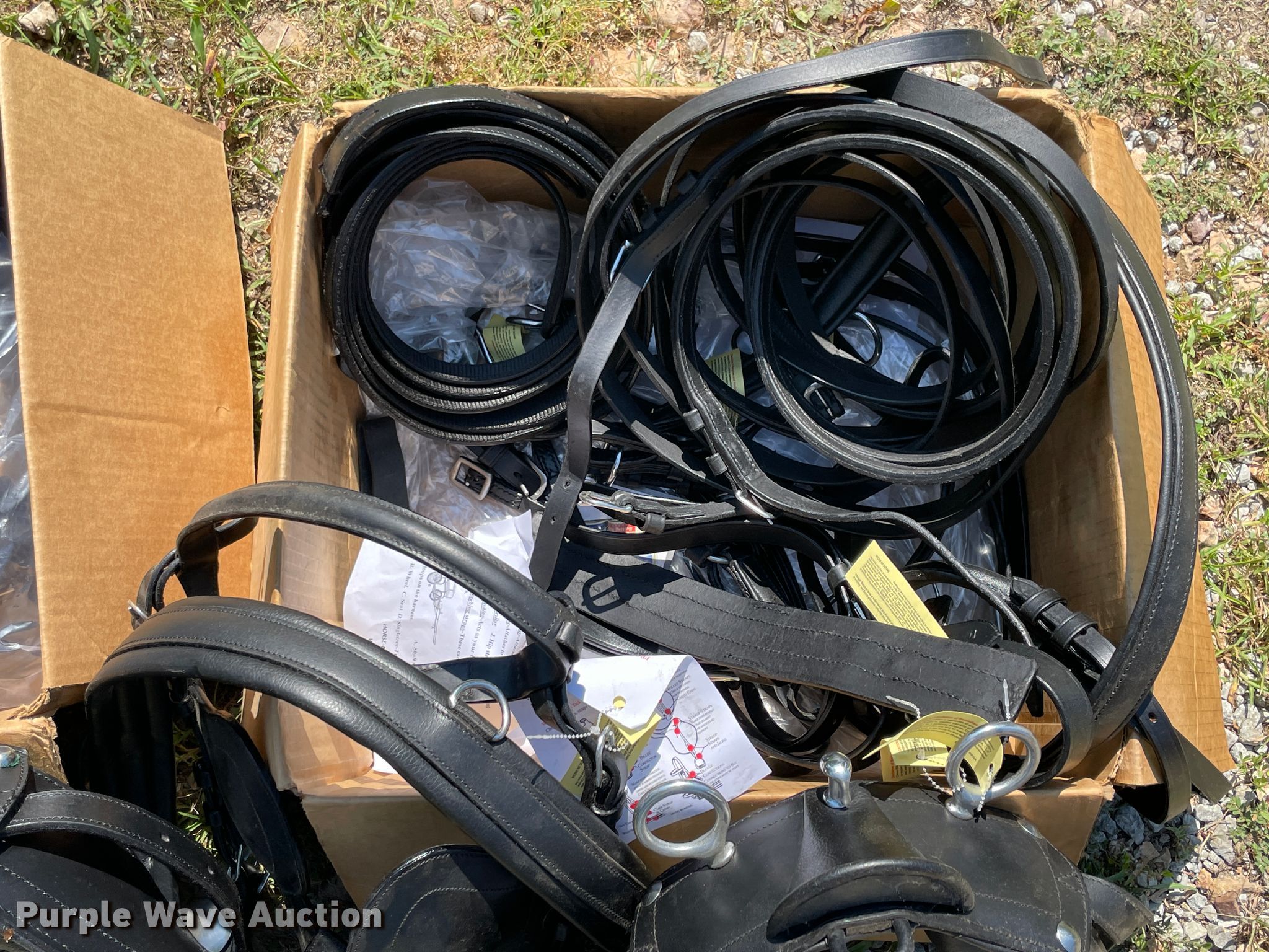 Purple Wave is selling a used Livestock Equip. in Oklahoma. This item is a Horse carriage with the following: Harnesses, Reins, Braces, Straps