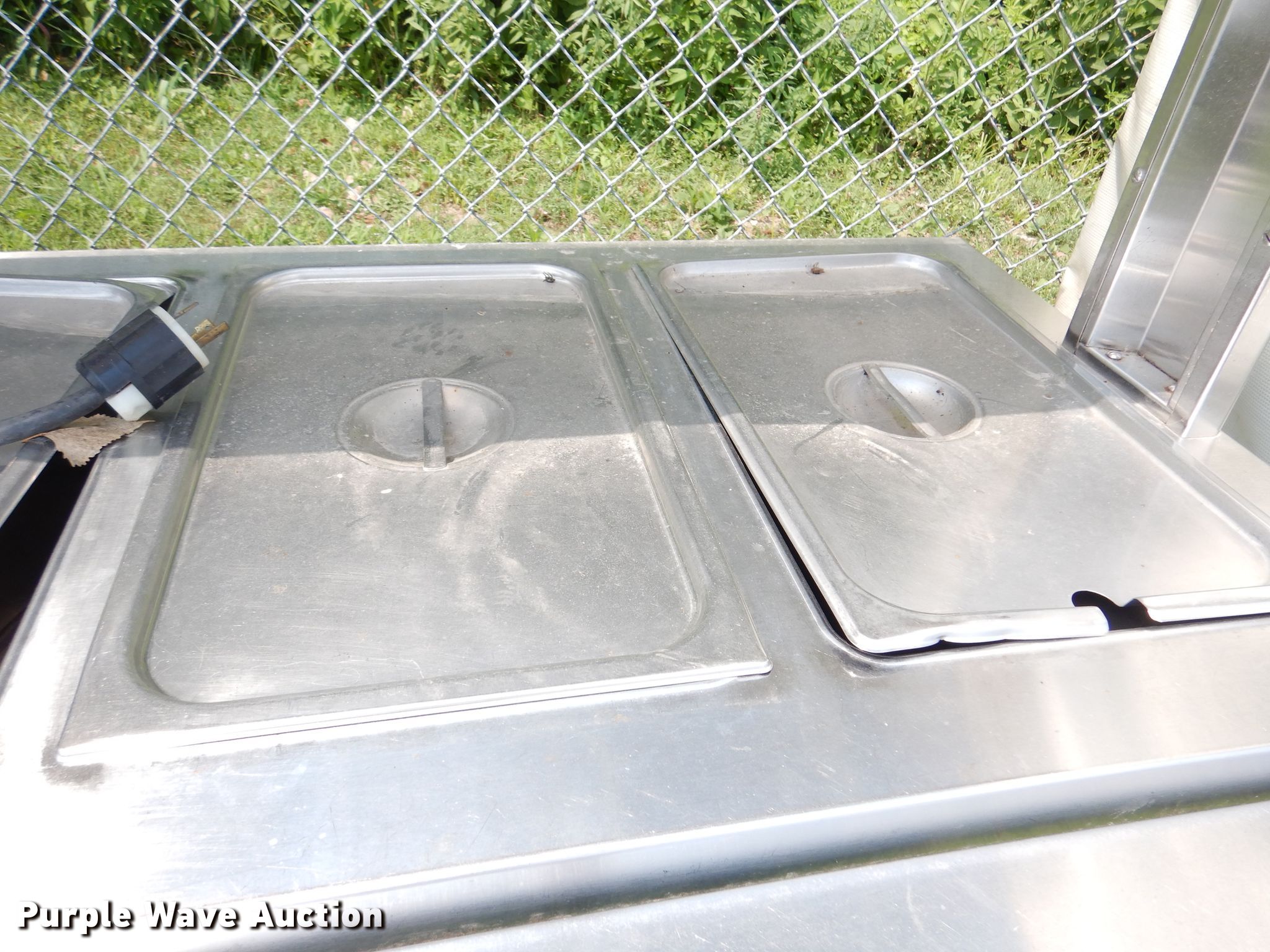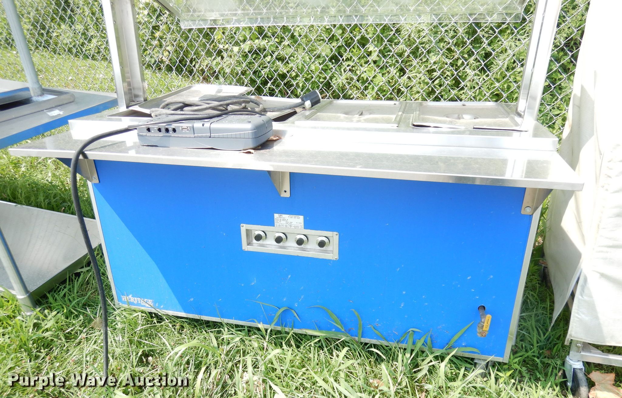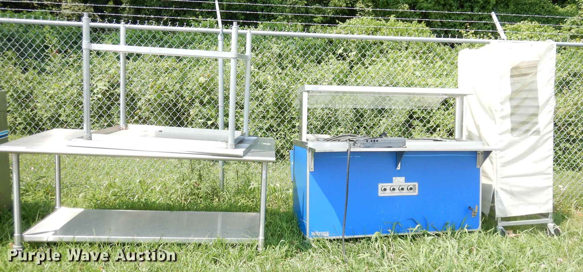 Purple Wave is selling a used Restaurant Equip. in Kansas. This item is a Kitchen equipment with the following: (2) 4' x 6' tables, Stainless steel construction, Four well serving station, Storage rack